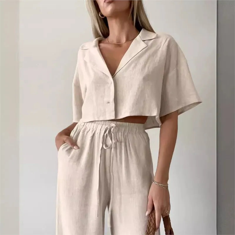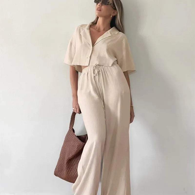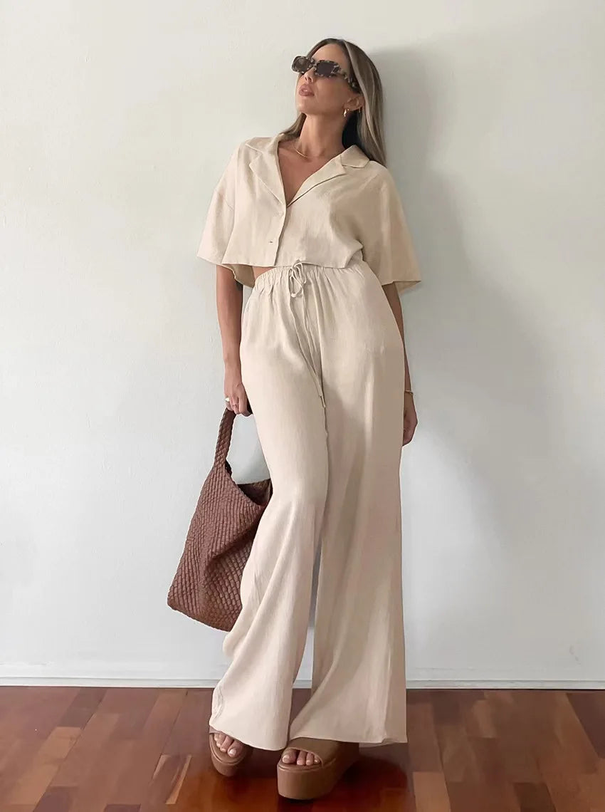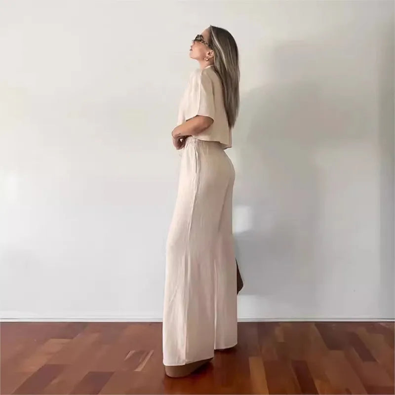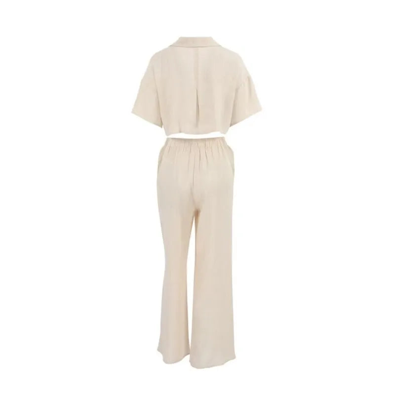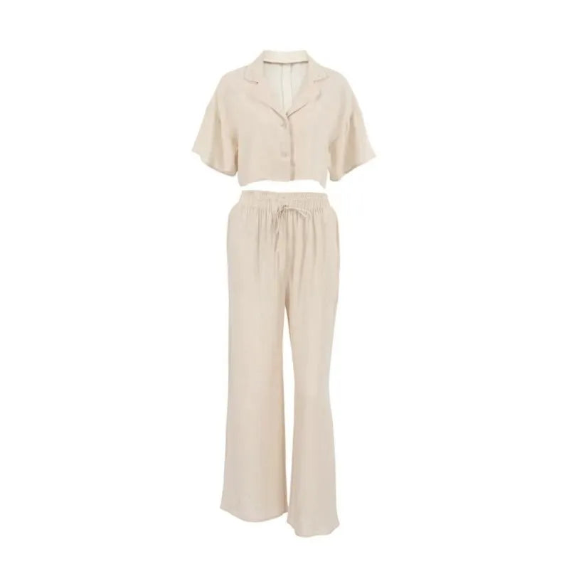 هذا الملبس المصمم بأسلوب عصري يجمع بين الأناقة والراحة. يأتي بلون بيج فاتح، مع بلوزة قصيرة وأكمام واسعة تمنحك لمسة من الانتعاش. السروال الواسع يجعله مثاليًا لأيام الصيف والمناسبات غير الرسمية. التصميم العملي يتيح سهولة الحركة، بينما تضيف التفاصيل الدقيقة مثل حزام الخصر لمسة أنثوية. يمكن تنسيقه مع حذاء رياضي أو صنادل للحصول على إطلالة مريحة وعصرية تناسب الخروجات اليومية أو لقاءات الأصدقاء.