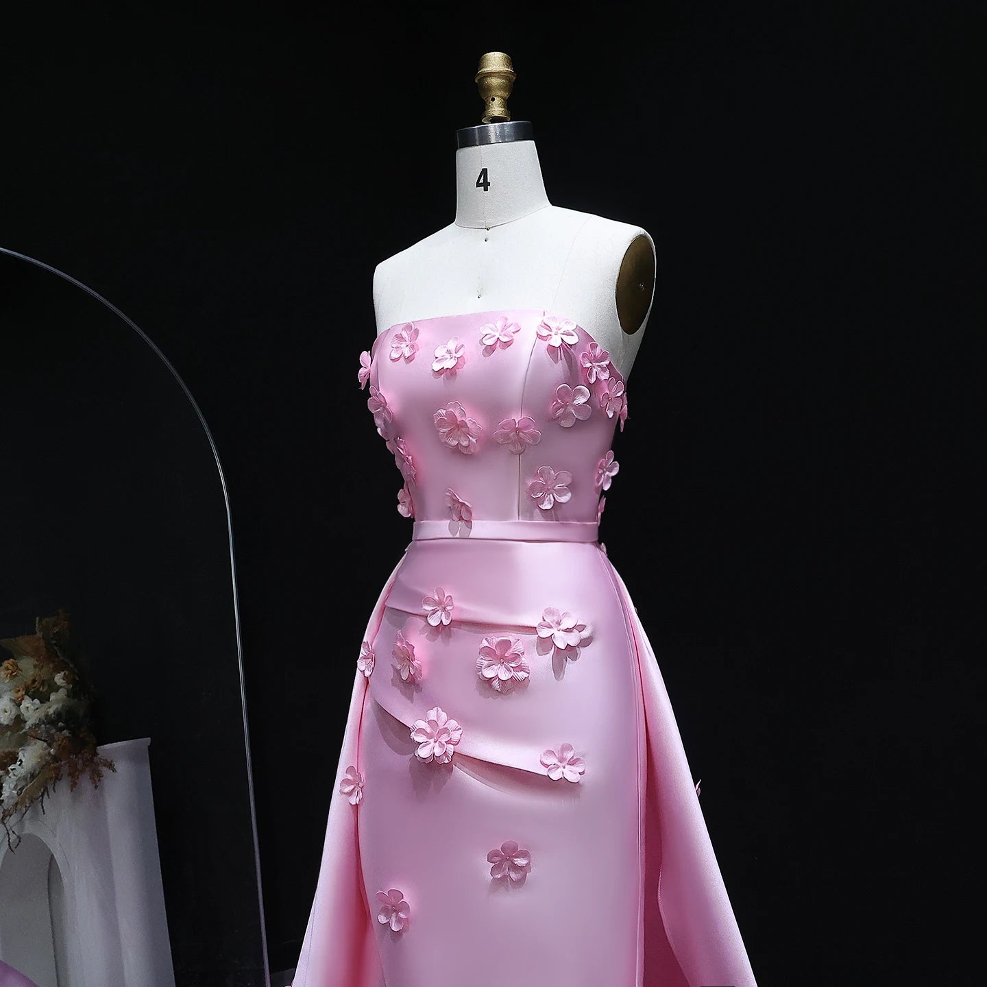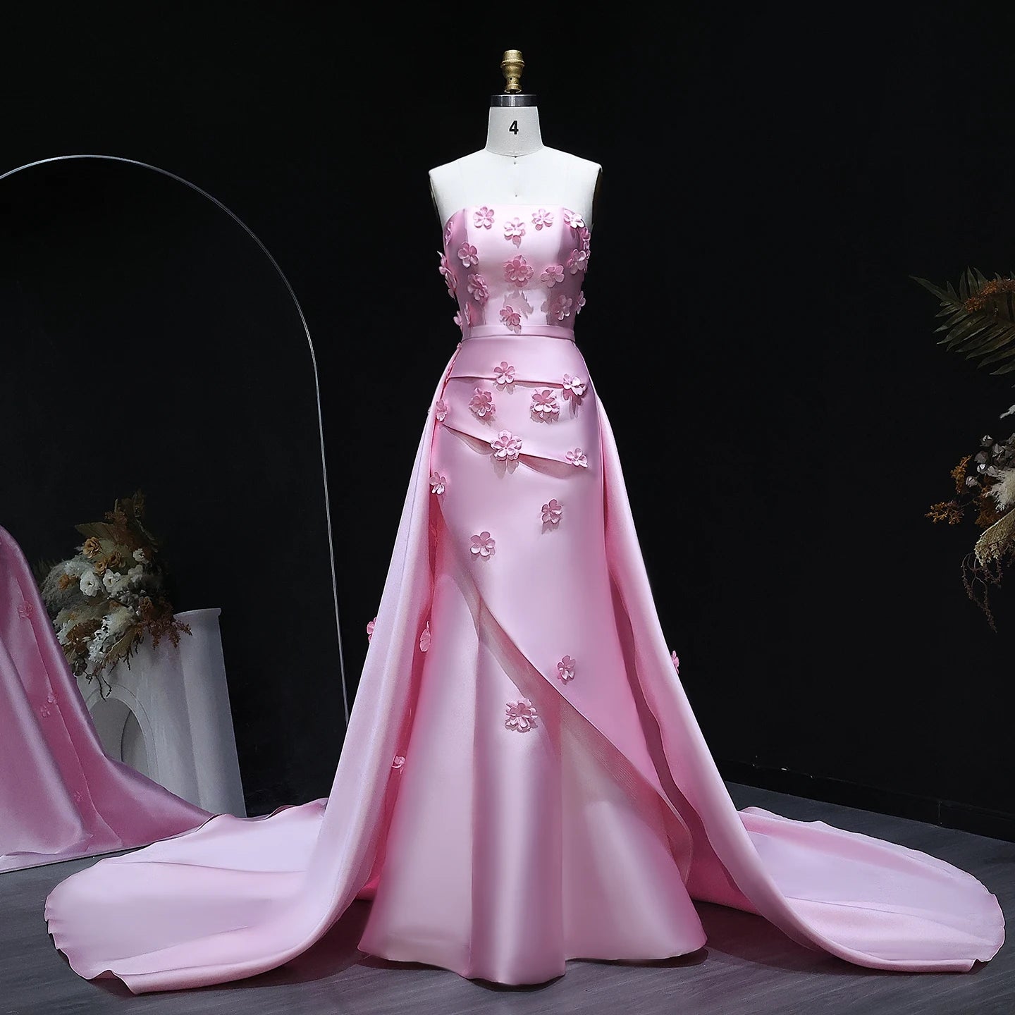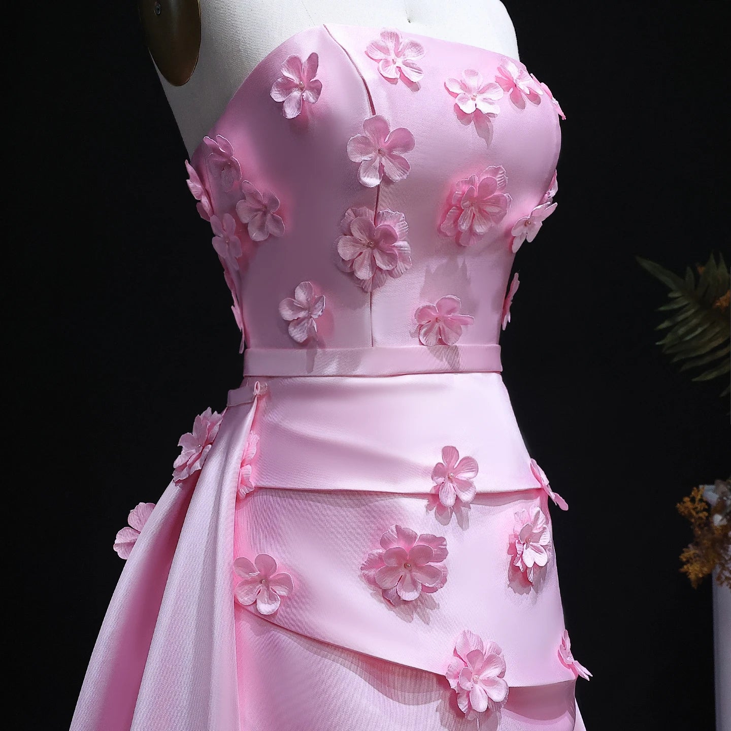 فستان سهرة وردي ناعم يتميز بتصميم ملكي فاخر ولمسات أنثوية جذابة. يأتي بقصة ضيقة من الأعلى تكشف الأكتاف وتبرز جمال القوام، بينما تنسدل التنورة بقصة واسعة وذيل طويل يضفي فخامة ملكية آسرة. يزدان الفستان بالكامل بتطريزات زهرية ثلاثية الأبعاد متناسقة تضيف له بعدًا فنيًا أنيقًا وإطلالة ساحرة.