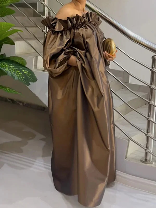 Off-Shoulder Brown Puff Sleeve Dress