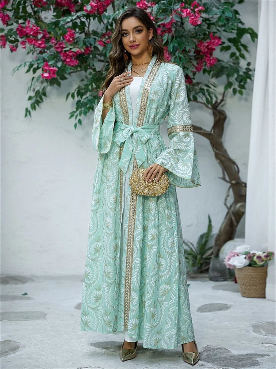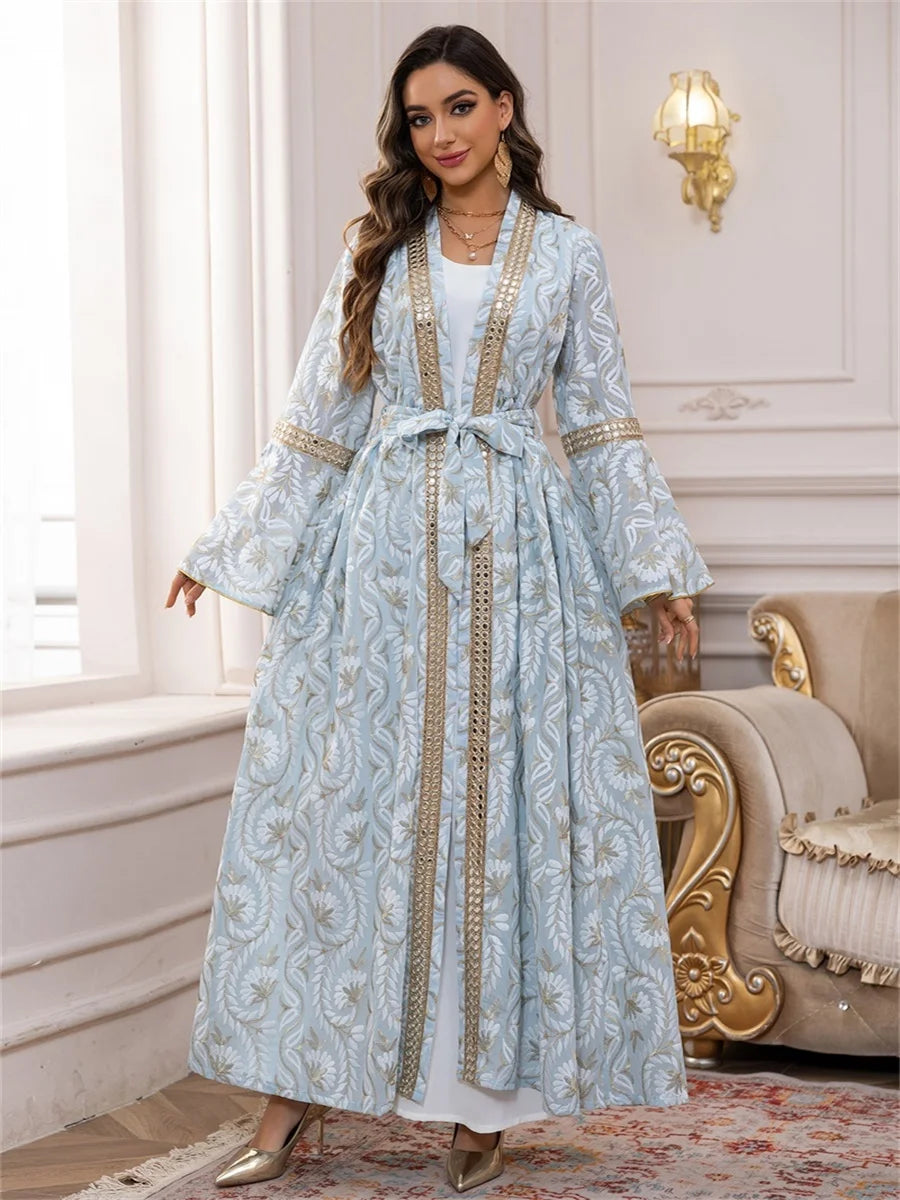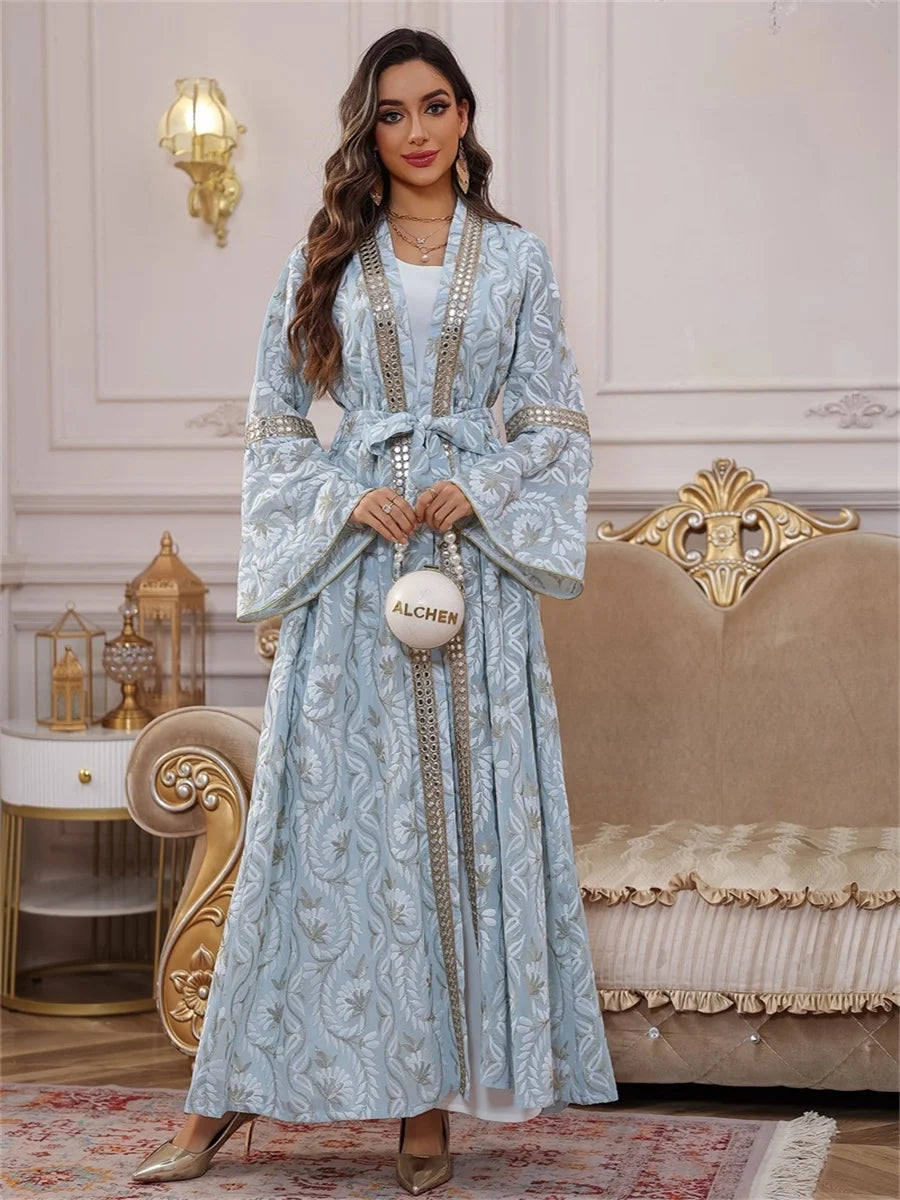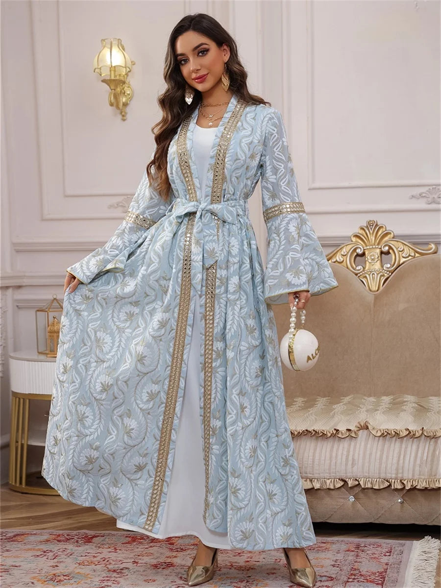 تتميز هذه الجلابية الفاخرة بألوانها الفاتحه التي تضفي لمسة من الأناقة والرقي. مصممة بتفاصيل دقيقة من التطريز الذهبي، تمنح الجلابية طابعاً مميزاً ولفتة أنظار. الأكمام الواسعة تضفي لمسة من العصرية، بينما يأتي الحزام ليبرز الخصر ويعزز من جمال القوام. تُعتبر هذه الجلابية خياراً مثالياً للمناسبات الرسمية أو الاحتفالات، حيث تجمع بين التقليدية والحداثة