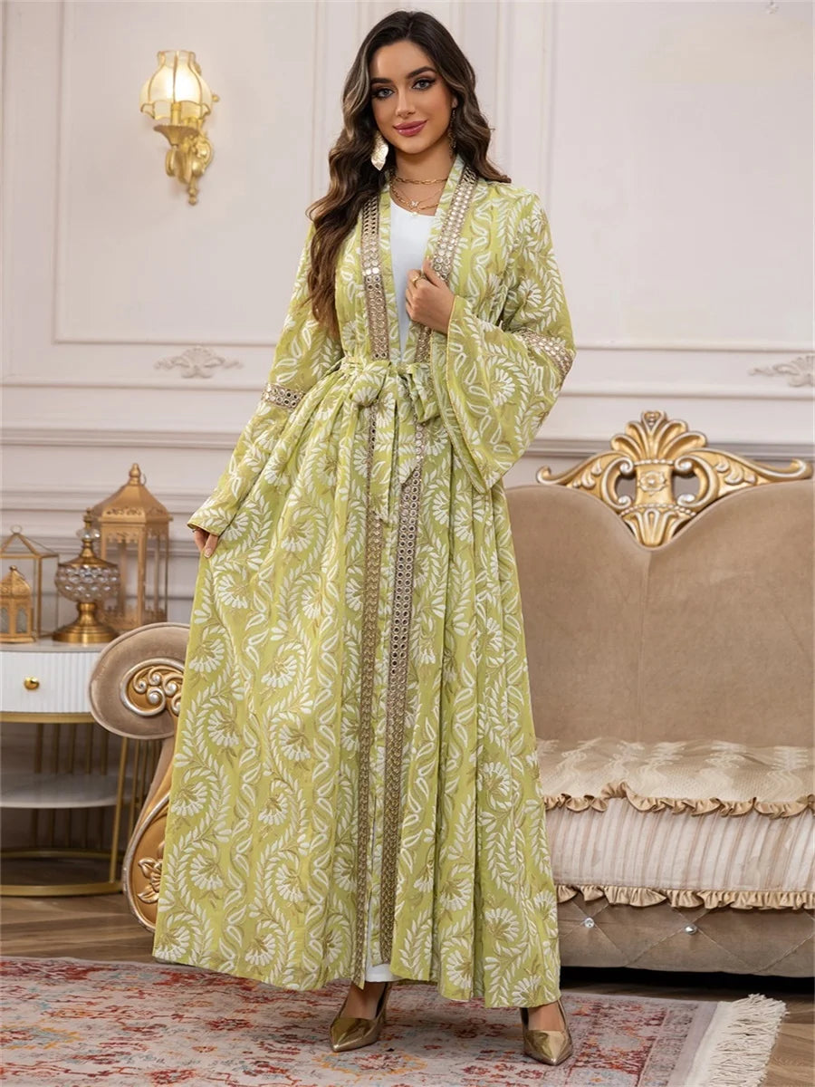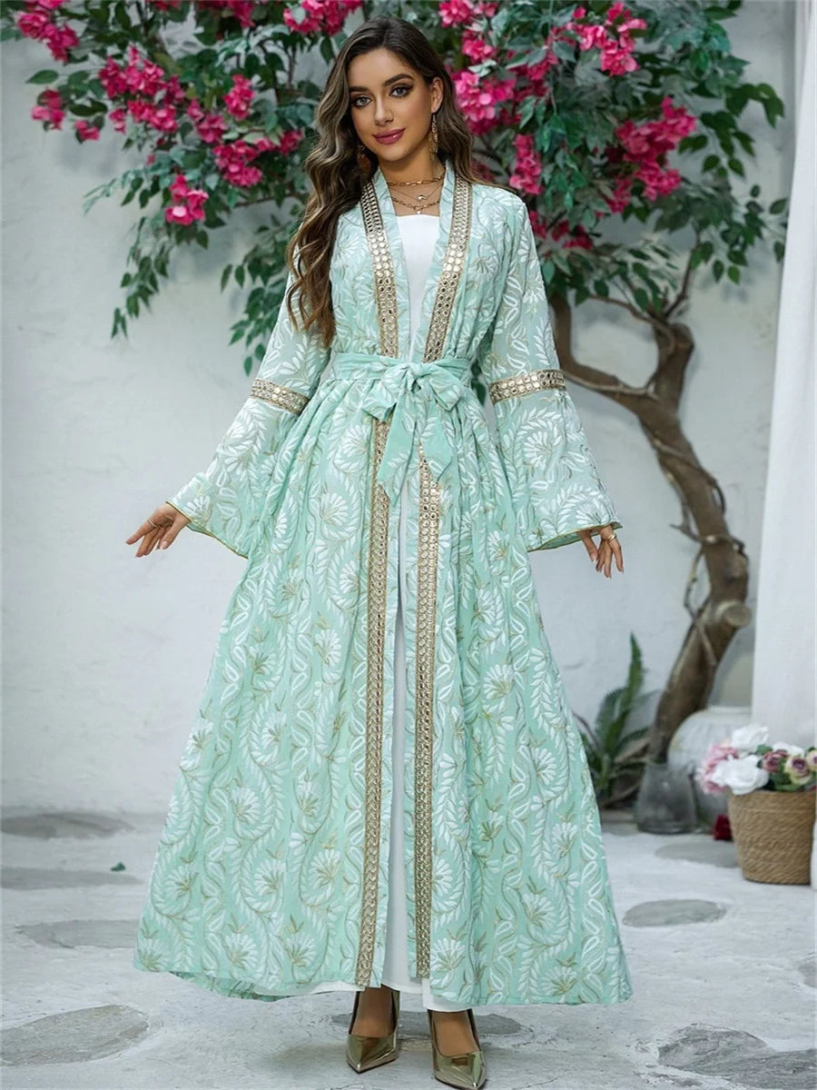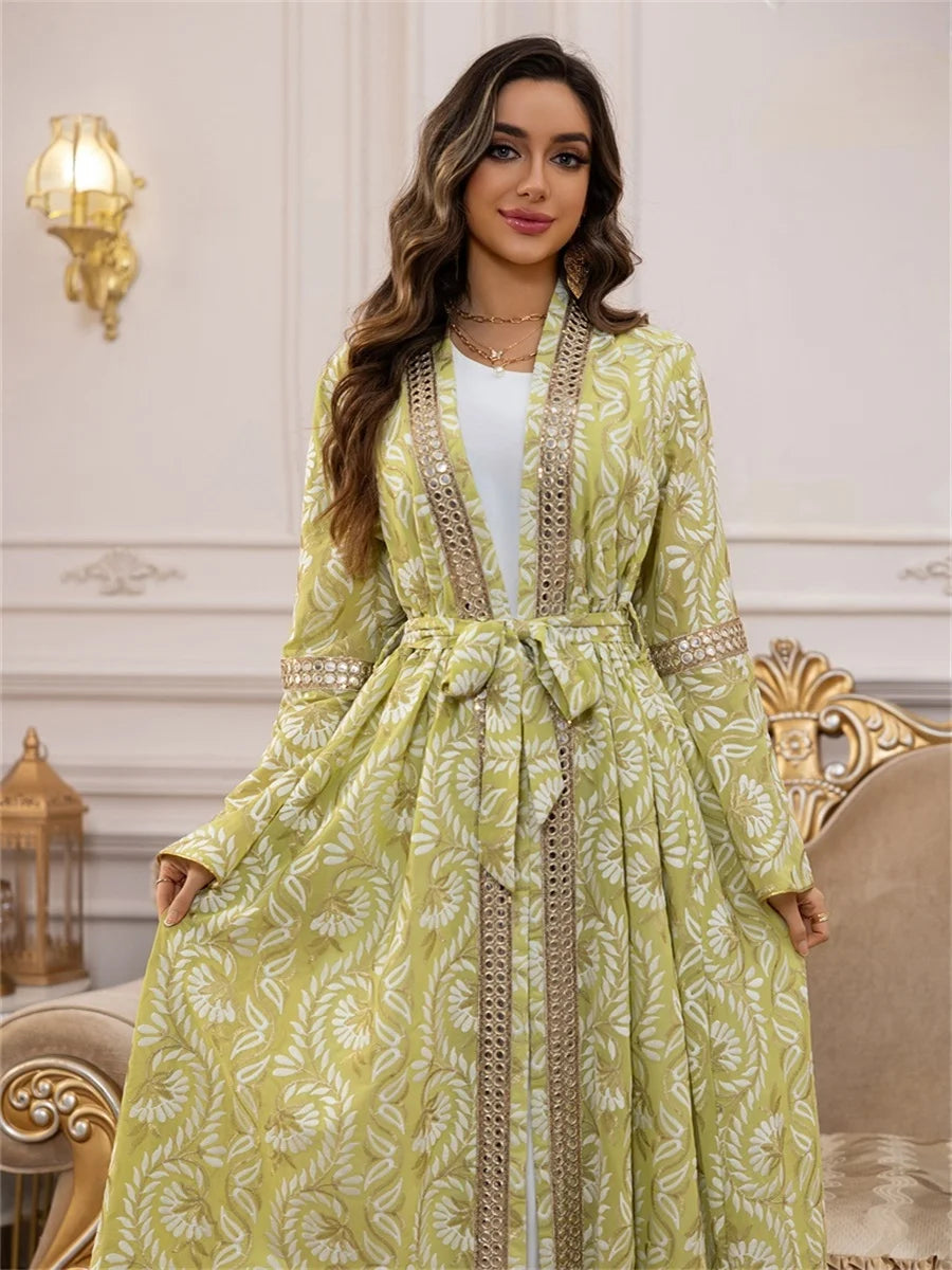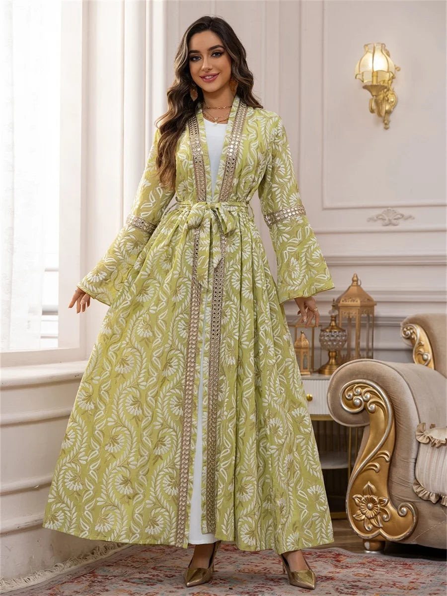 تتميز هذه الجلابية الفاخرة بألوانها الفاتحه التي تضفي لمسة من الأناقة والرقي. مصممة بتفاصيل دقيقة من التطريز الذهبي، تمنح الجلابية طابعاً مميزاً ولفتة أنظار. الأكمام الواسعة تضفي لمسة من العصرية، بينما يأتي الحزام ليبرز الخصر ويعزز من جمال القوام. تُعتبر هذه الجلابية خياراً مثالياً للمناسبات الرسمية أو الاحتفالات، حيث تجمع بين التقليدية والحداثة