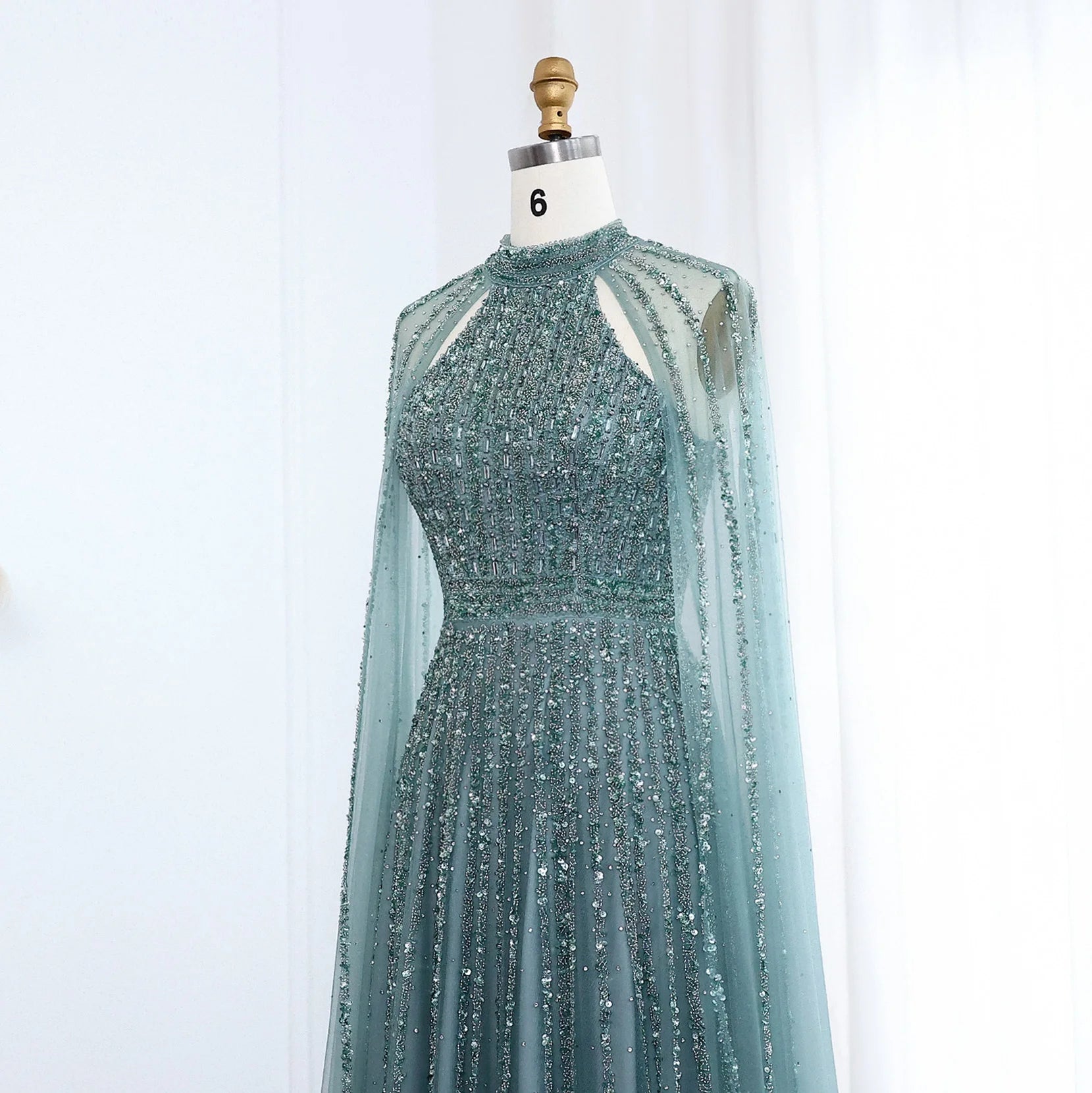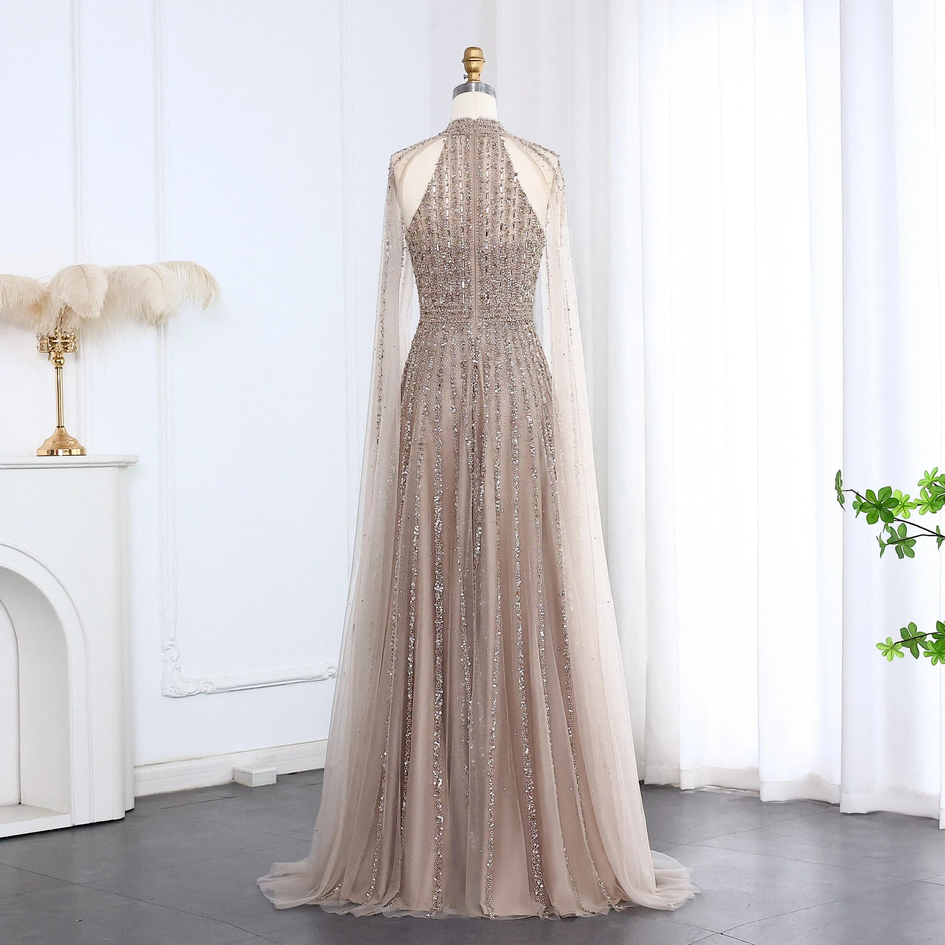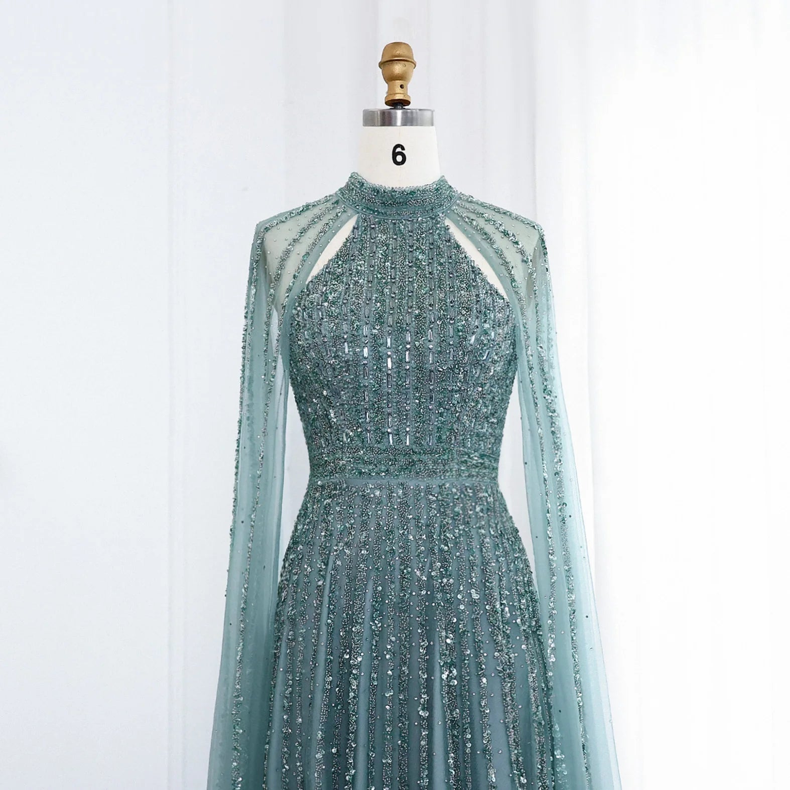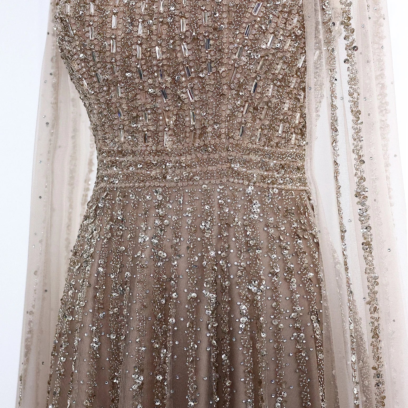 تطريزات لامعة دقيقة مع قصة علوية أنيقة وأكمام شفافة تضيف عمقًا بصريًا وفخامة واضحة للتصميم.
