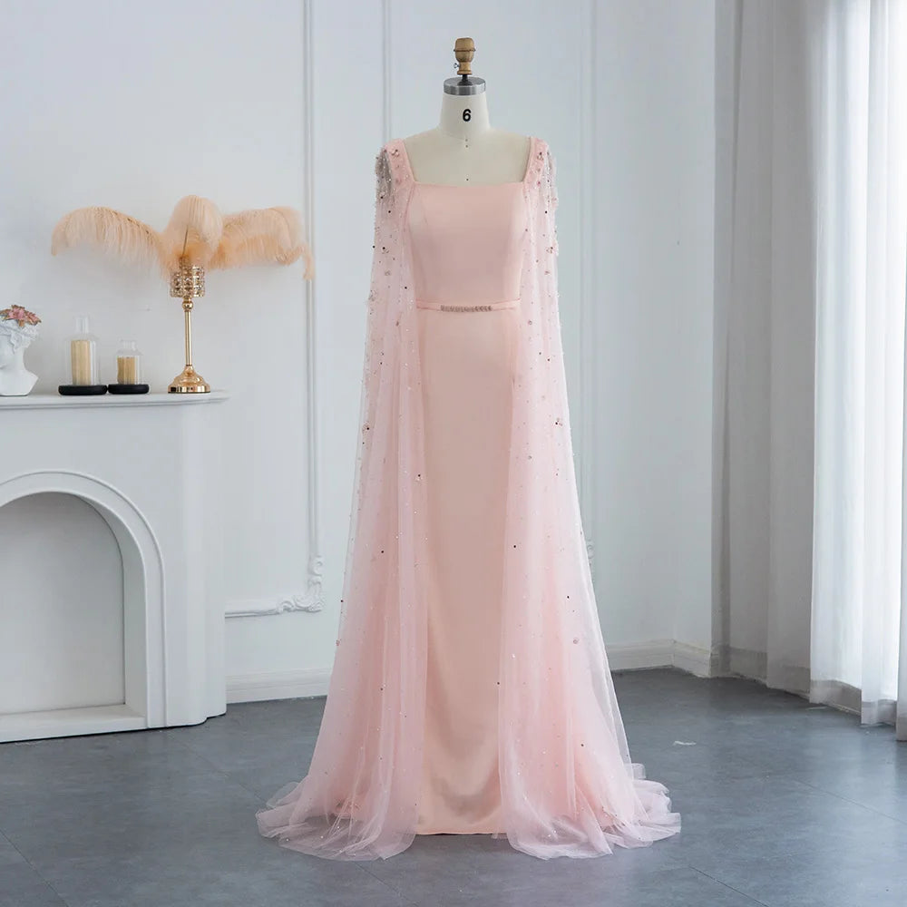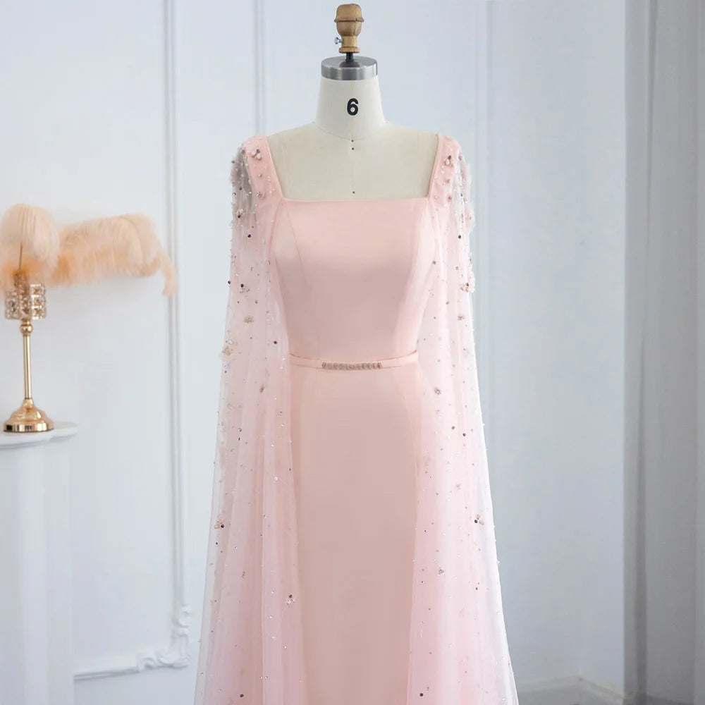 الوصف العام: فستان راقٍ بلون وردي هادئ يجمع بين البساطة الملكية والتفاصيل الراقية، بتصميم انسيابي ناعم يُضفي لمسة أنثوية ساحرة. يتميز بقصة ضيقة ناعمة عند الخصر مع كاب طويل من التول المطرز ينسدل برقيّ ليمنح الفستان حضورًا خياليًا لا يُنسى.