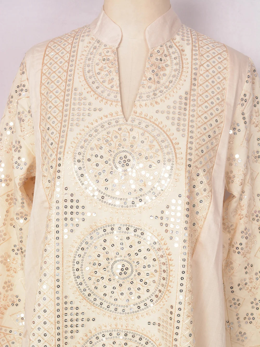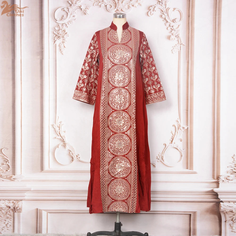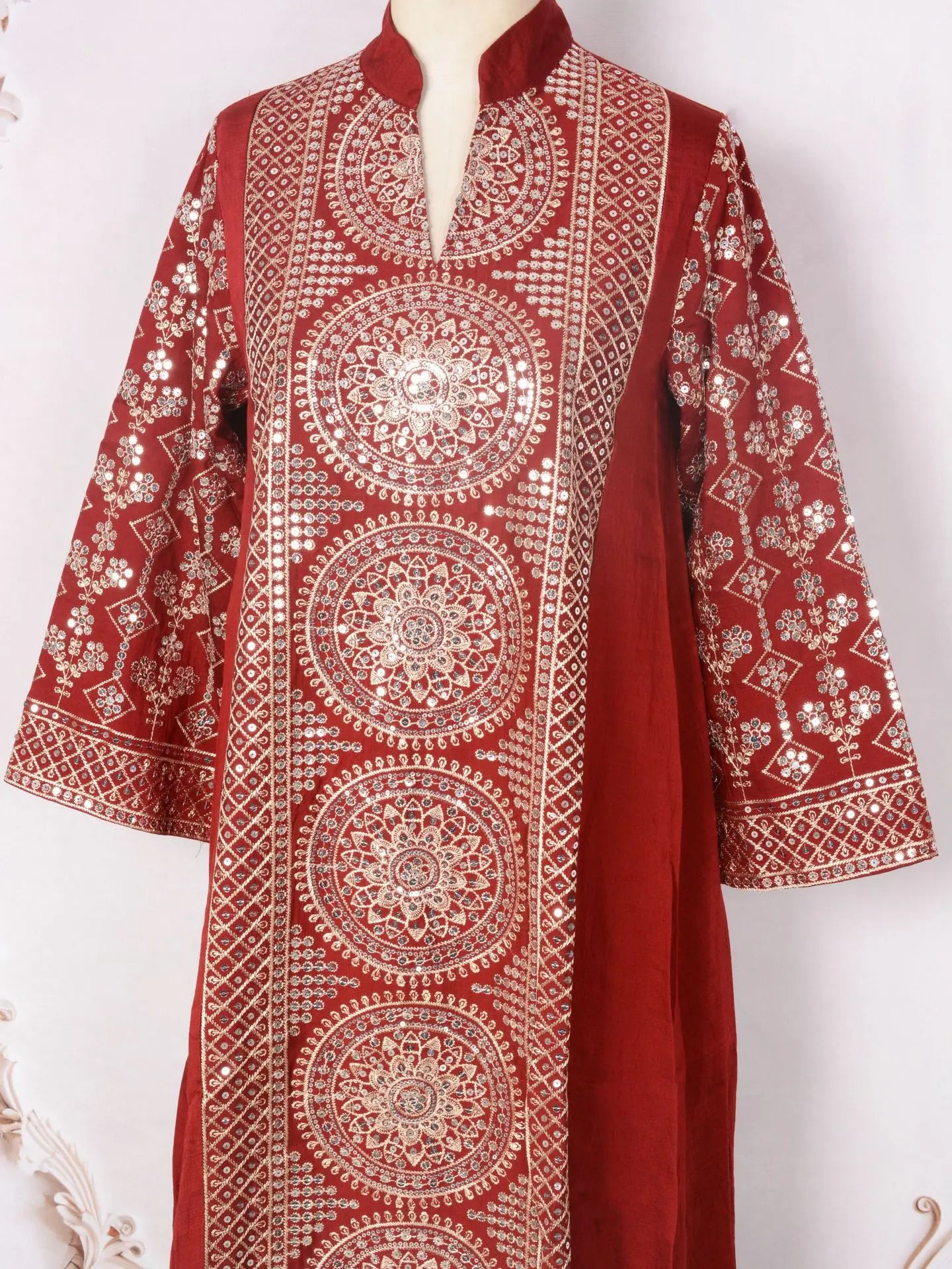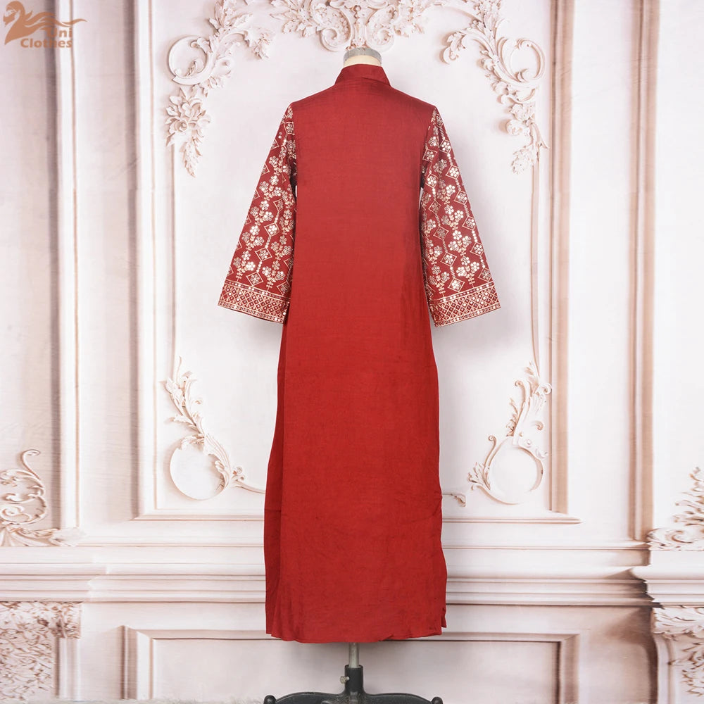 جلابية فاخرة باللون الخمري بتصميم تراثي أنيق يعكس روح الأصالة والفخامة. تتزين بتطريز يدوي فاخر باللون الذهبي يغطي مقدمة الجلابية بأشكال دائرية هندسية دقيقة، مع تفاصيل مطرزة رائعة على الأكمام تمنحها طابعًا ملكيًا. الياقة المرتفعة تضيف لمسة من الرقي، مع فتحة رقبة ناعمة تزيد من أنوثة الإطلالة.