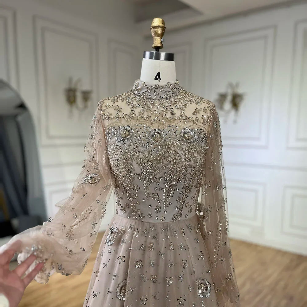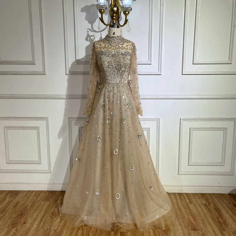 فستان أنيق مصنوع من قماش خفيف وشفاف، مزين بتفاصيل لامعة وقطع كريستال تلامس الأنوثة والجمال، مع تصميم راقي وأسلوب متناسق يبرز جمال المرأة بشكل فريد