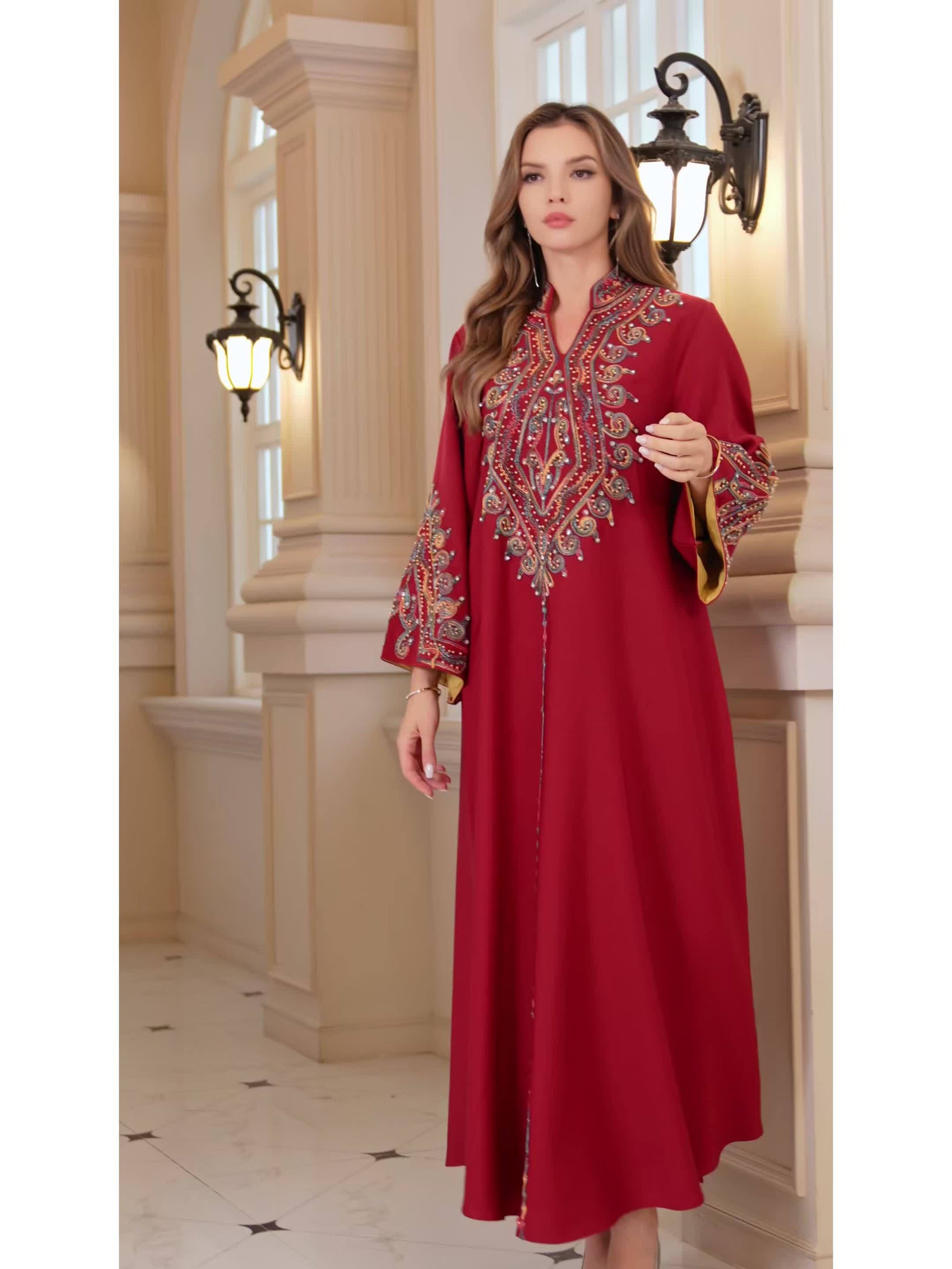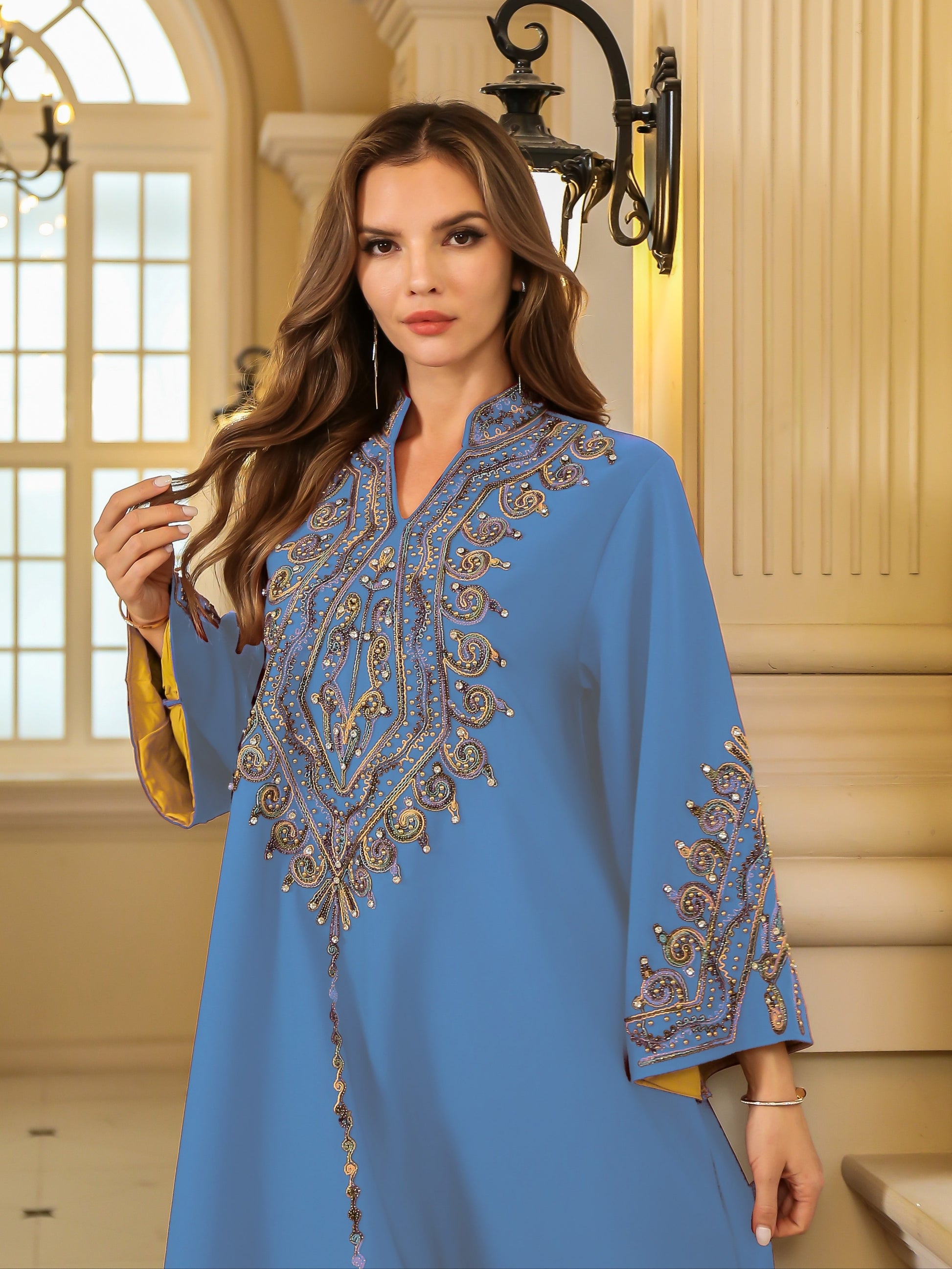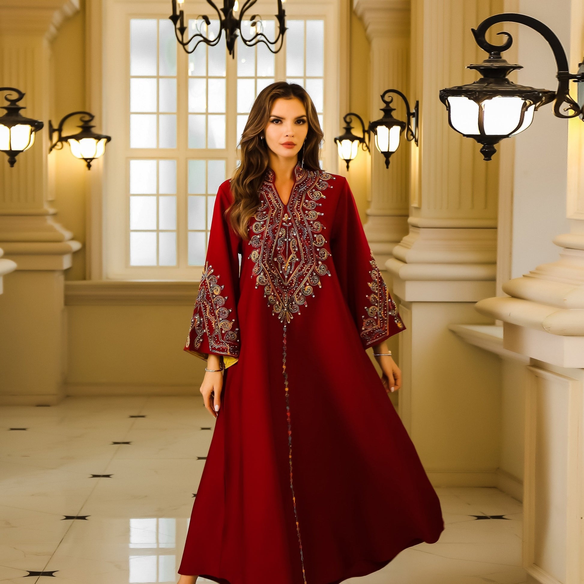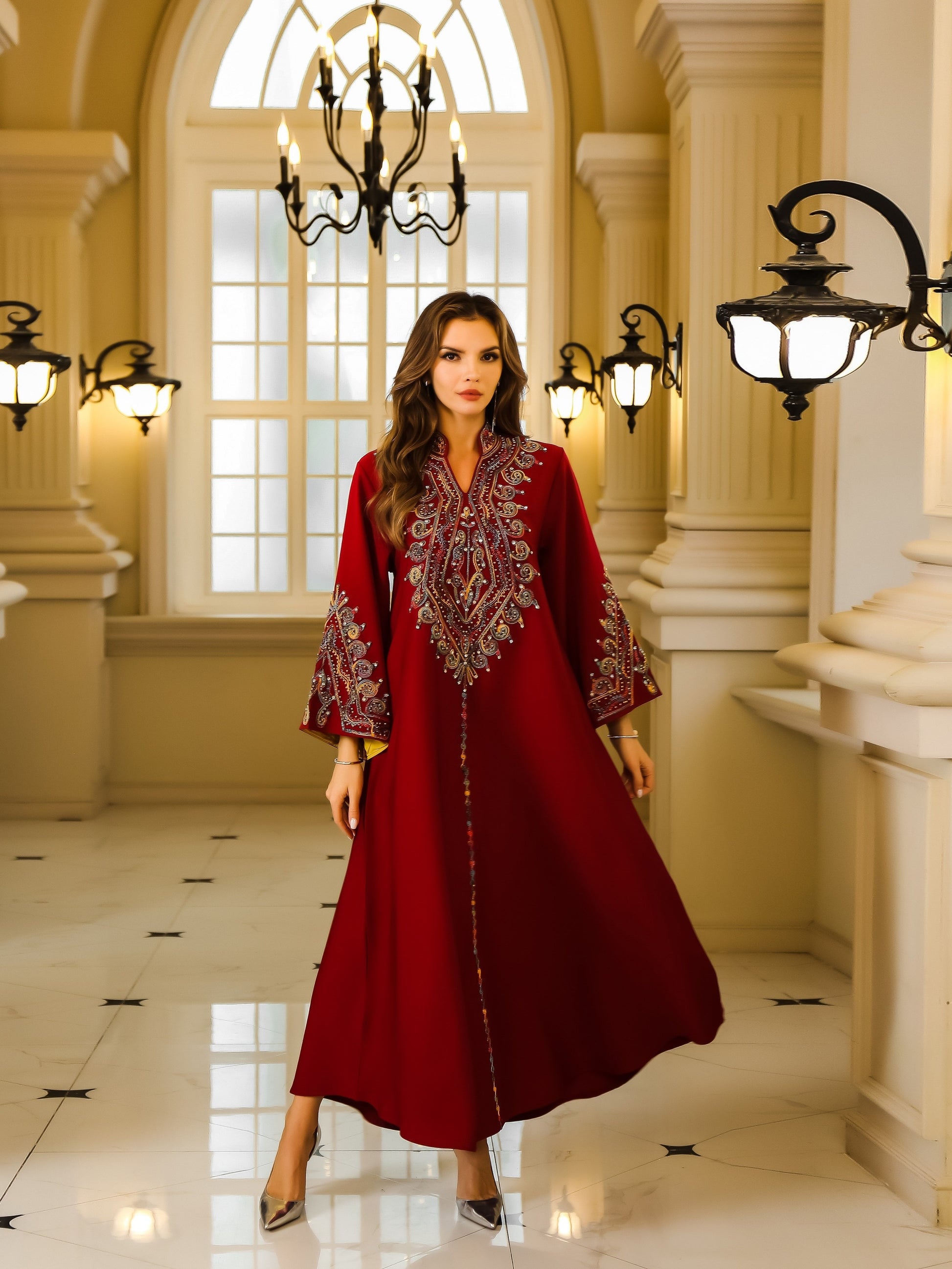 تطريز غني ومتقن بخيوط لامعة يزين الصدر والأكمام، ليمنح الجلابية طابعاً ملكياً فخماً.