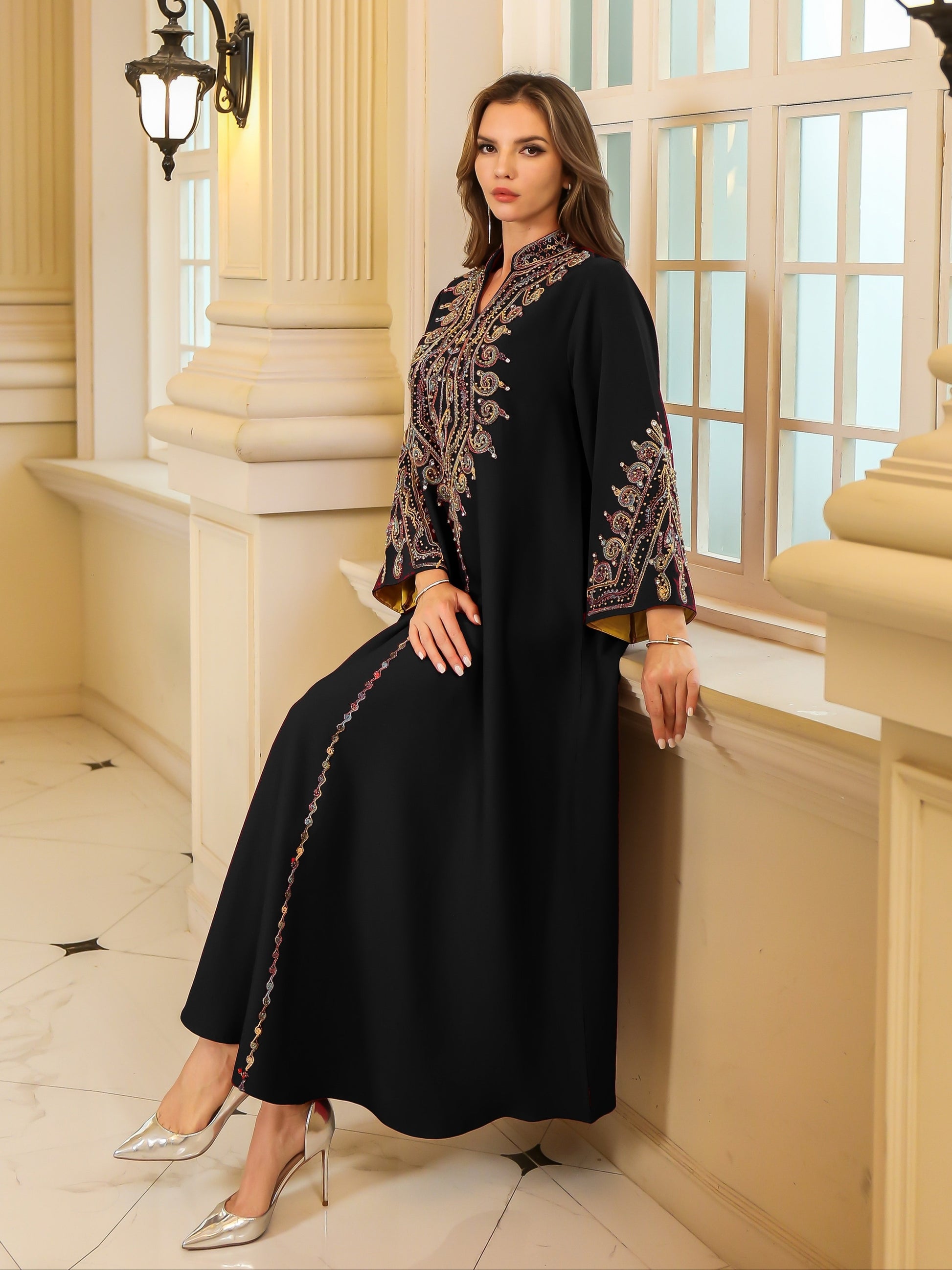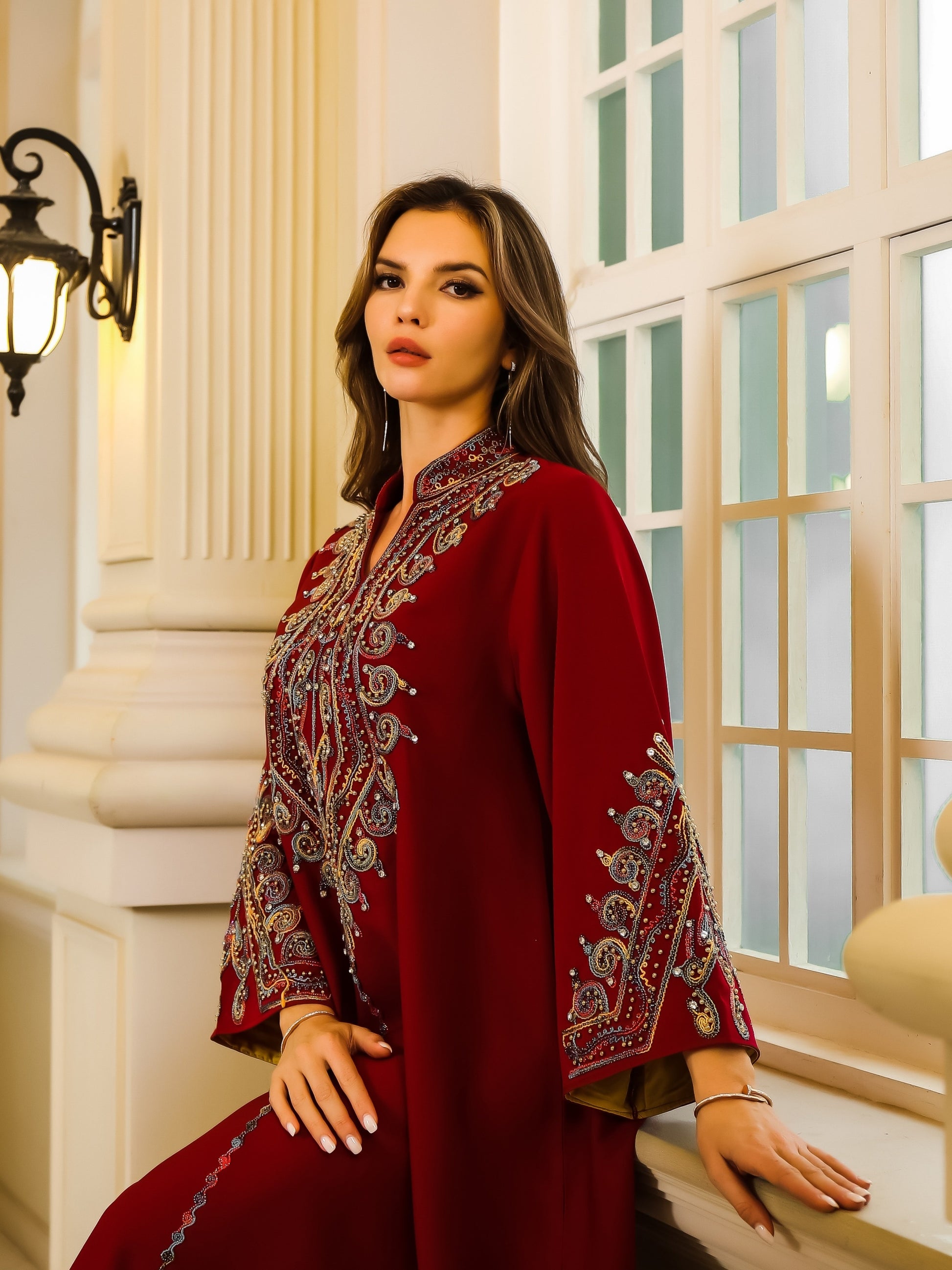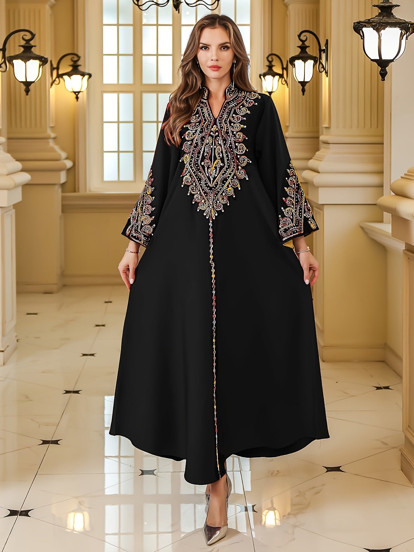 تطريز غني ومتقن بخيوط لامعة يزين الصدر والأكمام، ليمنح الجلابية طابعاً ملكياً فخماً.