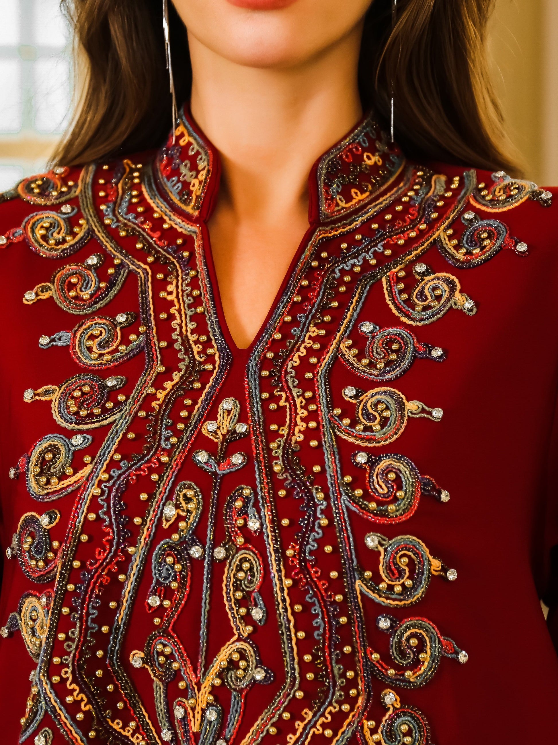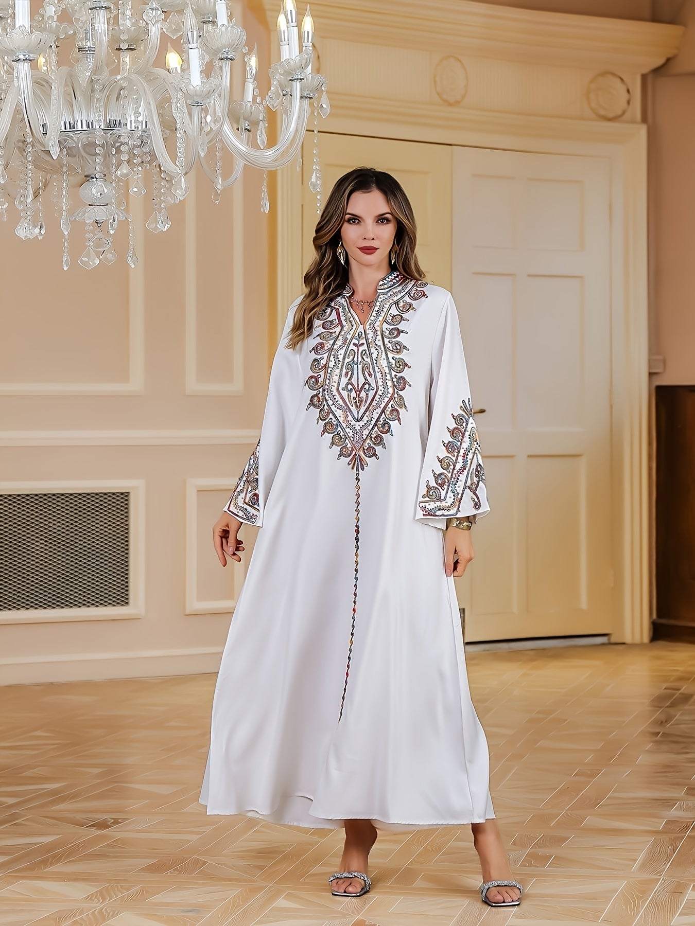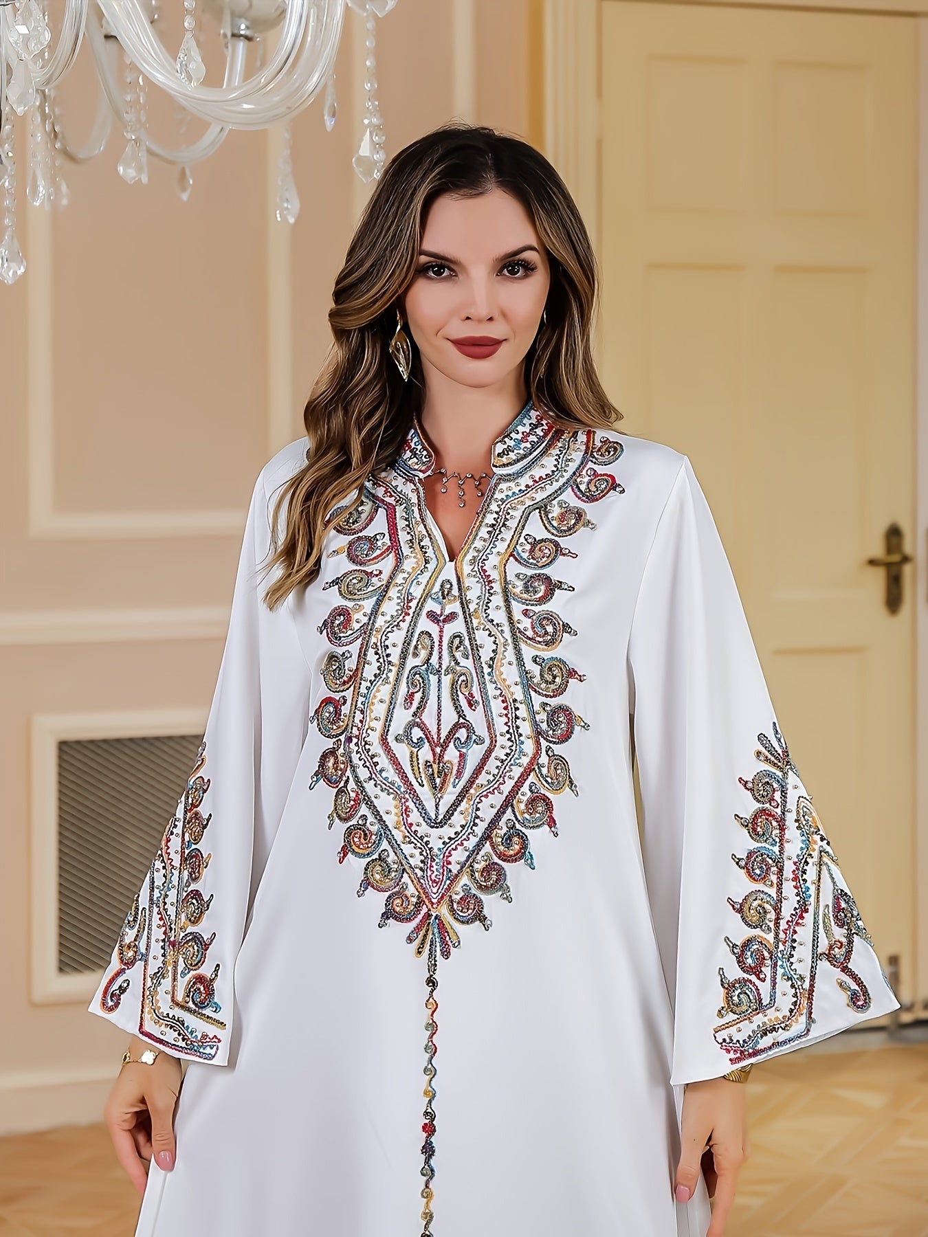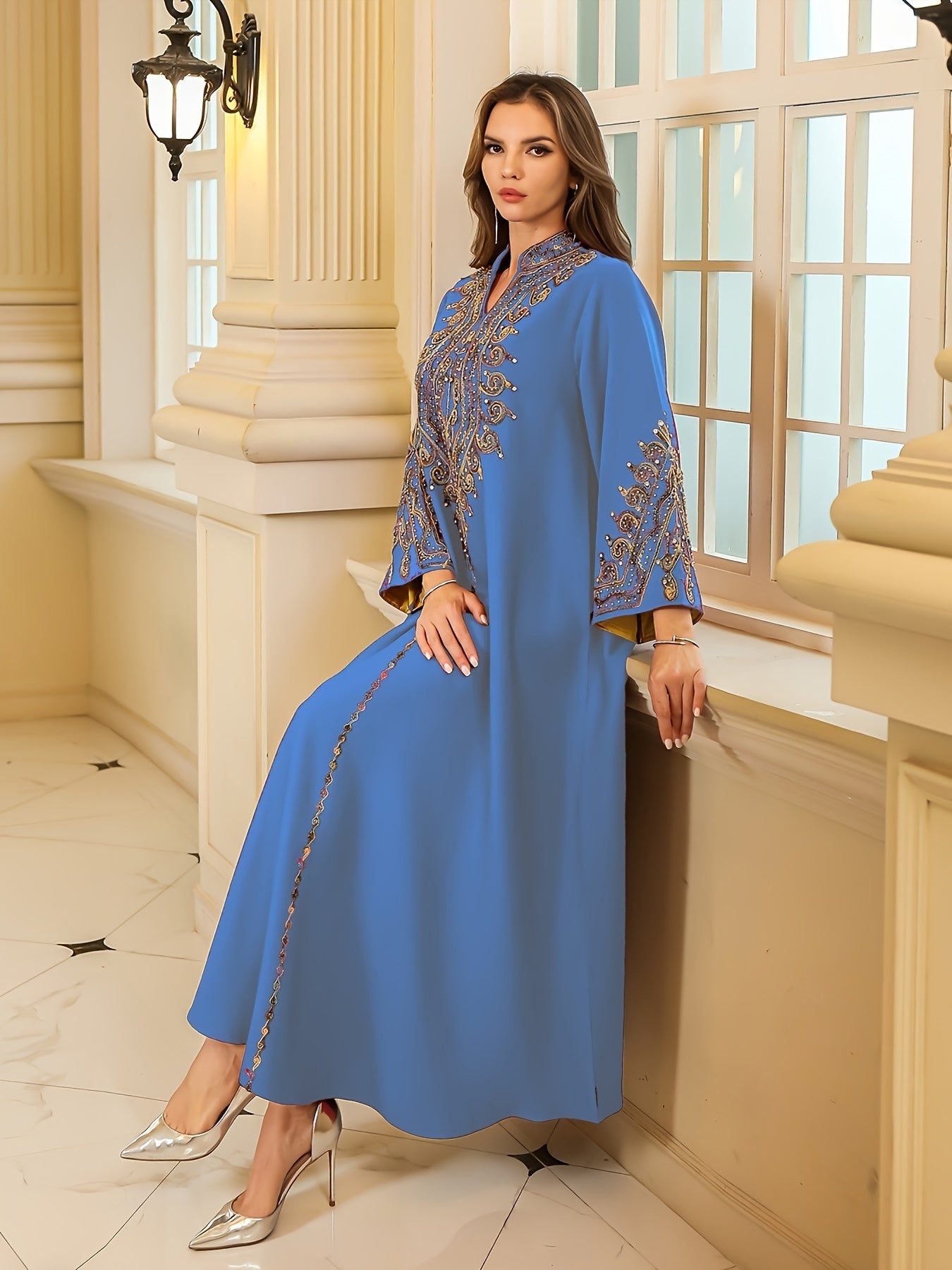 تطريز غني ومتقن بخيوط لامعة يزين الصدر والأكمام، ليمنح الجلابية طابعاً ملكياً فخماً.