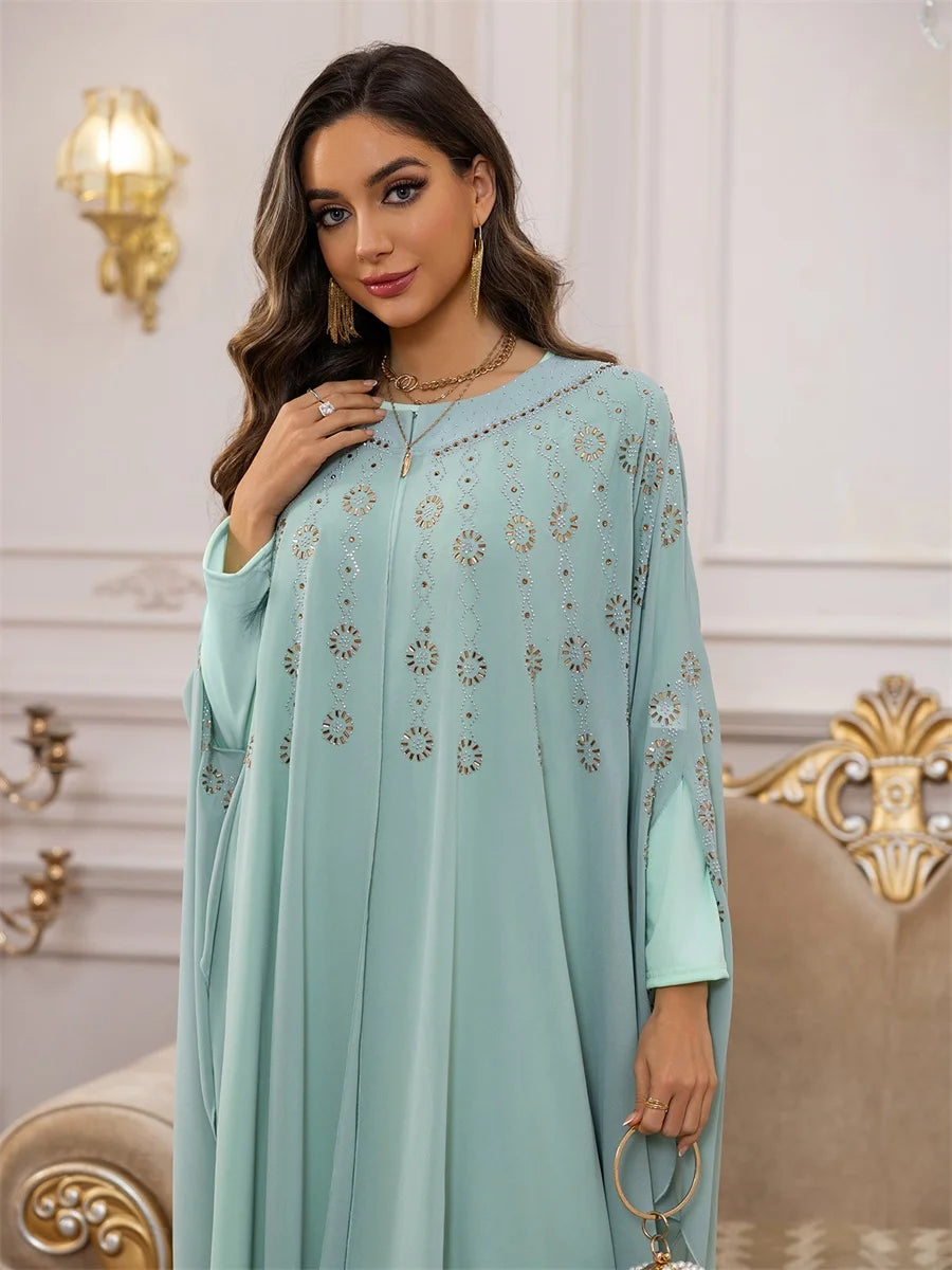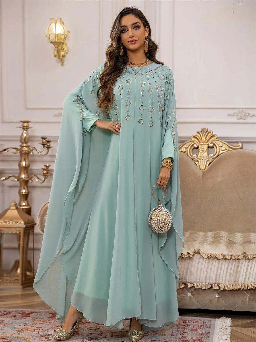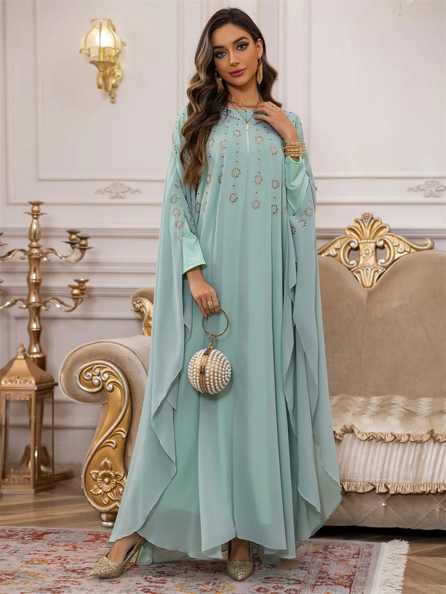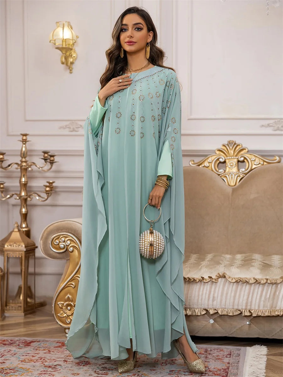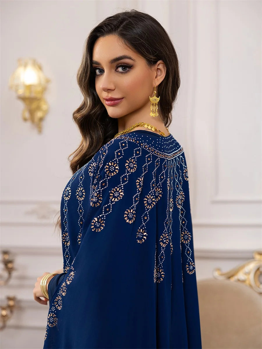 تداخل الطبقات الانسيابية مع التطريز الذهبي يمنحك إطلالة ناعمة تنبض بالأنوثة والفخامة في كل تفصيل.