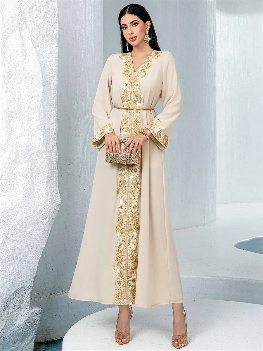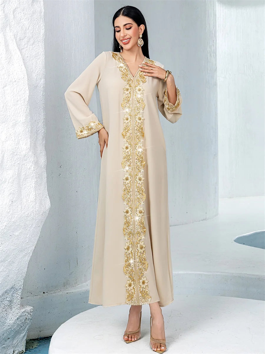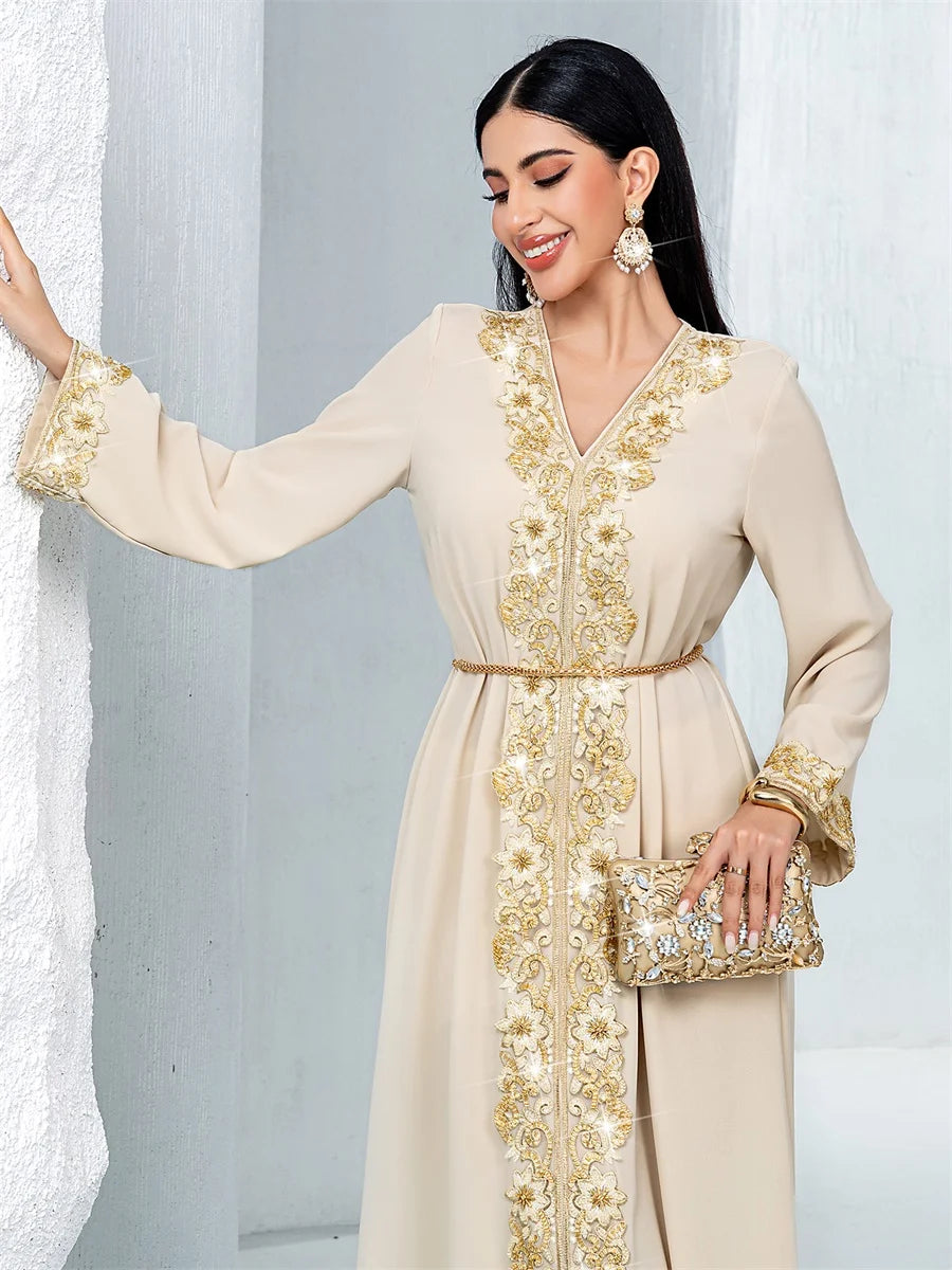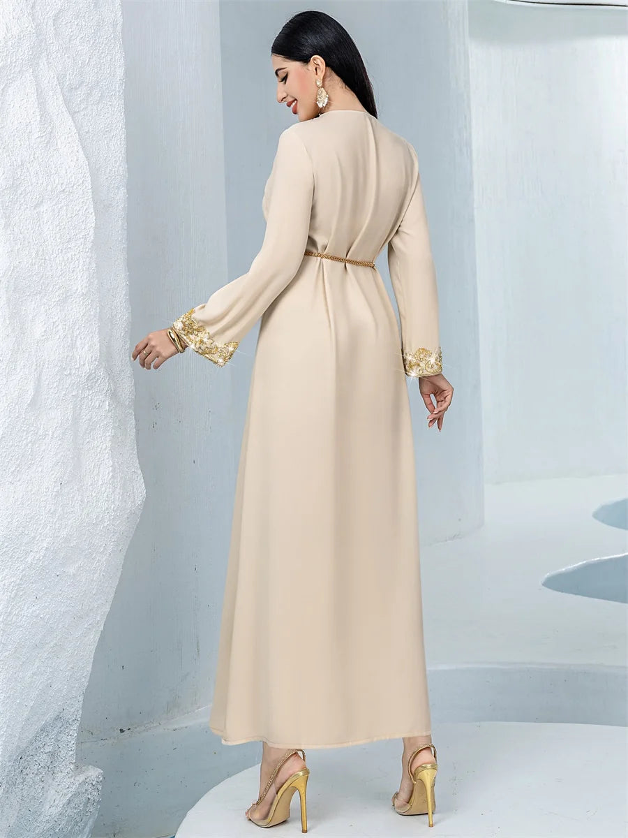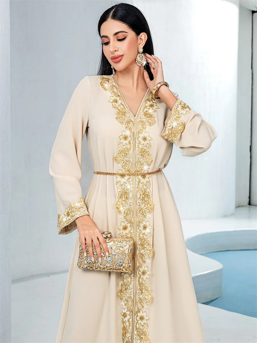 جلابية بيج ملكية مطرزة بالذهبي – فخامة شرقية بلمسة عصرية