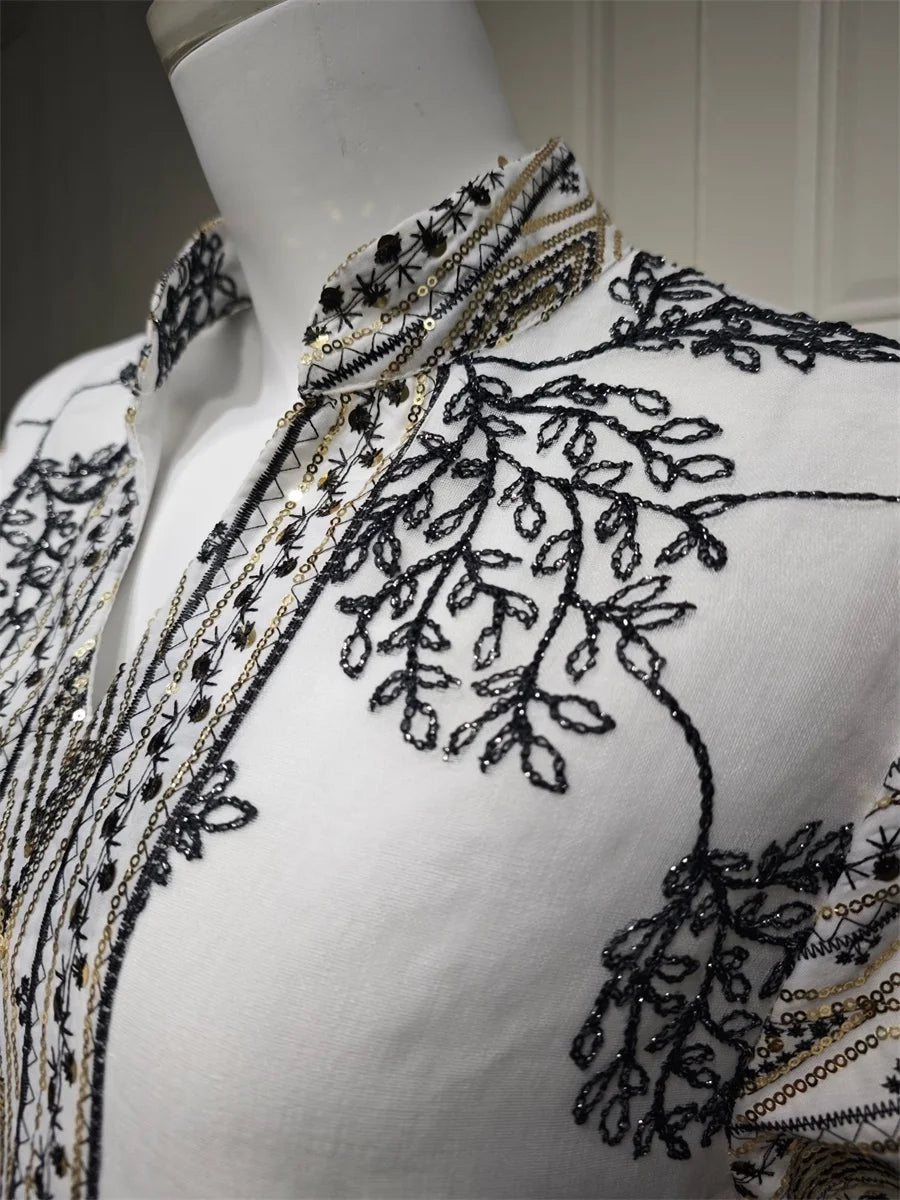 جلابية بيضاء أنيقة بتصميم فني يعكس جمال التفاصيل الشرقية. تتميز بطبعات أوراق سوداء متقنة موزعة بانسيابية على كامل القماش، مع تطريز فاخر على منطقة الصدر والأكمام يضفي لمسة فخمة. الأكمام الواسعة تضيف راحة وأناقة، والتفاصيل الذهبية الصغيرة على الأطراف تمنح الجلابية لمسة نهائية جذابة.