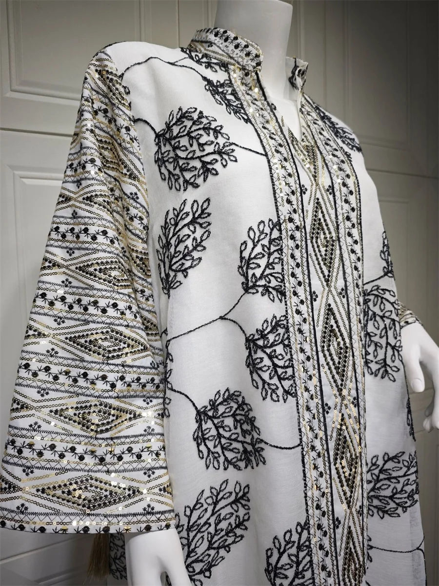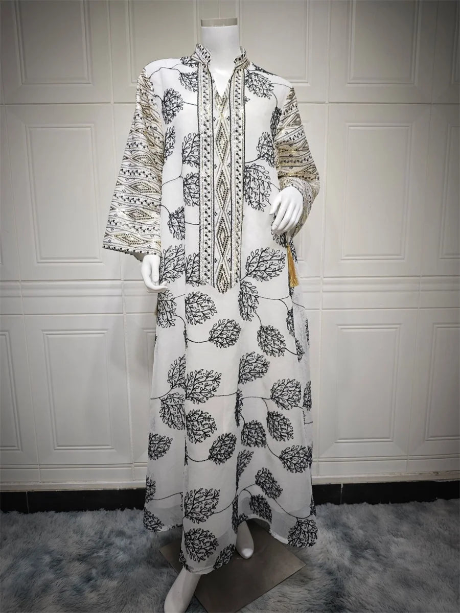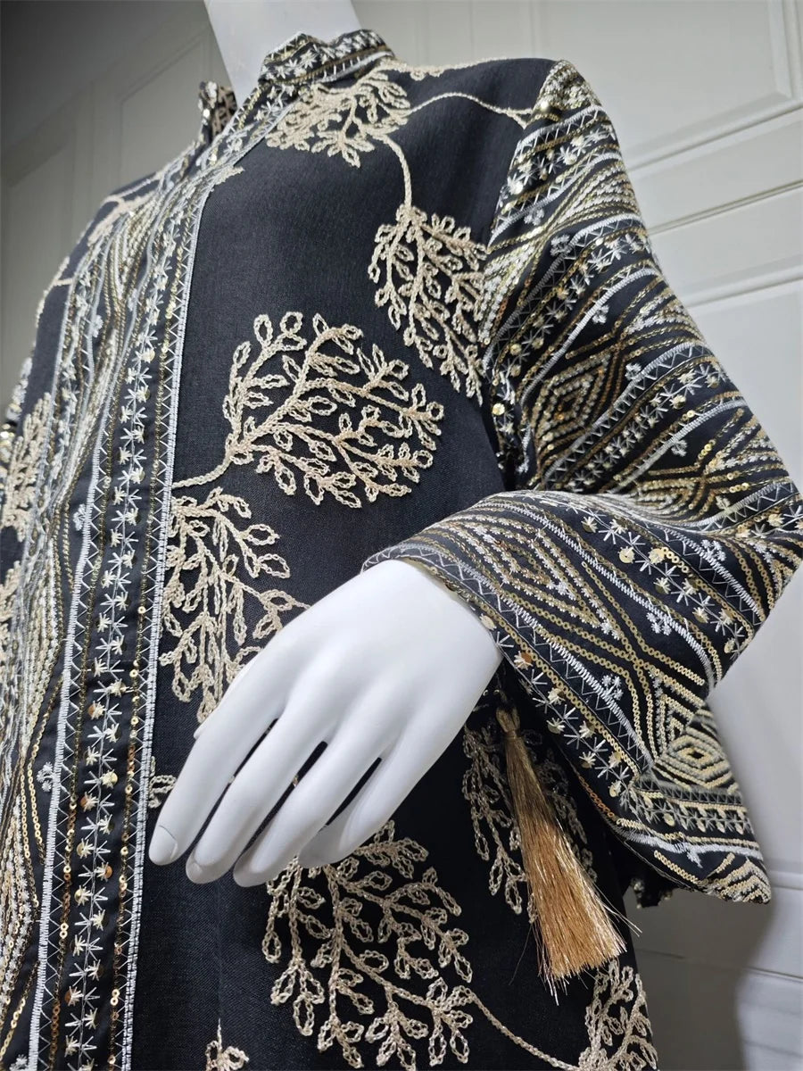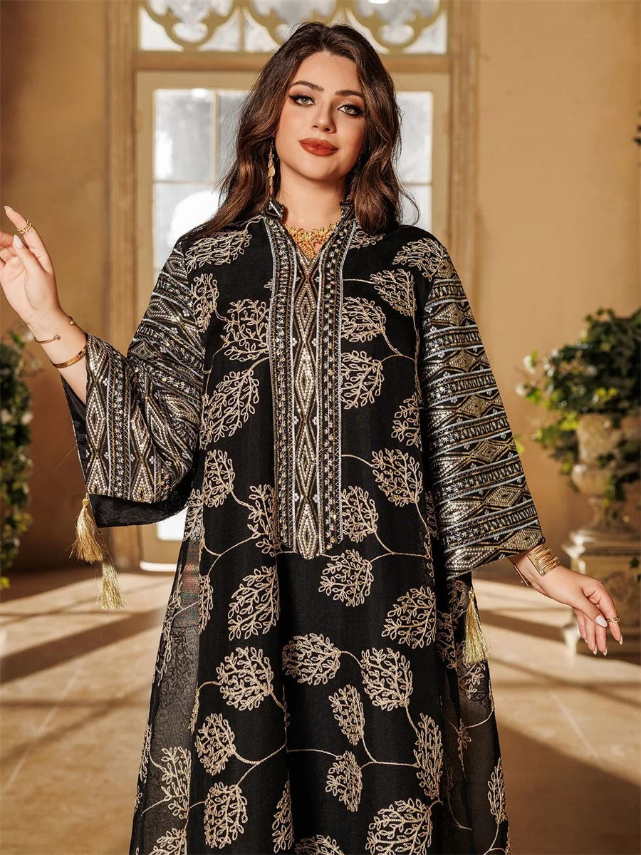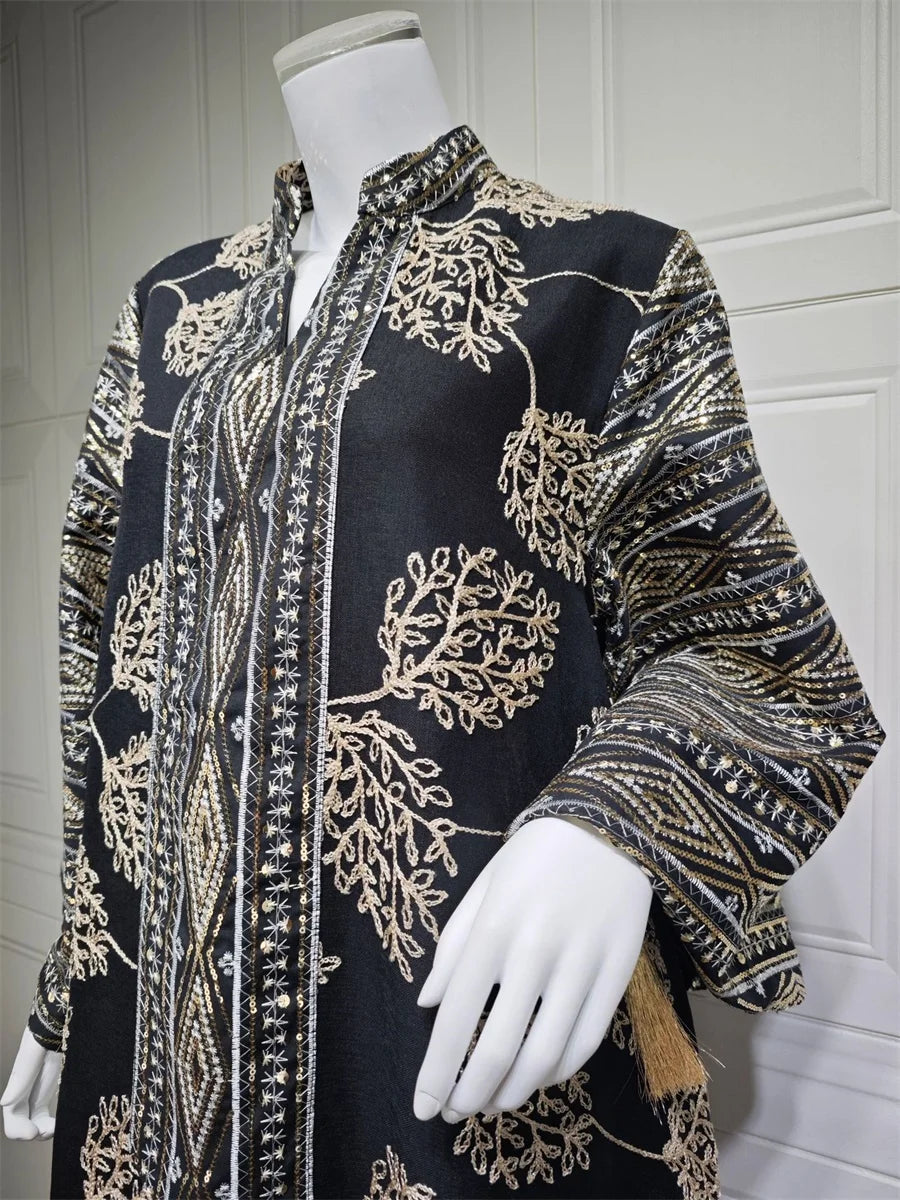 جلابية فاخرة بنقشة أوراق سوداء وتطريز شرقي فاخر