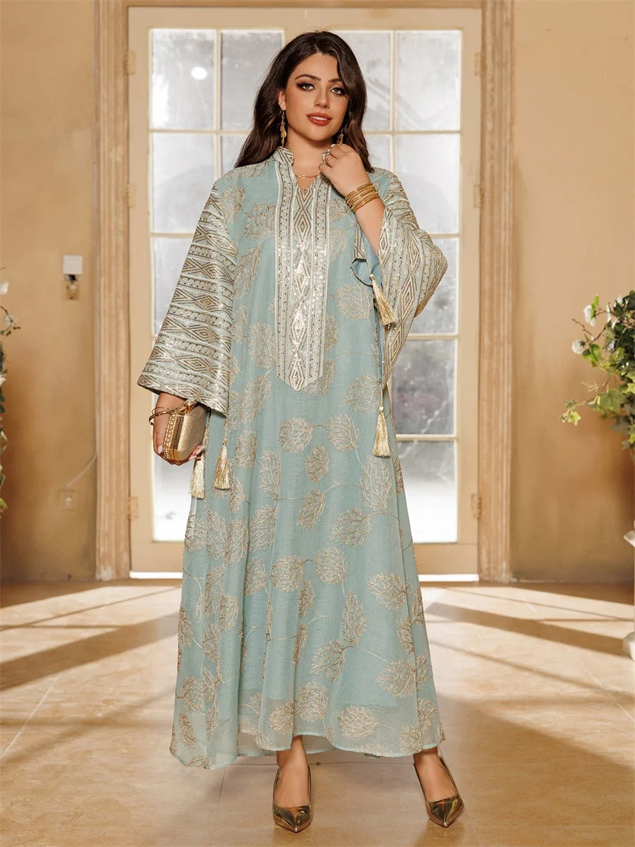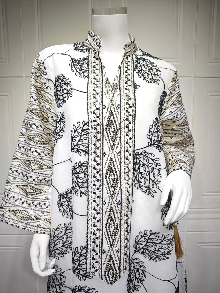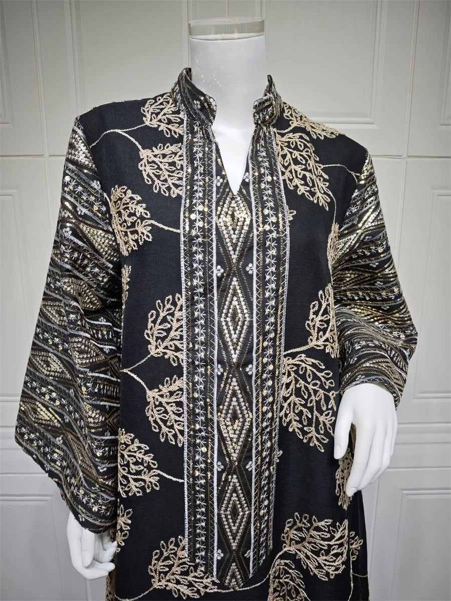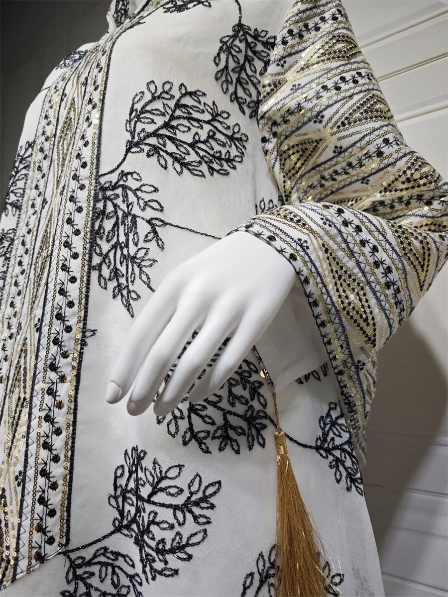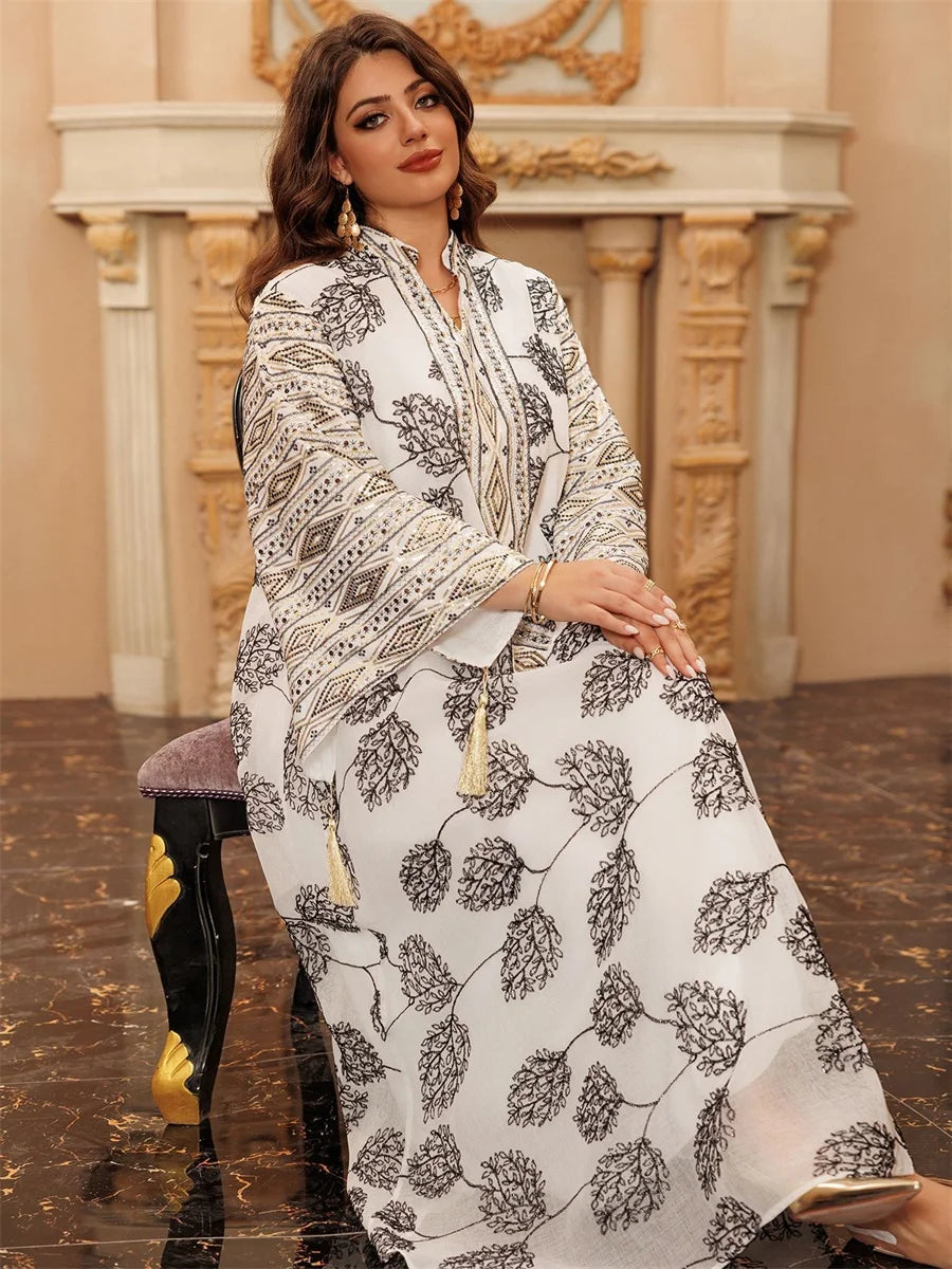 جلابية فاخرة بنقشة أوراق سوداء وتطريز شرقي فاخر