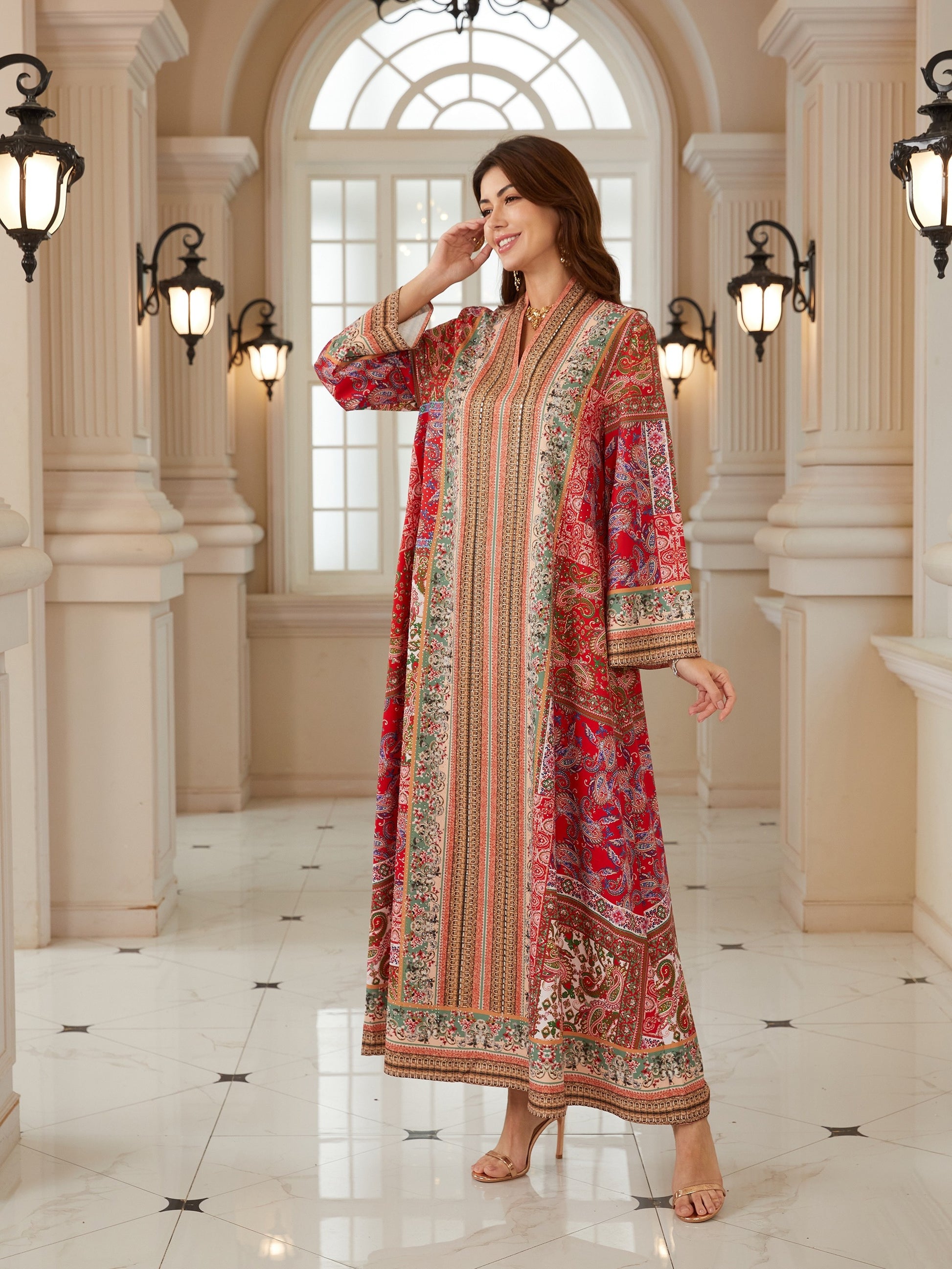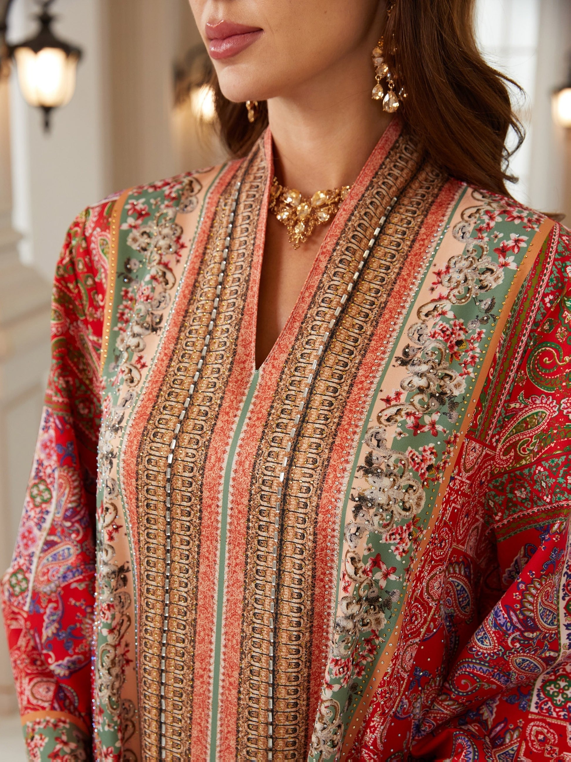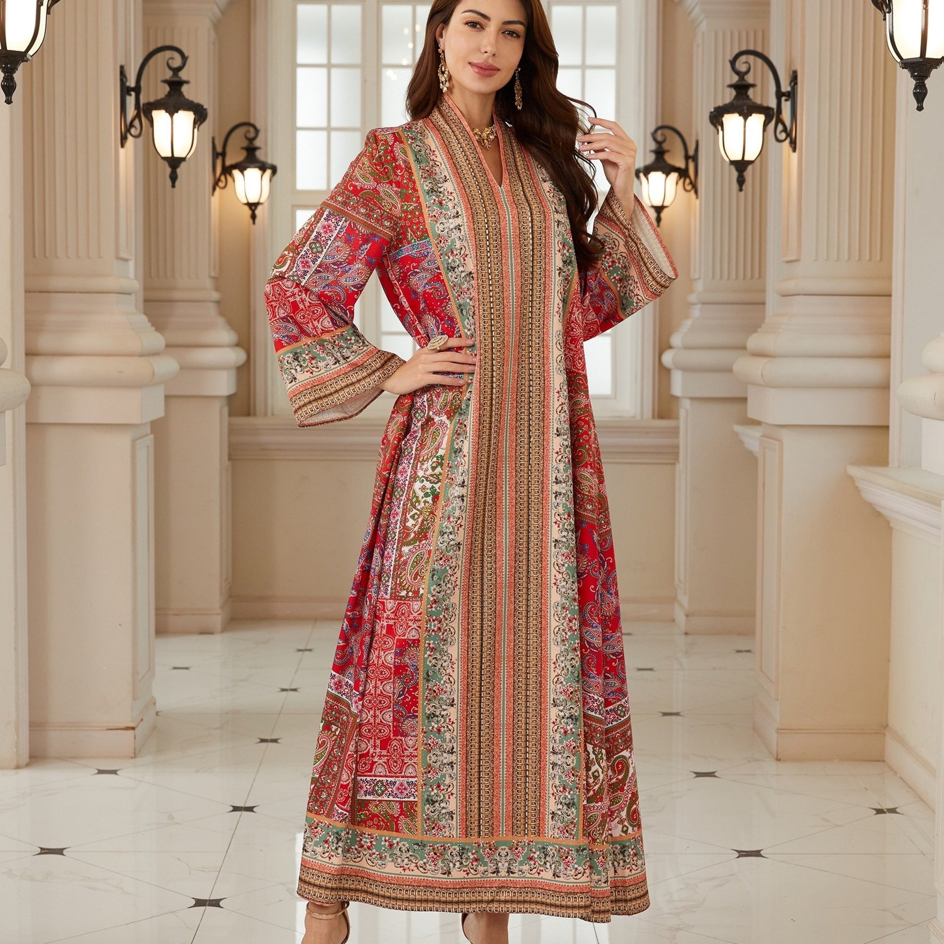 نقوش تراثية متداخلة بألوان الأحمر والبيج والأخضر، مع توزيع طولي متقن يعزز من فخامة التصميم ويمنح القوام مظهراً أكثر طولاً وتناسقاً.
