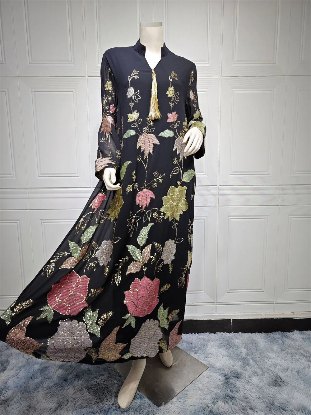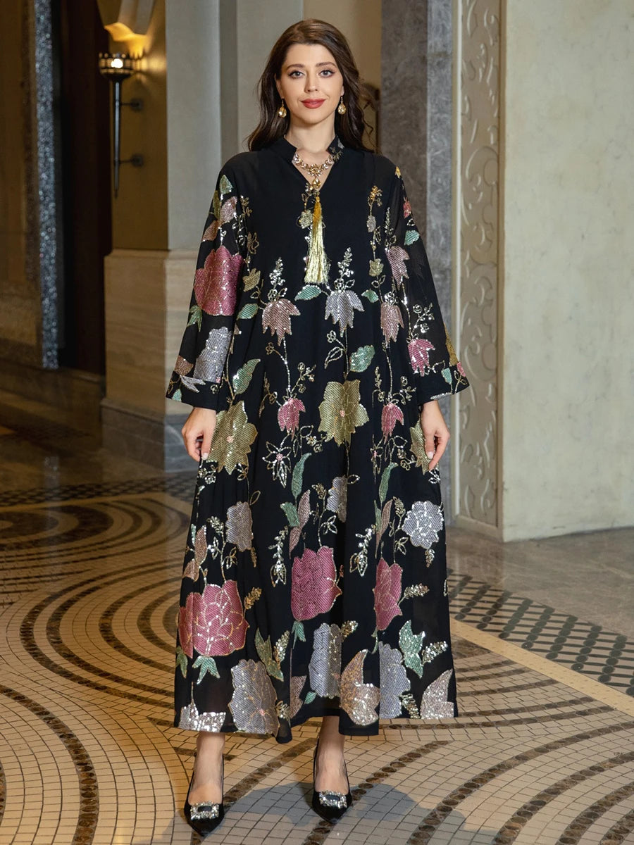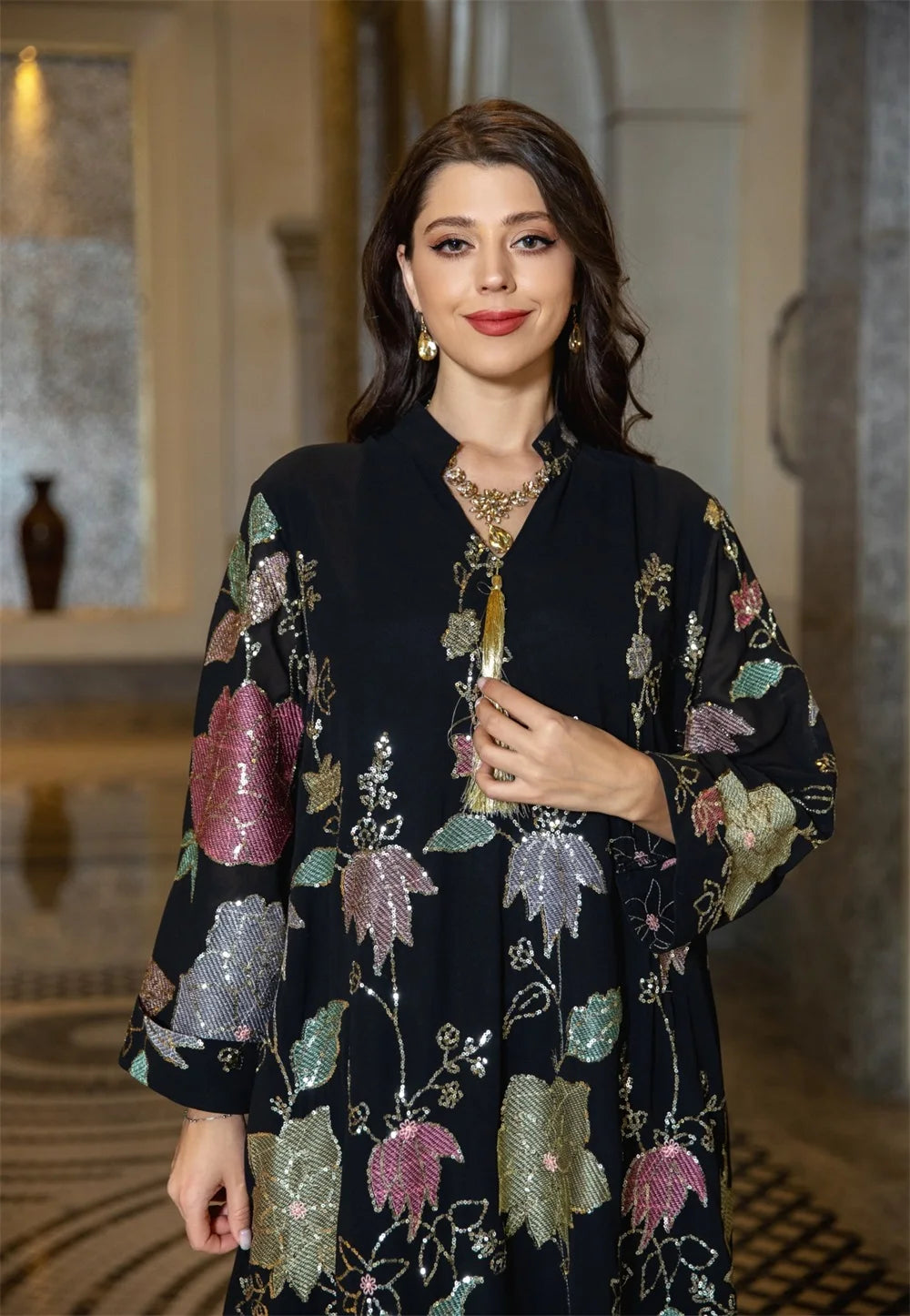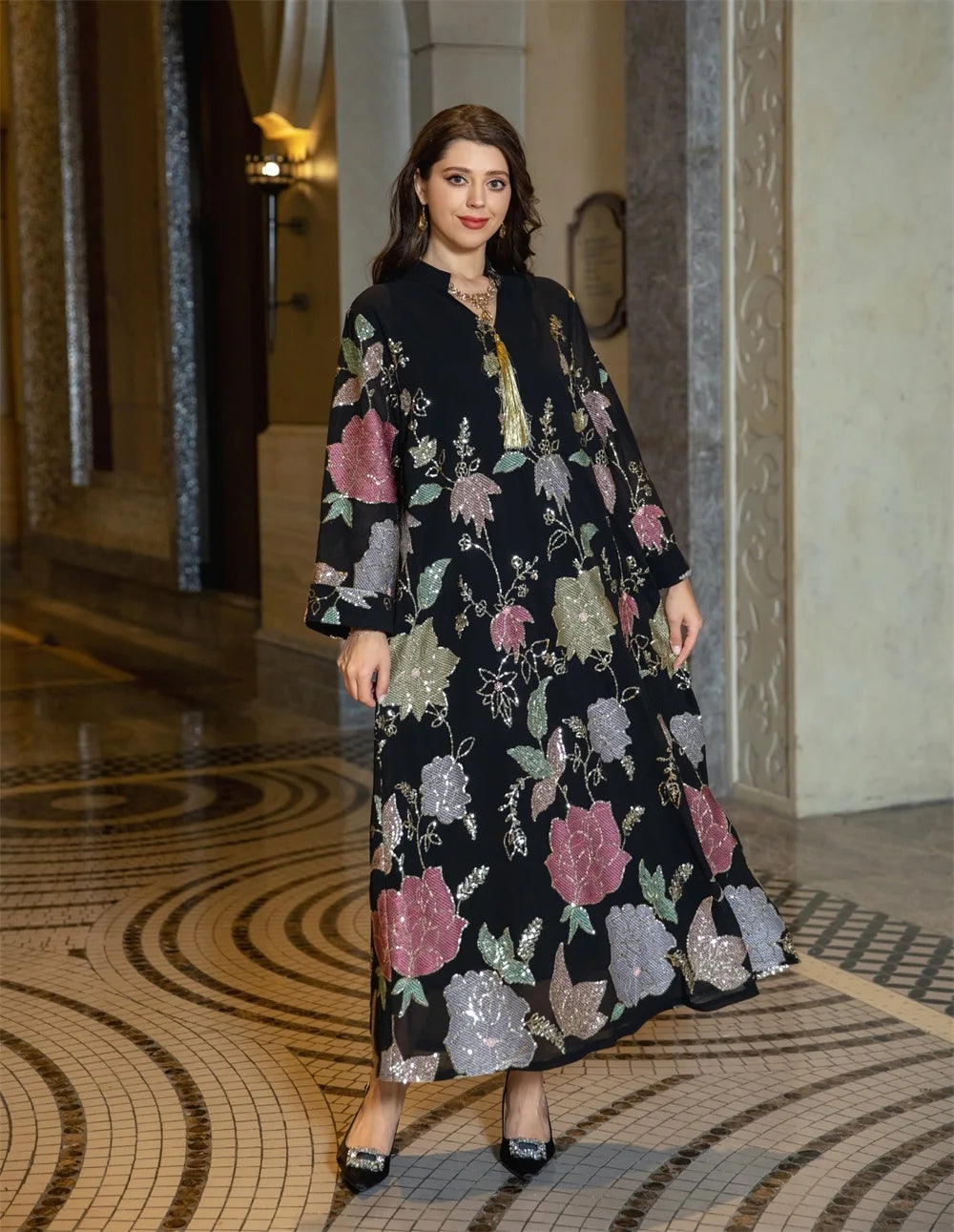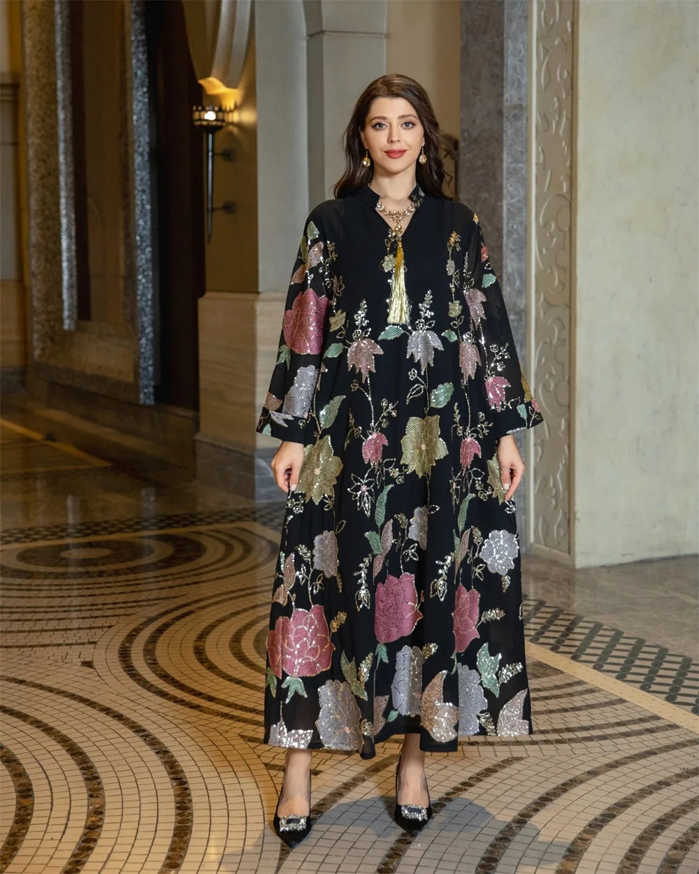 جلابية سوداء فاخرة مطرزة بالورود اللامعة