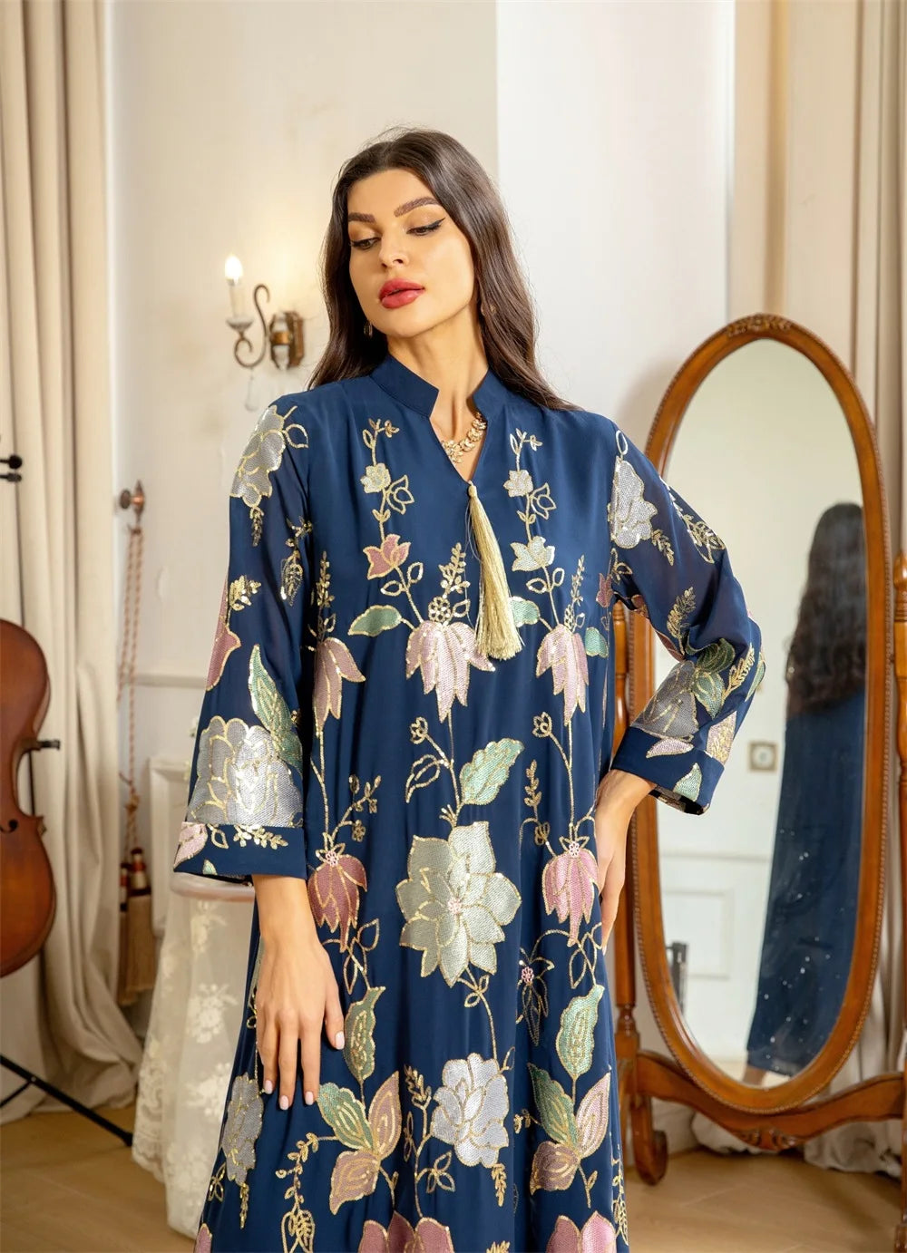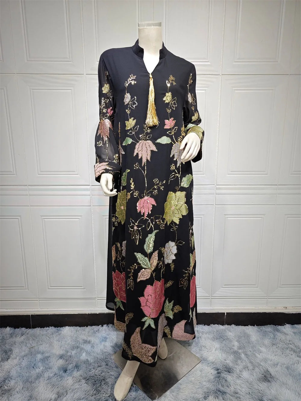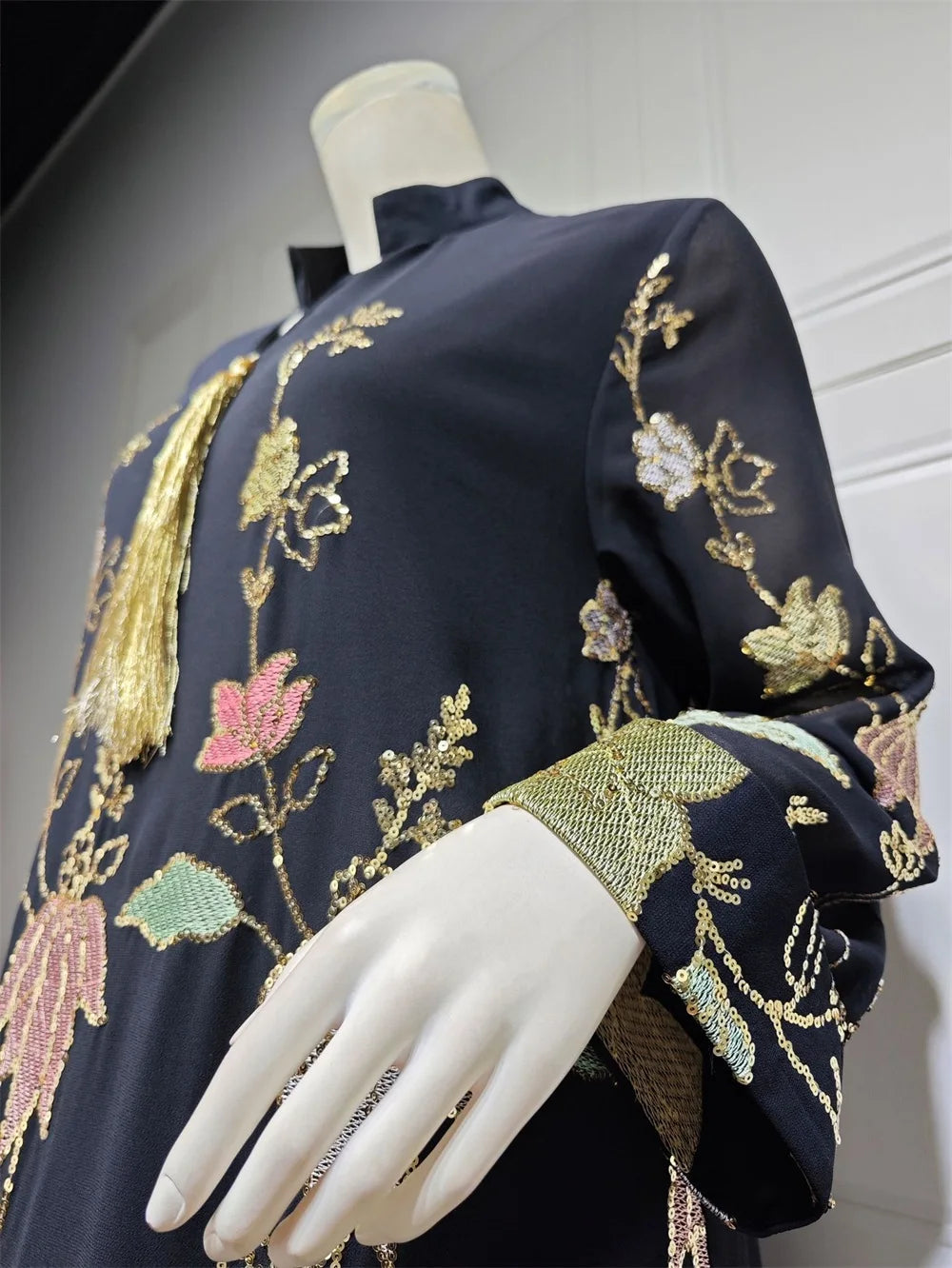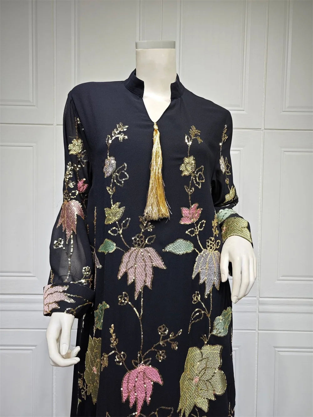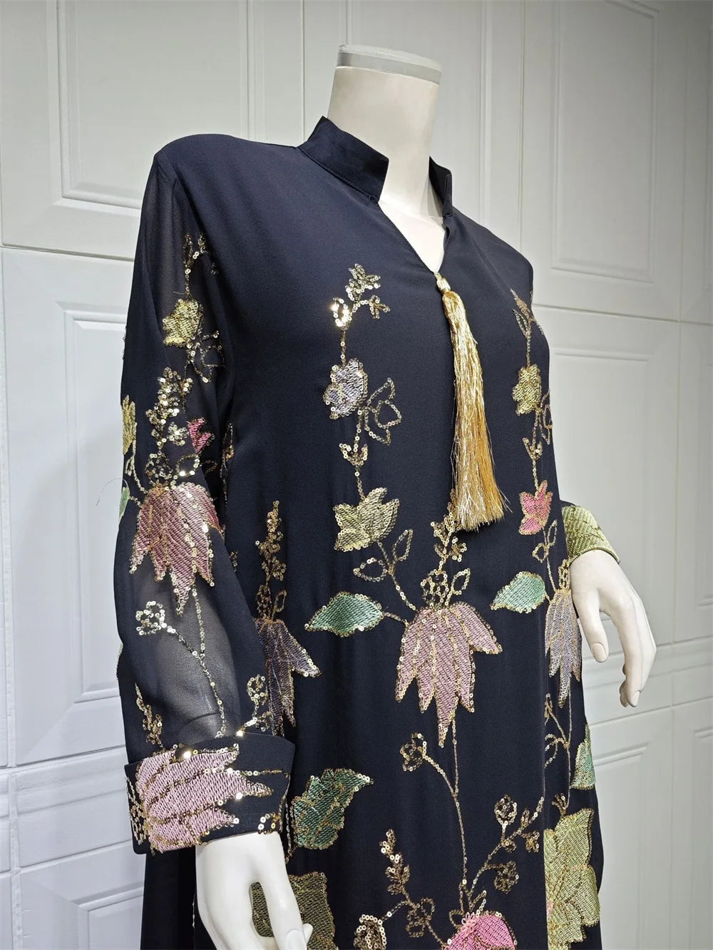 جلابية سوداء فاخرة مطرزة بالورود اللامعة