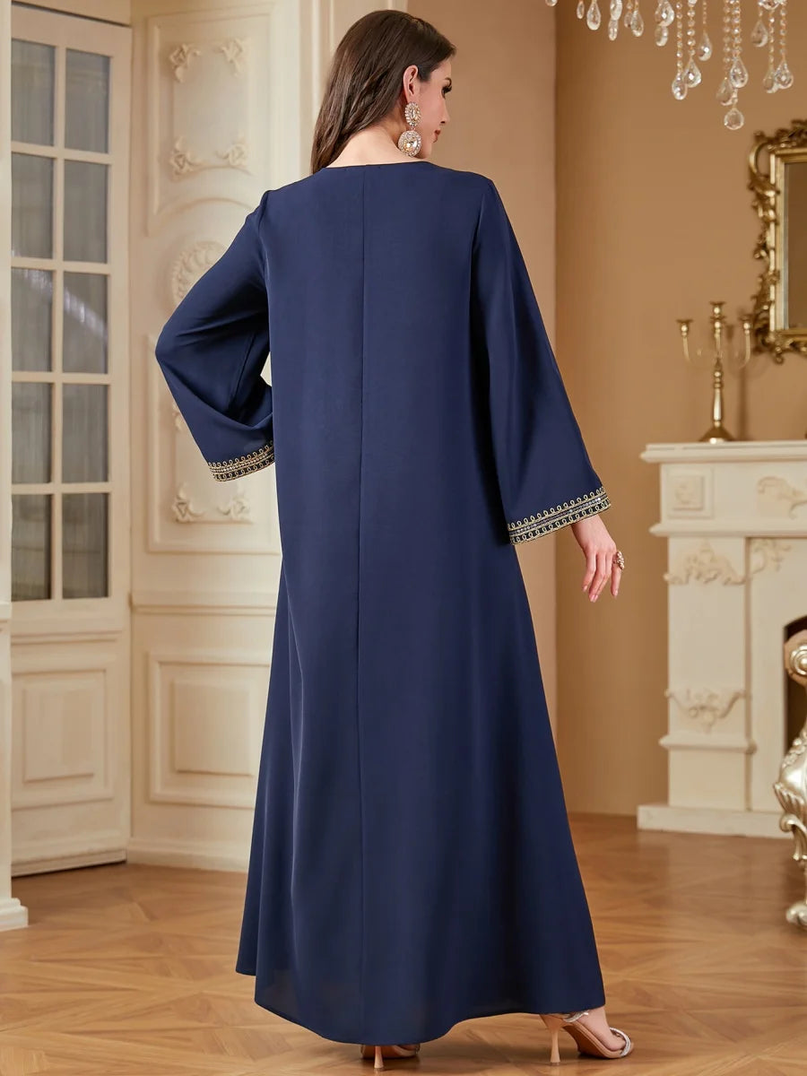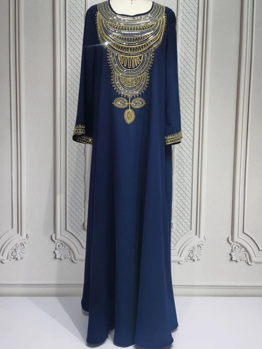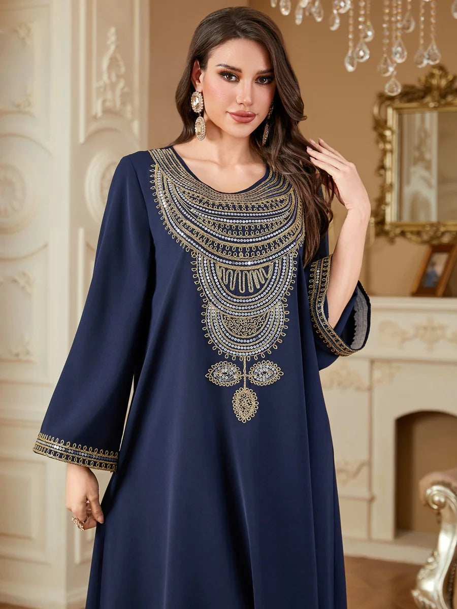 جلابية كحلية فاخرة بتطريز ذهبي تقليدي بنقوش ملكية جذابة