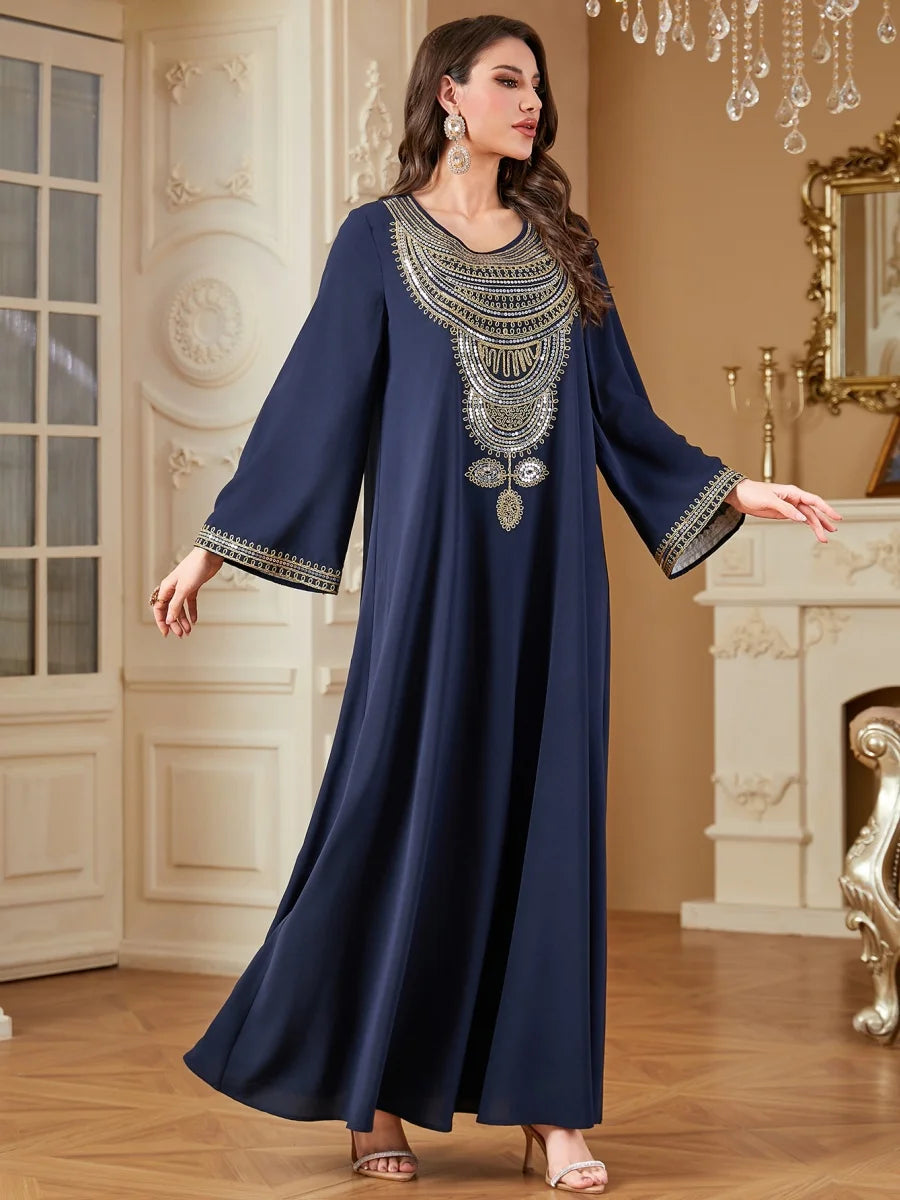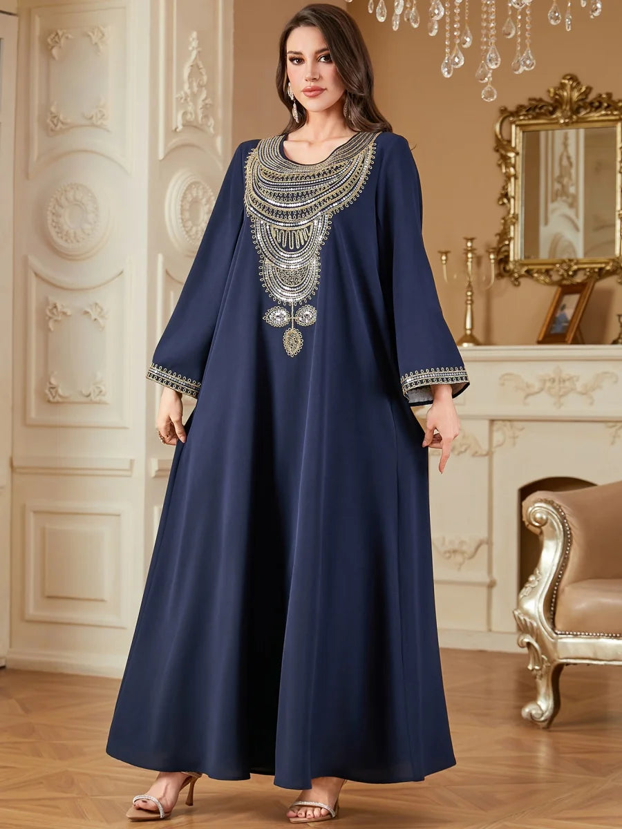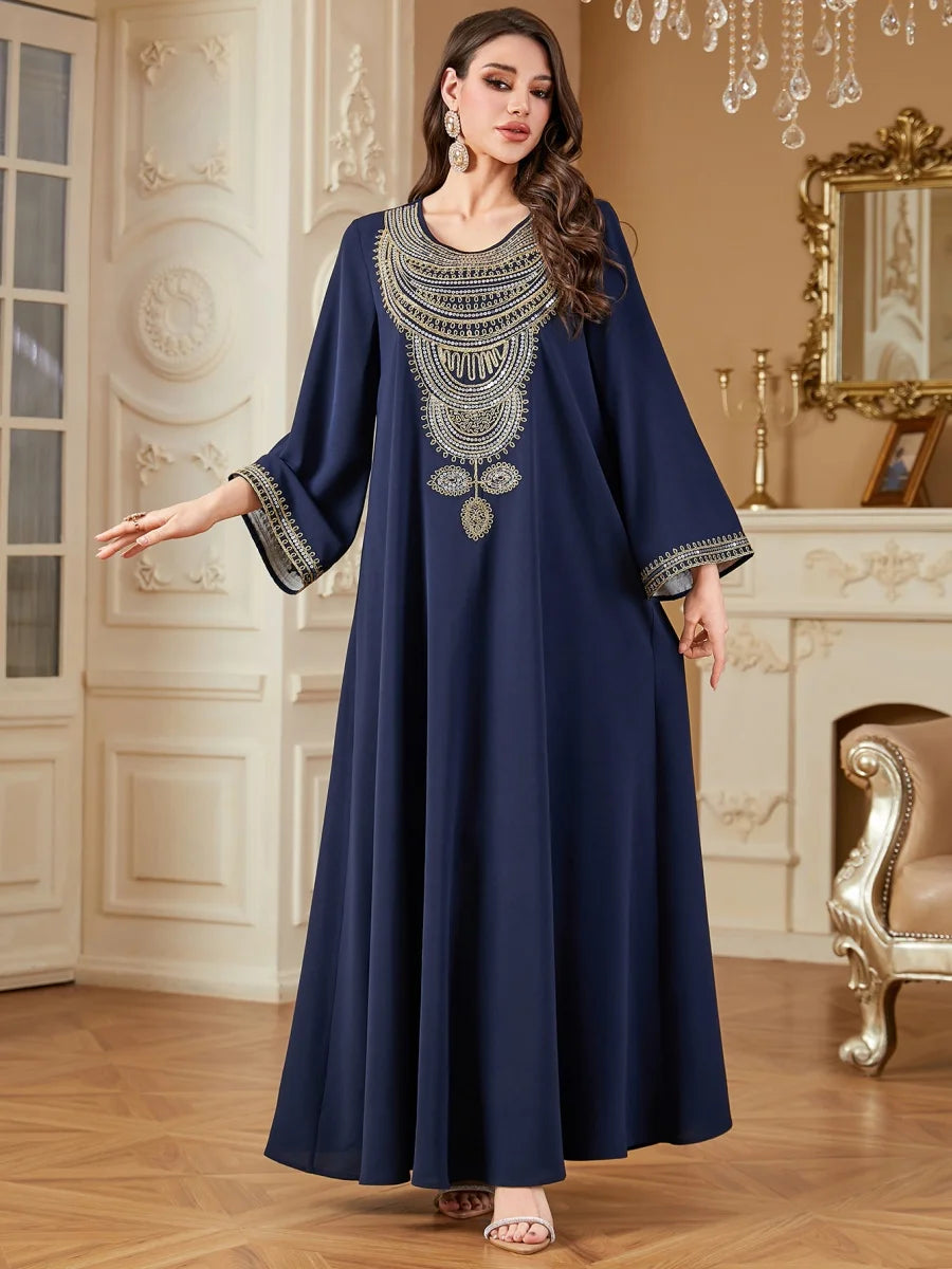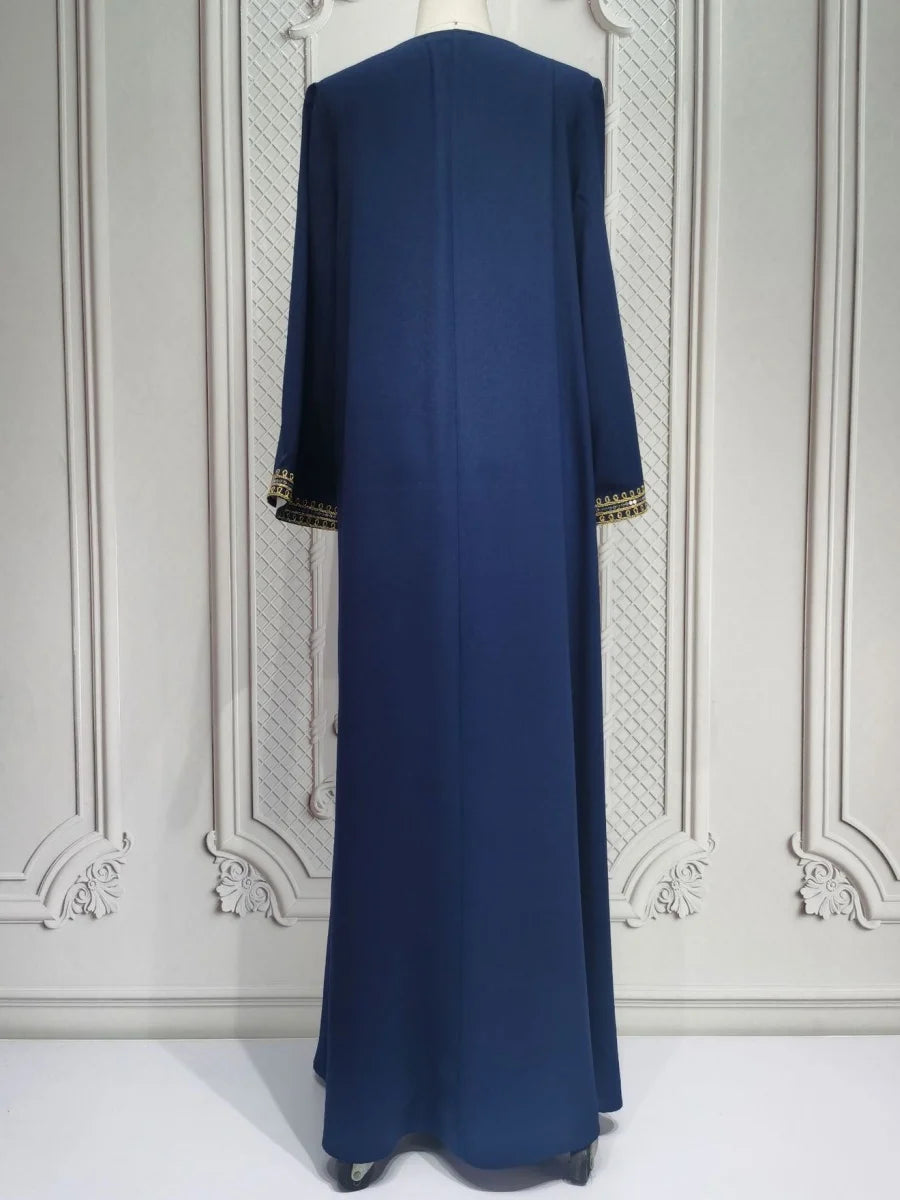 جلابية كحلية فاخرة بتطريز ذهبي تقليدي بنقوش ملكية جذابة