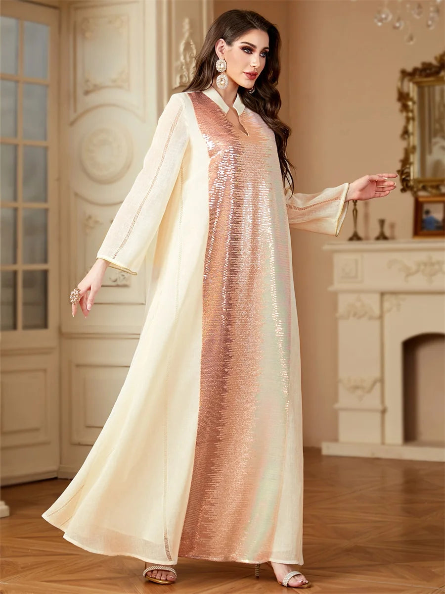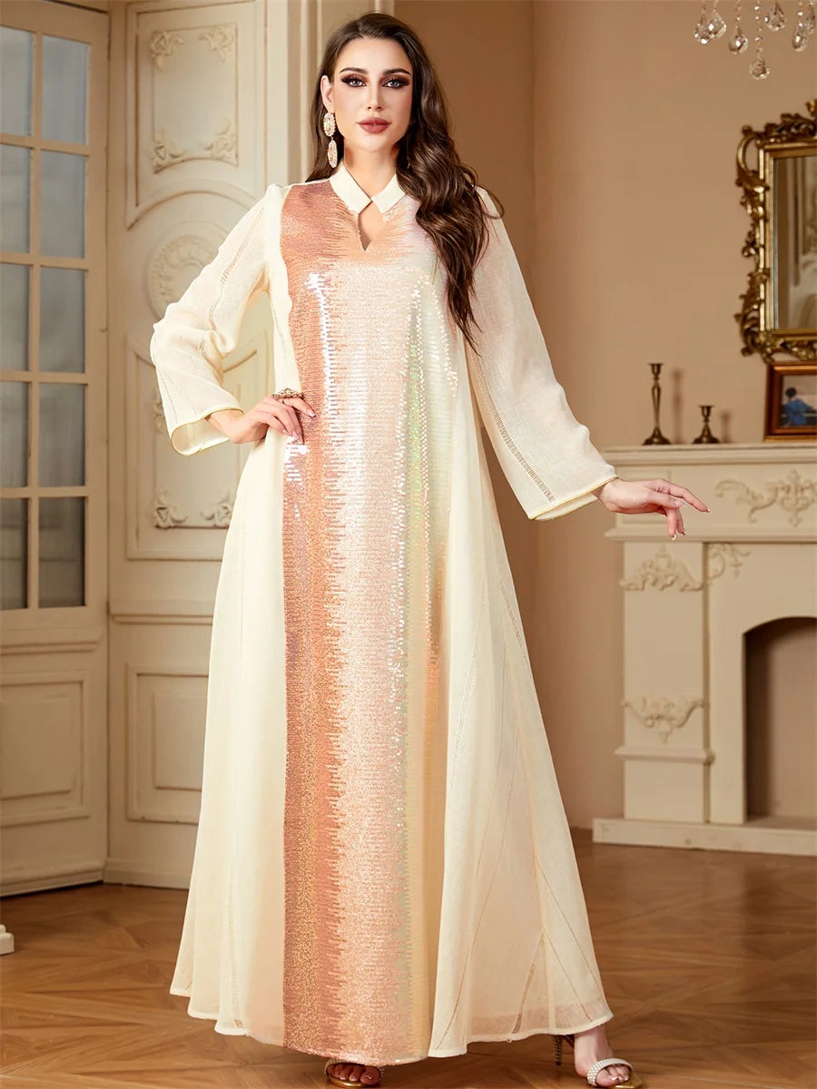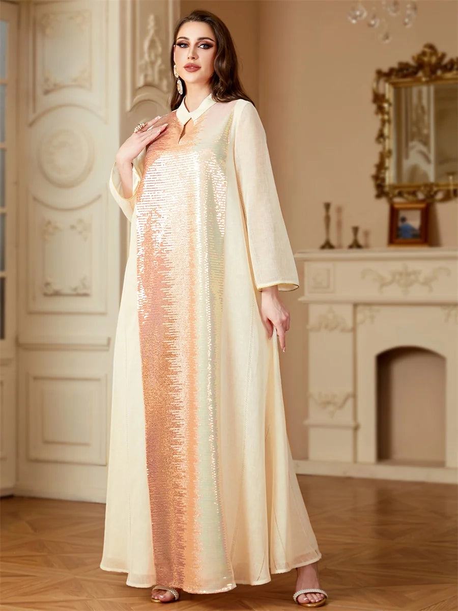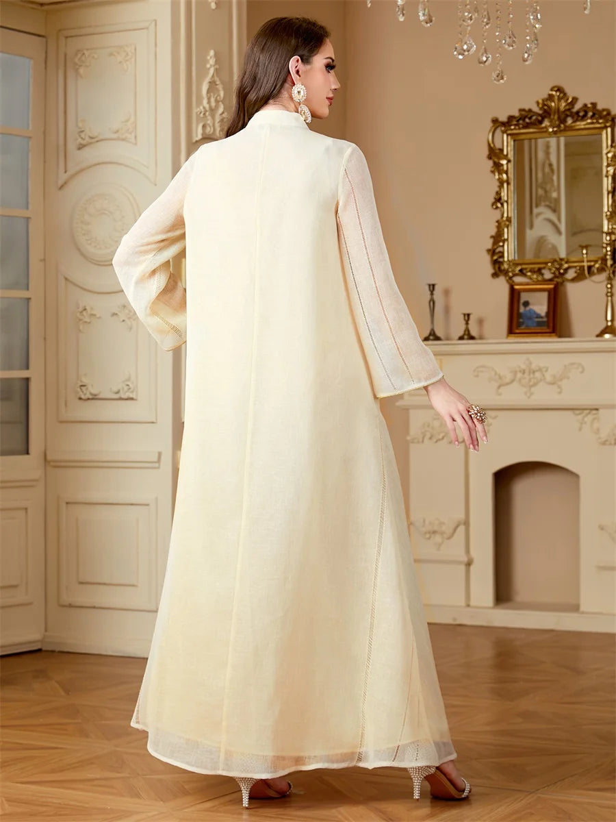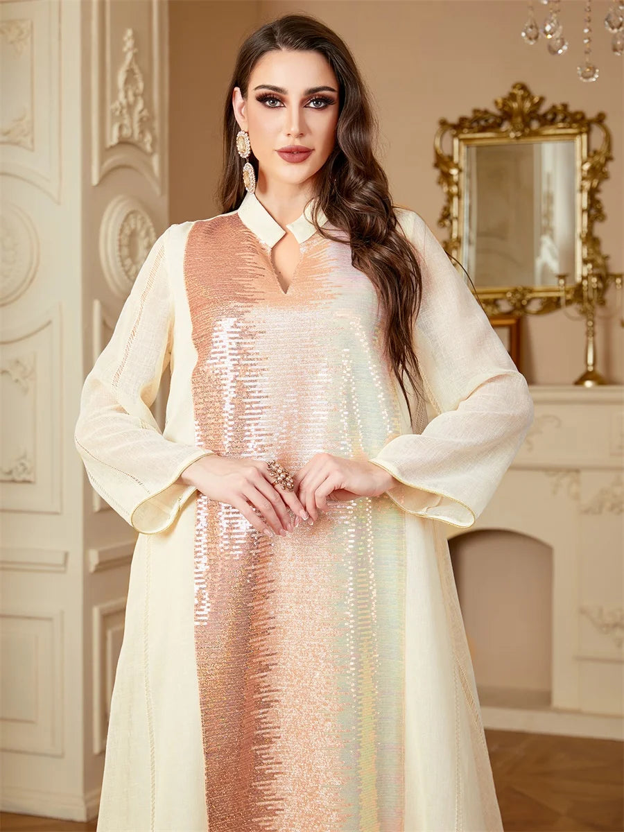 جلابية كريمية فاخرة بتطريز لامع على الواجهة – إطلالة أنثوية براقة