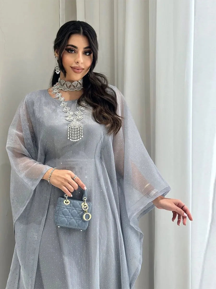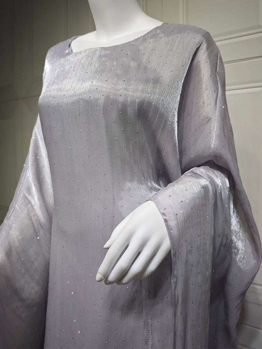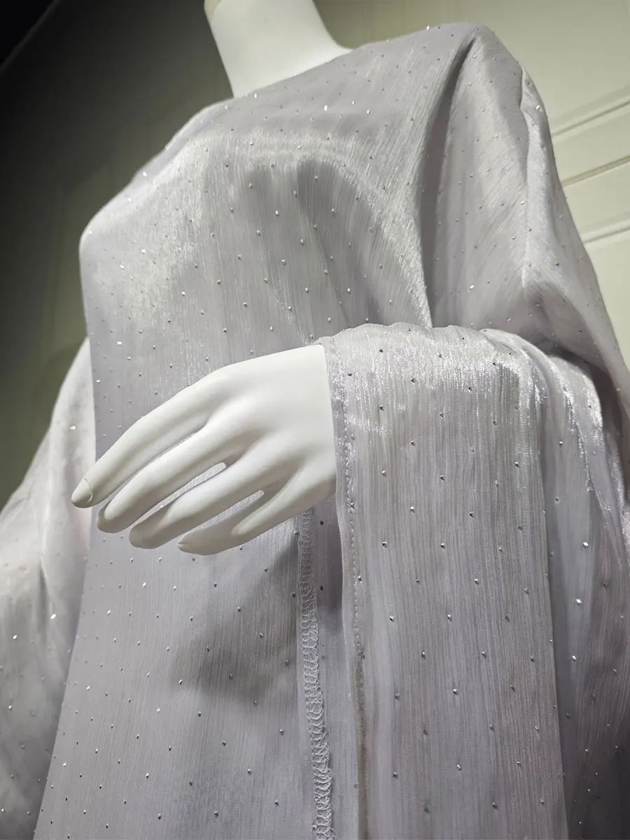 جلابيات فاخرة بتصميم ملكي ناعم ينبض بالأناقة والرقي. تتميز بقصة فضفاضة تنسدل بانسيابية ساحرة، مع قماش شفاف مزدان بنقاط لامعة تضيف لمسة من الجاذبية الهادئة. الألوان الراقية – الرمادي الهادئ والأبيض النقي – تمنحك حضوراً أنثوياً متفرداً في كل مناسبة.