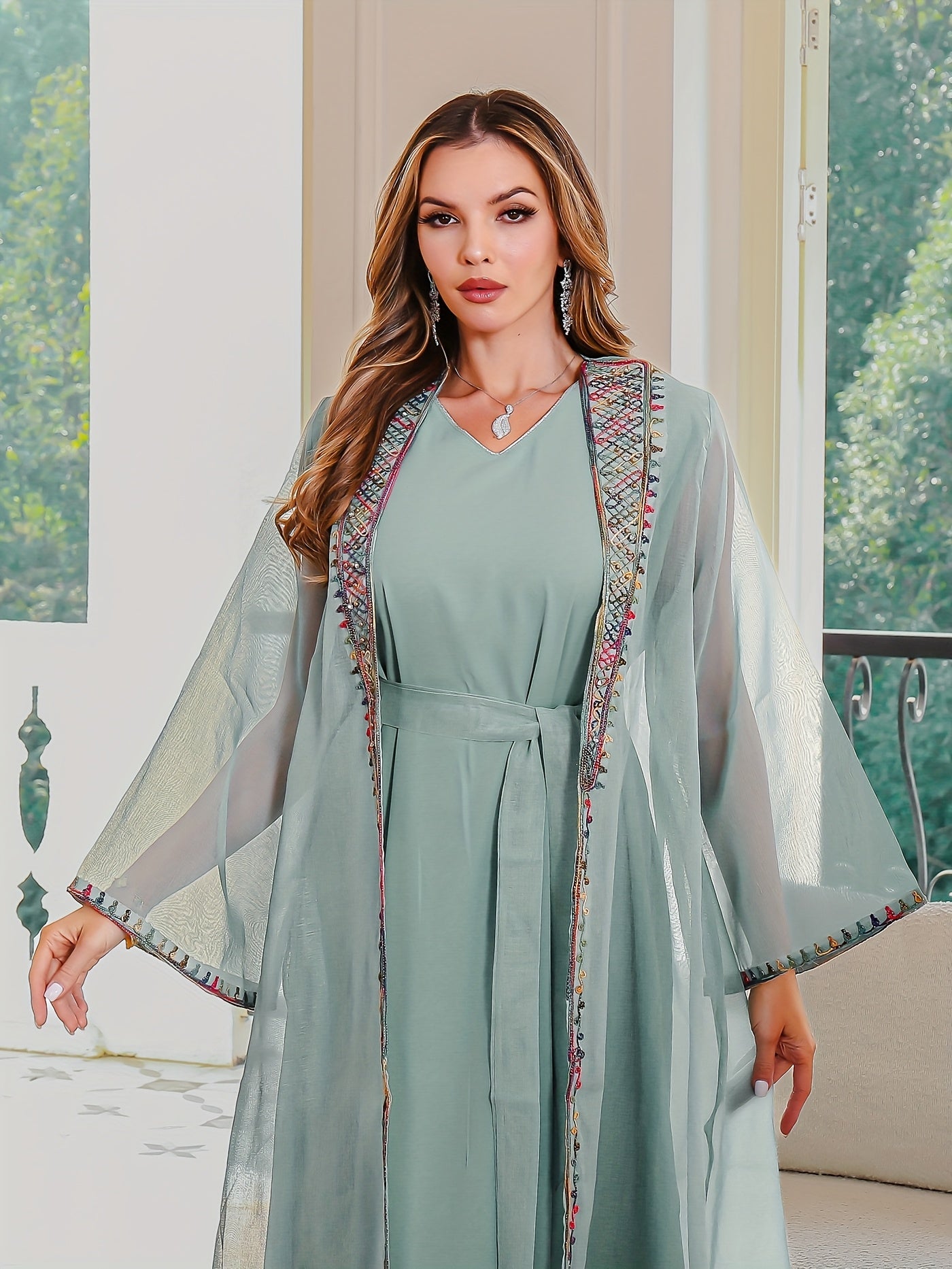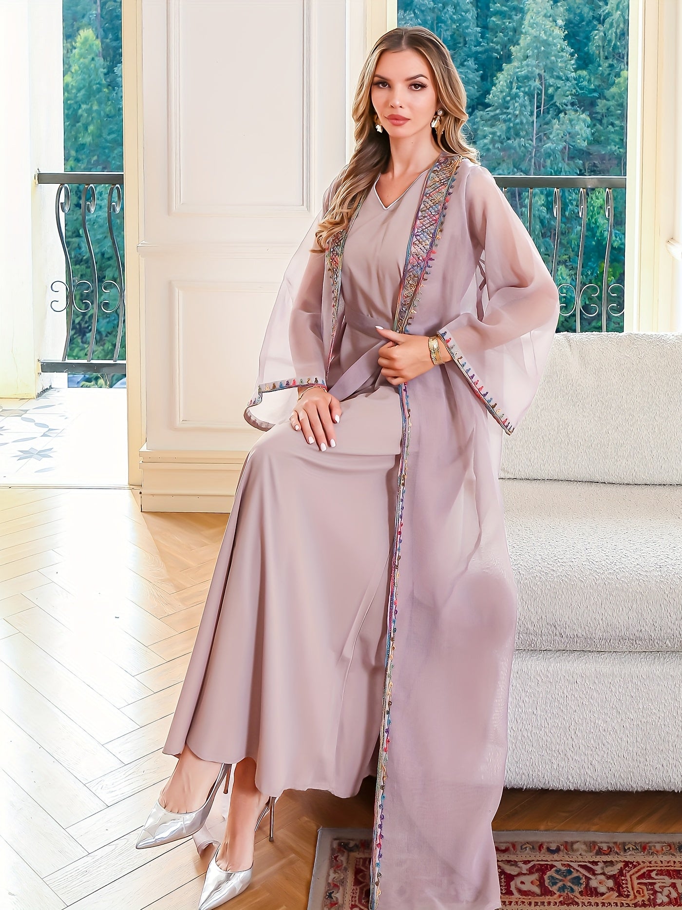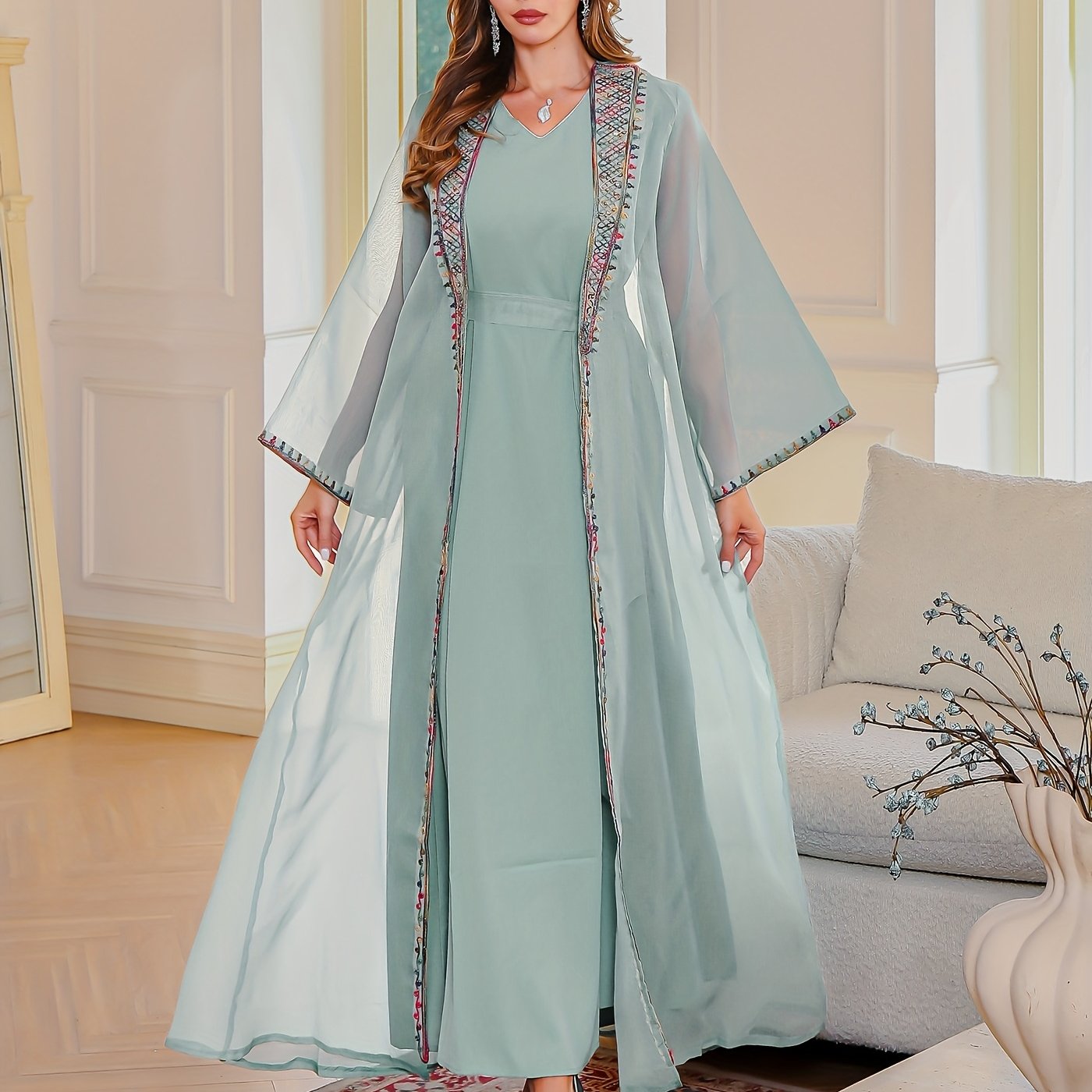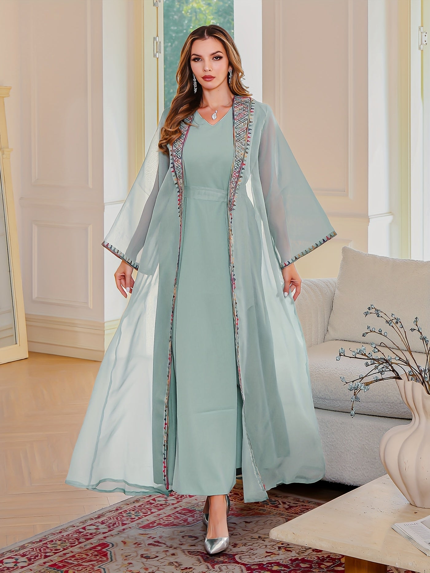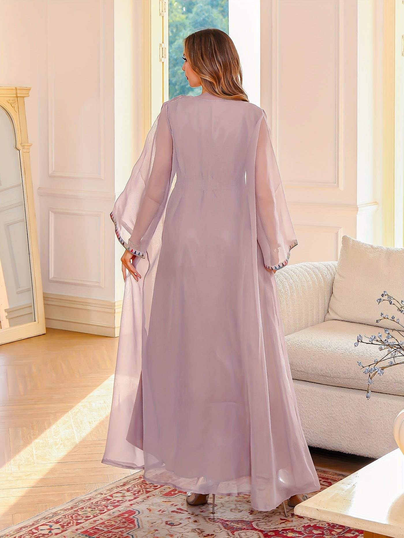 تطريز ناعم ودقيق على الأطراف مع قصة مفتوحة تزيد من فخامة الجلابية وأناقتها.