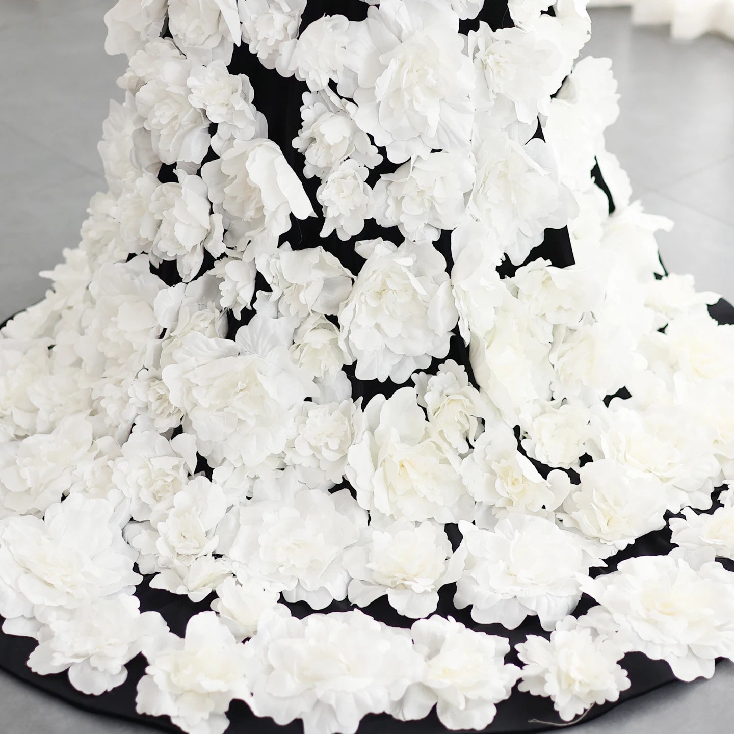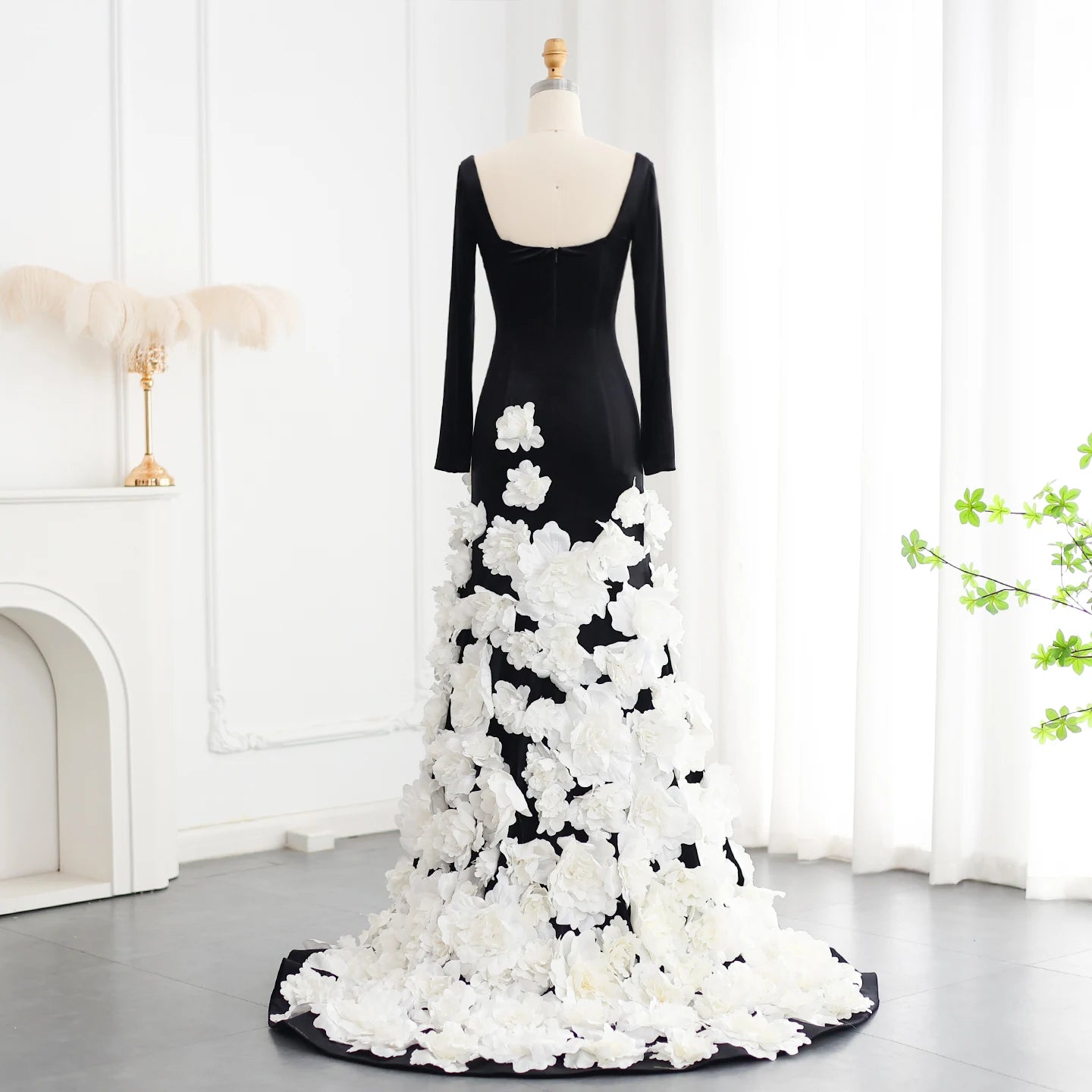 الفستان يتميز بتصميم أنيق يجمع بين الكلاسيكية والحداثة، مع جسم أسود ضيق يبرز جمال القوام. الجزء السفلي مغطى بتفاصيل زهرية كبيرة بيضاء، تقدم تباينًا مذهلًا وجذابًا. الأكمام الطويلة تضيف لمسة من الفخامة والرقي، مما يجعل الفستان مثاليًا للمناسبات الكبيرة والهامة