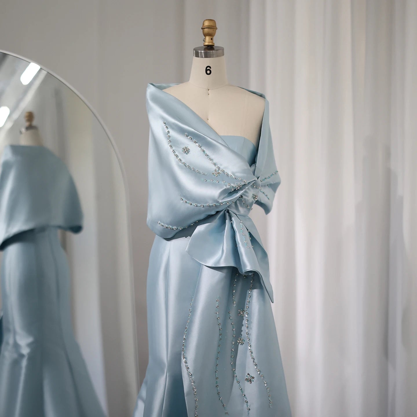 يناسب هذا الفستان تسريحة شعر مرفوعة أو مموجة ناعمة، مع أقراط كريستالية متدلية، وحذاء بكعب فضي أو شفاف، ومكياج هادئ بألوان ناعمة لإبراز جمال اللون السماوي.