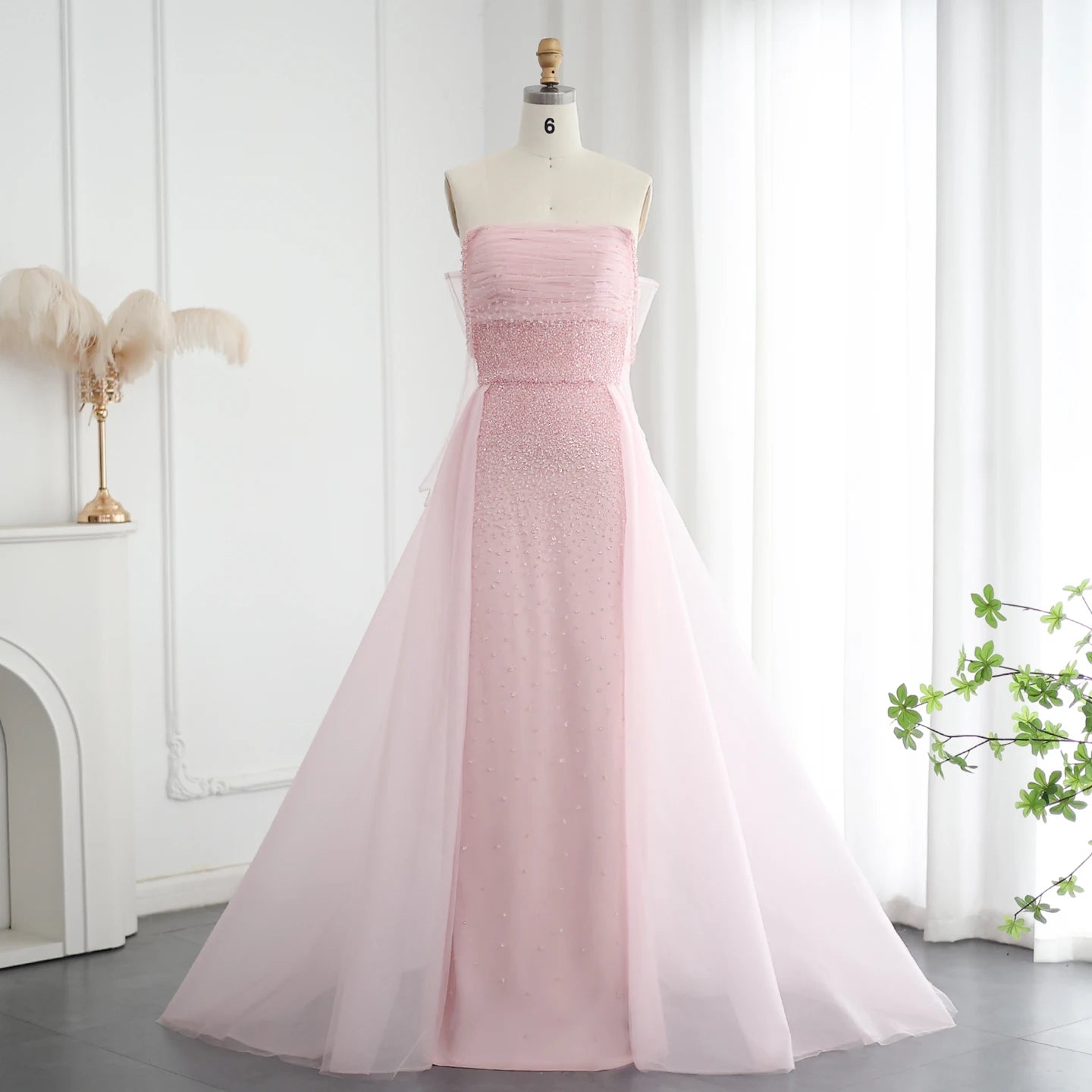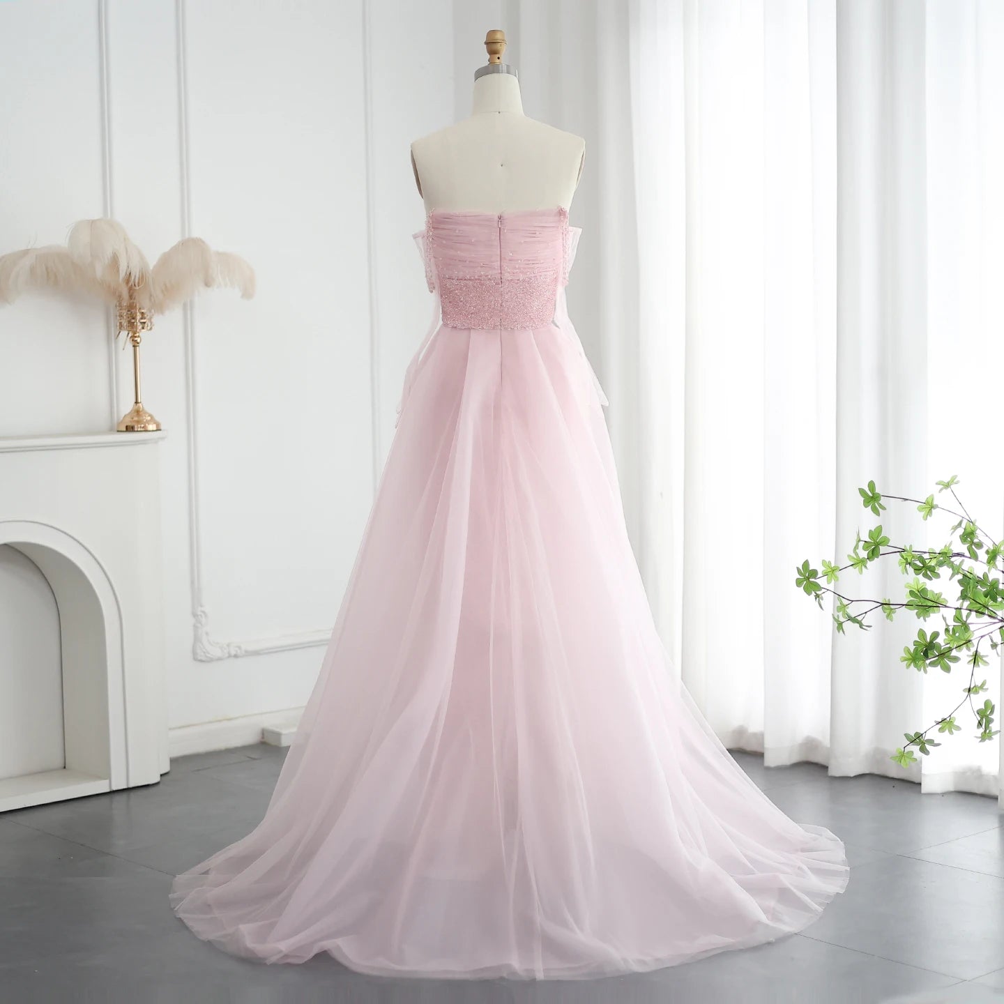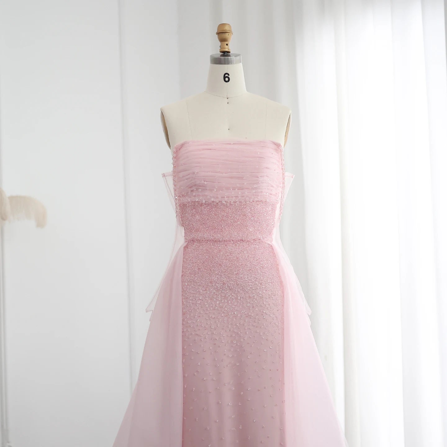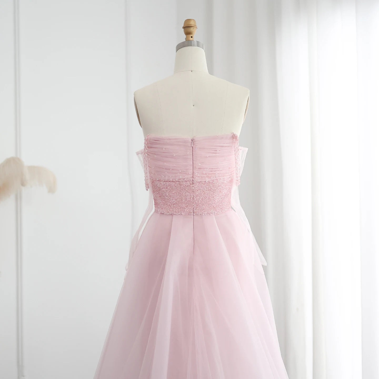 التنسيق المثالي: يُفضل تنسيقه مع مجوهرات لؤلؤية أو كريستالية، وتسريحة شعر مرفوعة أو مموجة بلطف، وحذاء بكعب وردي أو فضي لإكمال الإطلالة الحالمة.