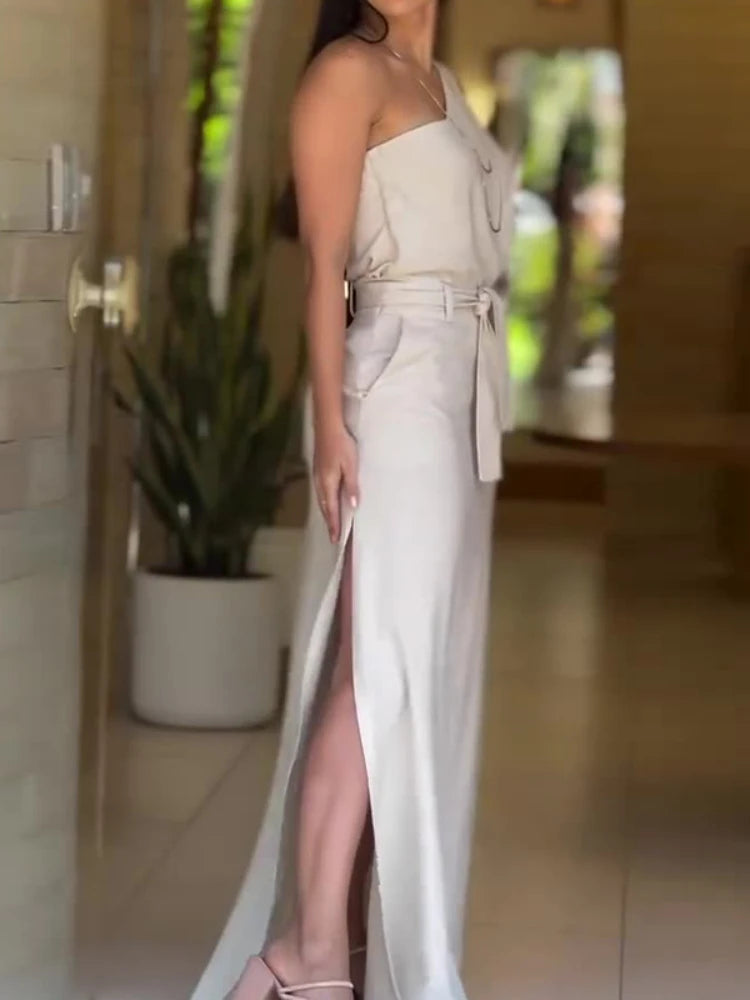 تيور من قطعتين بيج بتصميم عصري وحزام أنيق