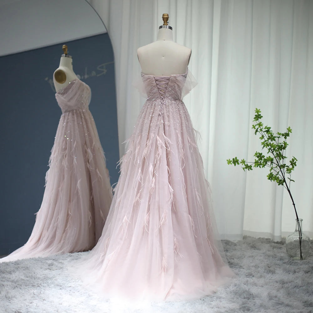 إطلالة ملكية تأسر القلوب مع هذا الفستان الوردي الفاخر المصمم بقصة منفوشة تضيف لمسة من الحلم والرومانسية. يتميز الفستان بصدرية على شكل قلب مزينة بتطريز فاخر من الترتر اللامع، بينما تنسدل طبقات التول الناعمة بانسيابية ساحرة ومزدانة بريش خفيف يمنح الإطلالة حيوية وأناقة ناعمة. الأكمام المنسدلة من التول الشفاف تضيف لمسة حالمة تعزز من فخامة التصميم.