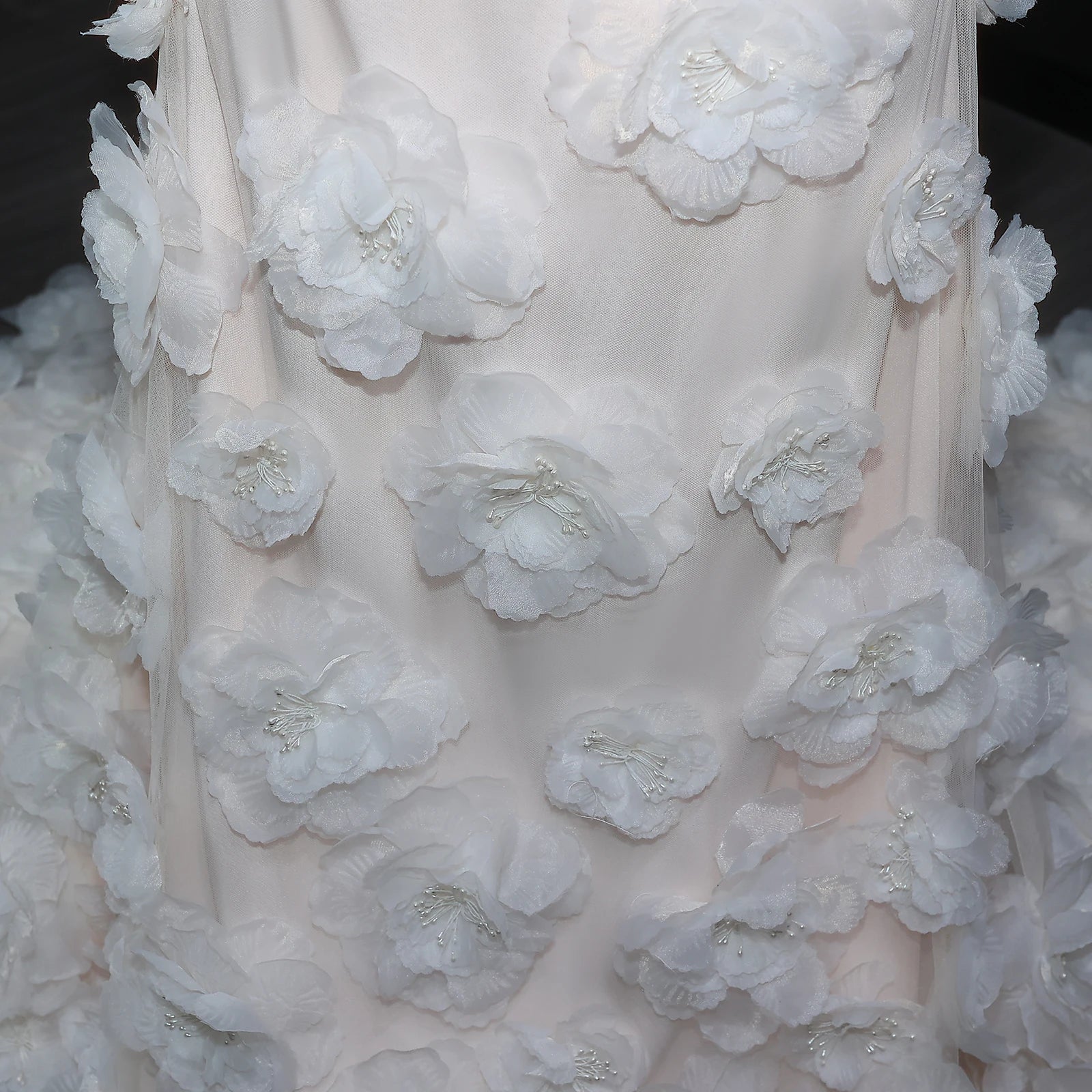 الورود المصنوعة بدقة وحرفية تزيّن الفستان من الأسفل إلى الذيل، مما يمنحه مظهراً نابضاً بالحياة ورومانسياً.