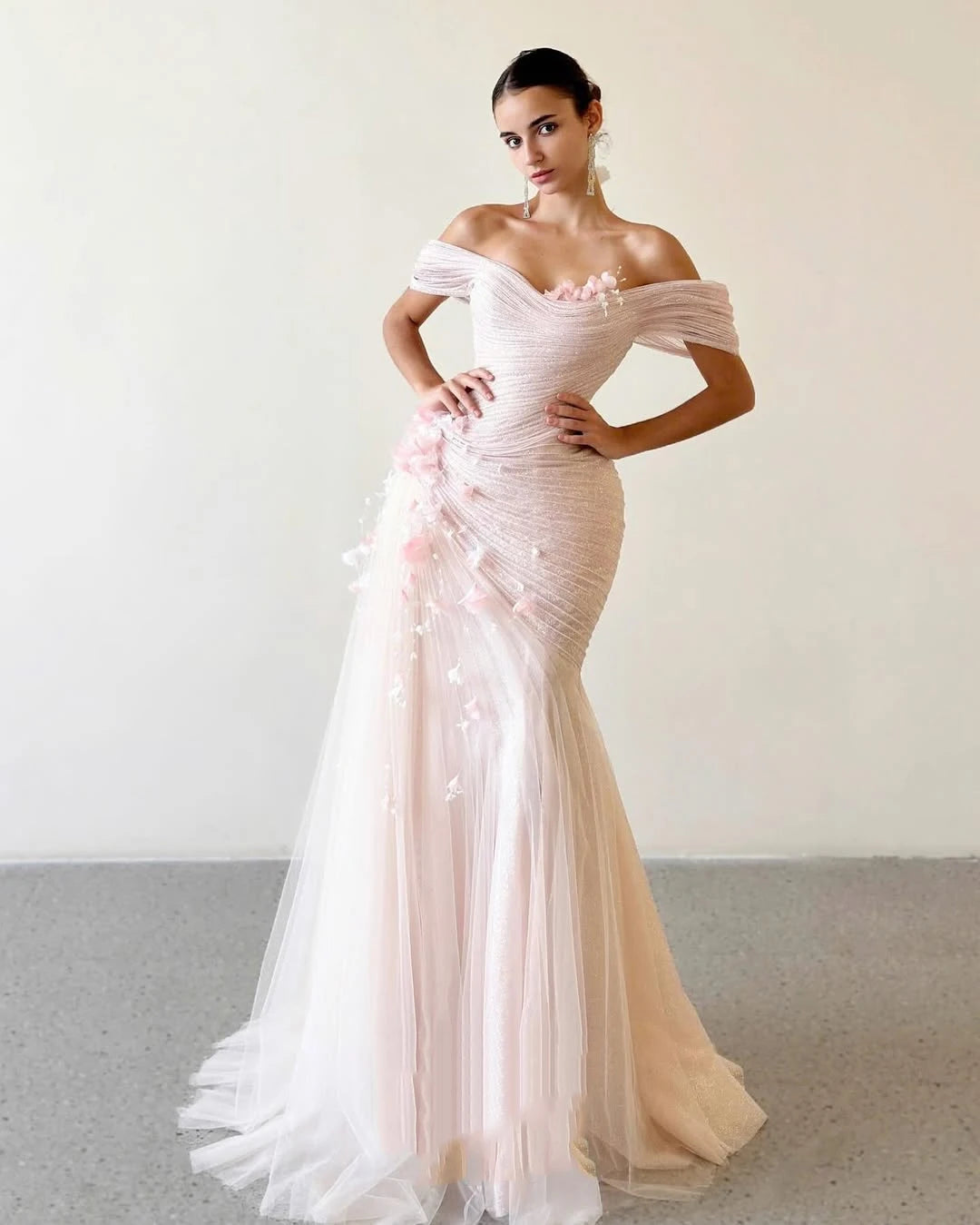 فستان أنيق يتميز بتصميمه الرائع الذي يجمع بين الأنوثة والرومانسية. يأتي بلون وردي فاتح، مع تفاصيل من الدانتيل والزهور الناعمة، مما يضيف لمسة من السحر. تتميز قصة الفستان الضيقة بتحديد الجسم بشكل جذاب، بينما تساهم الأكمام المكشوفة في إبراز الأكتاف بشكل أنيق. تفاصيل التول تُضفي جمالًا إضافيًا، مما يجعل الفستان خيارًا مثاليًا لمناسبات خاصة مثل حفلات الزفاف والسهرات الفاخرة. يمكن تنسيقه مع إكسسوارات بسيطة لإكمال الإطلالة الحالمة.