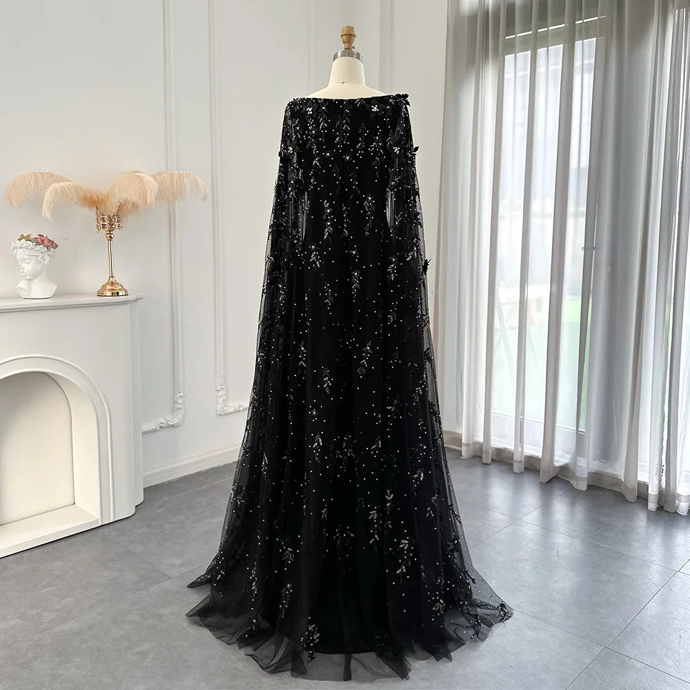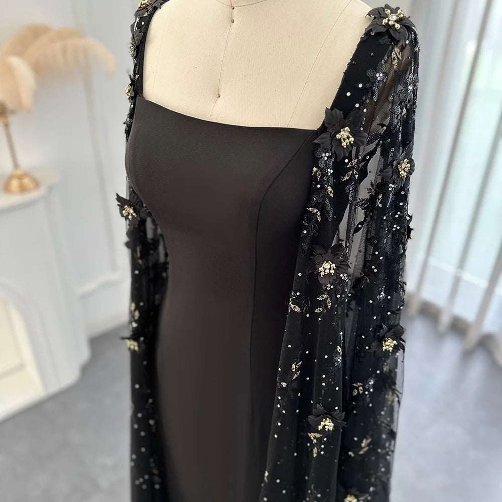 فستان سهرة أسود فخم بتصميم جذاب ينبض بالأناقة والفخامة. يتميز بقصة ضيقة تبرز جمال القوام، مع ذيل طويل من التول الشفاف ينسدل بانسيابية راقية. الأكمام تأتي على شكل كاب طويل مطرز بالكامل، مما يمنح الإطلالة لمسة درامية ساحرة تلفت الأنظار في كل مناسبة.