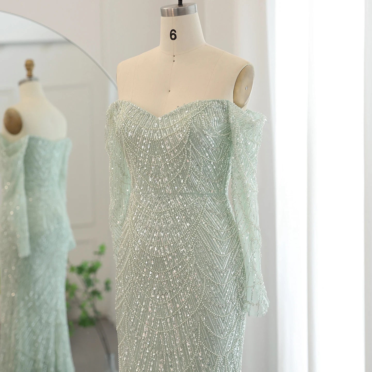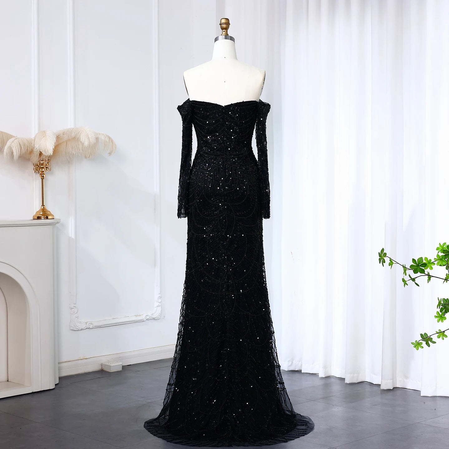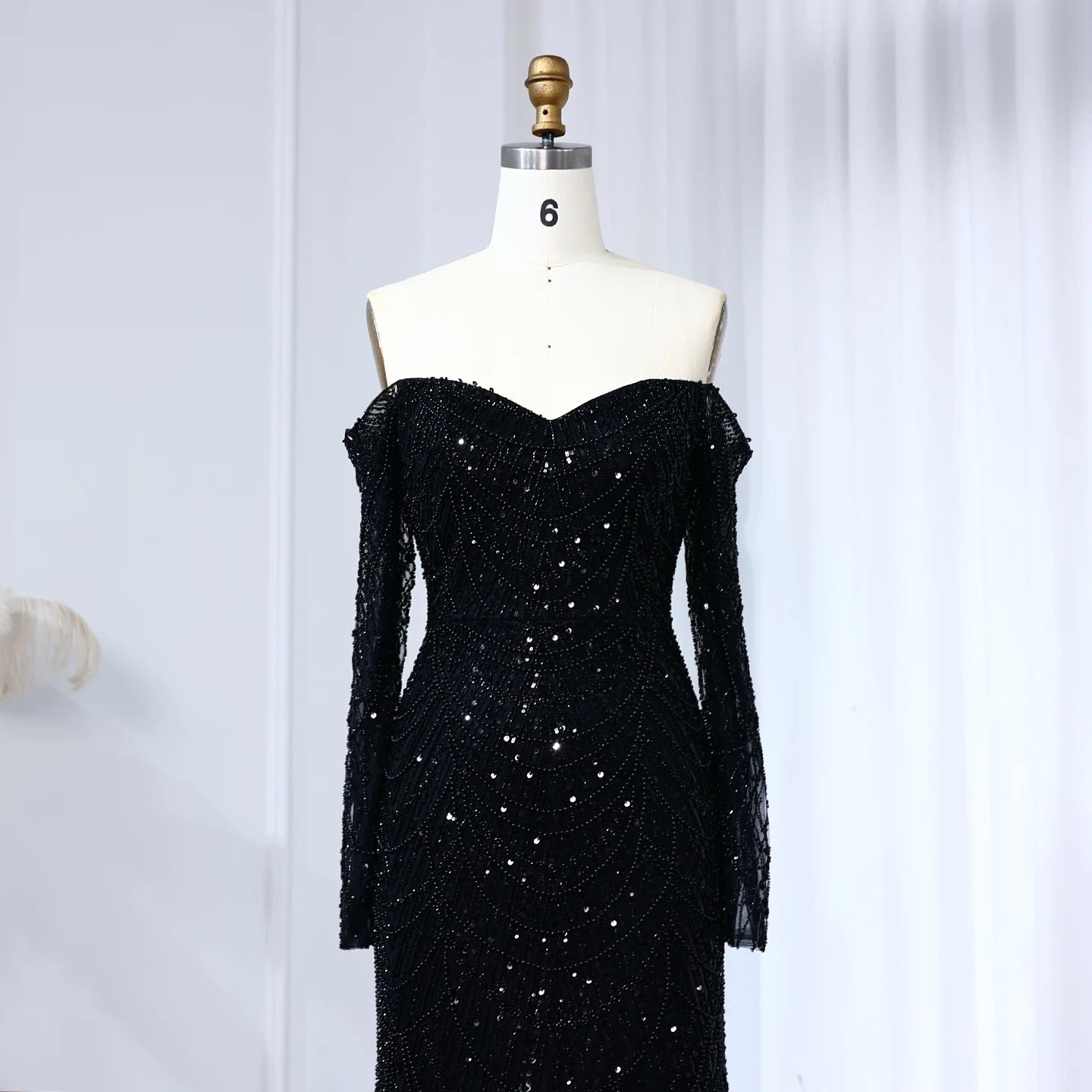 فستان سهرة أسود فخم بترتر لامع وتصميم كتف ساقط أنيق