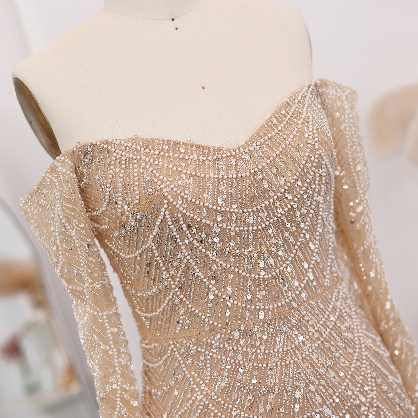 الترتر والخرز المتناثر على كامل الفستان يخلق تأثيرًا بصريًا فاخرًا يعكس الضوء بشكل ساحر، ما يضيف لمسة درامية فريدة.