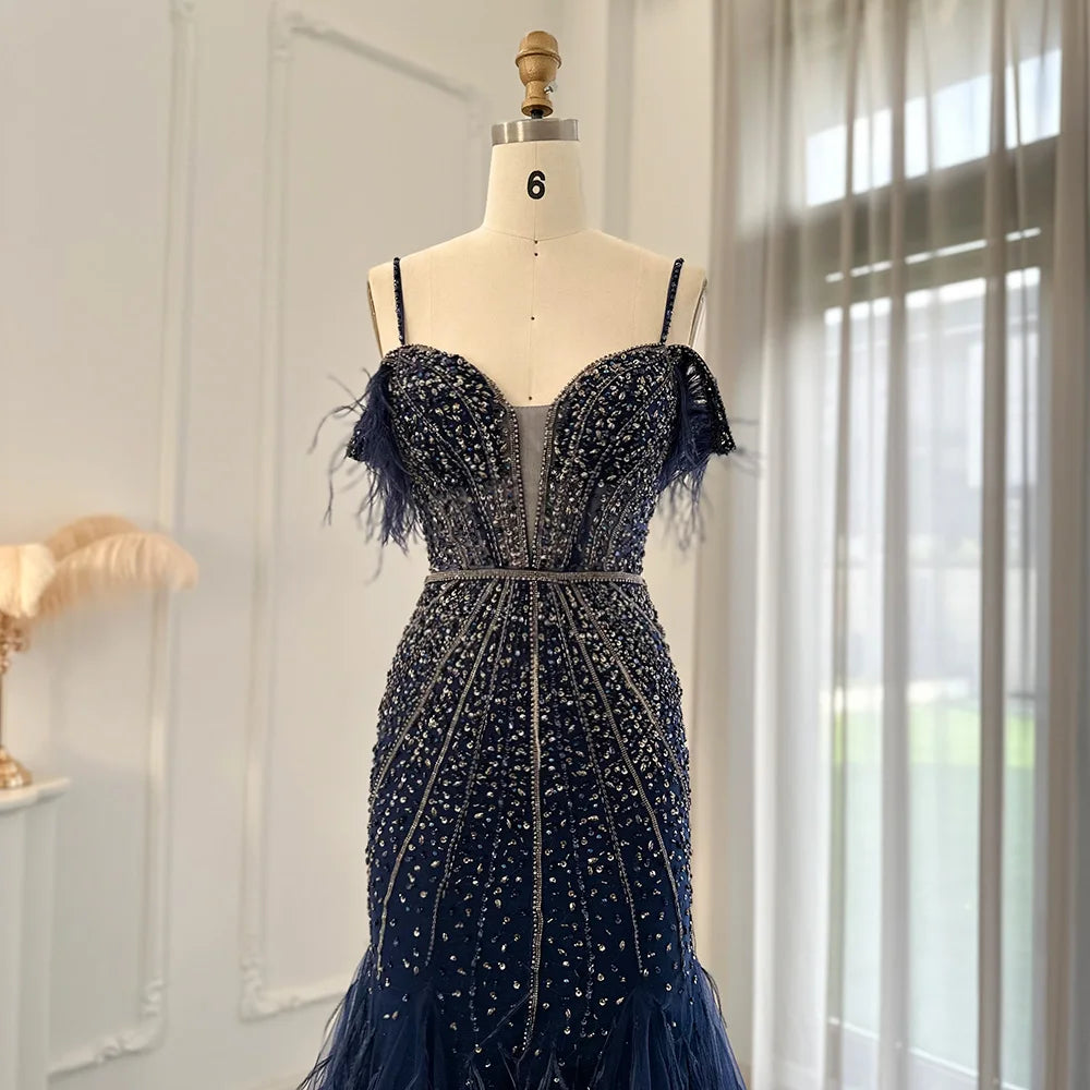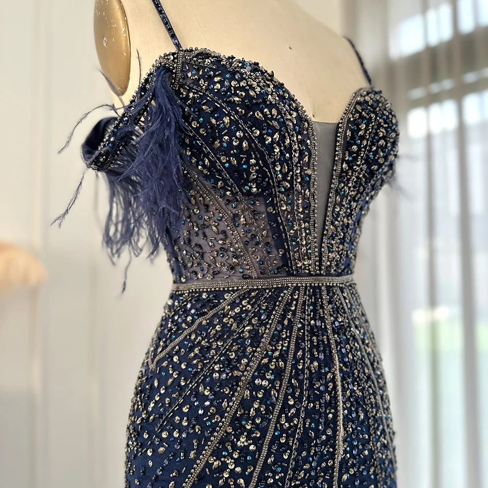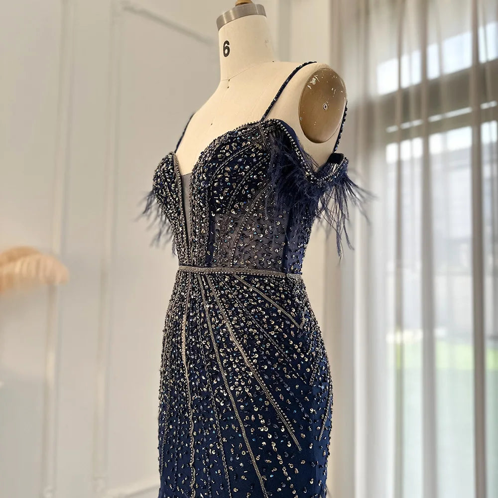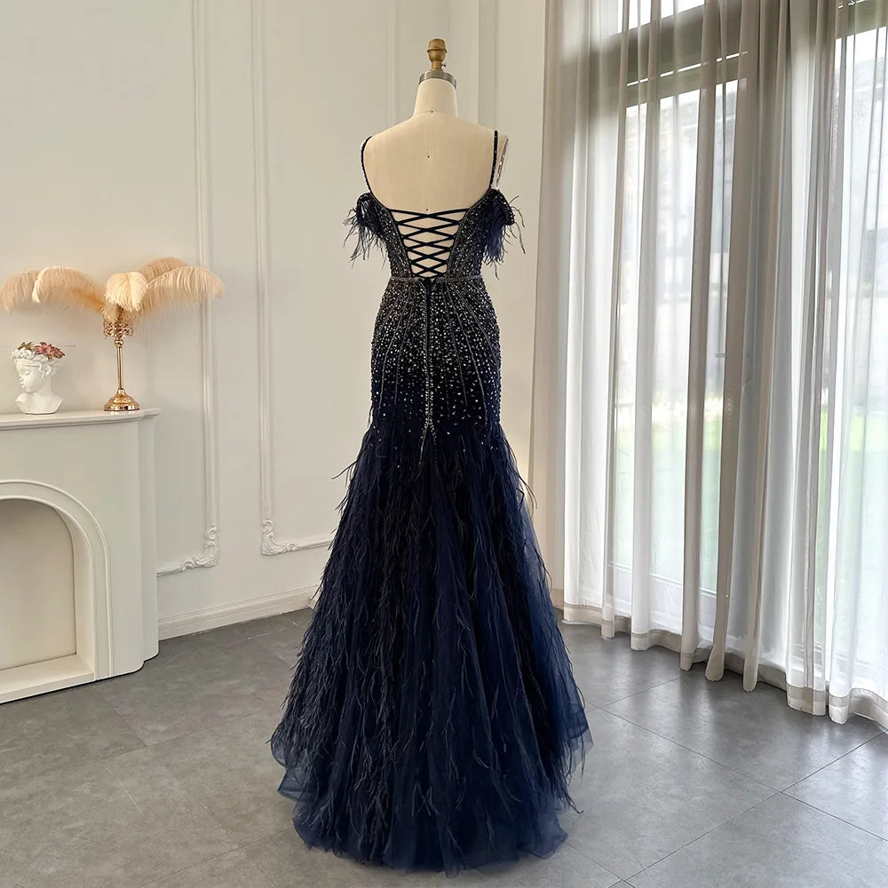 فستان سهرة راقٍ بترصيع فاخر وتفاصيل الريش الانسيابية