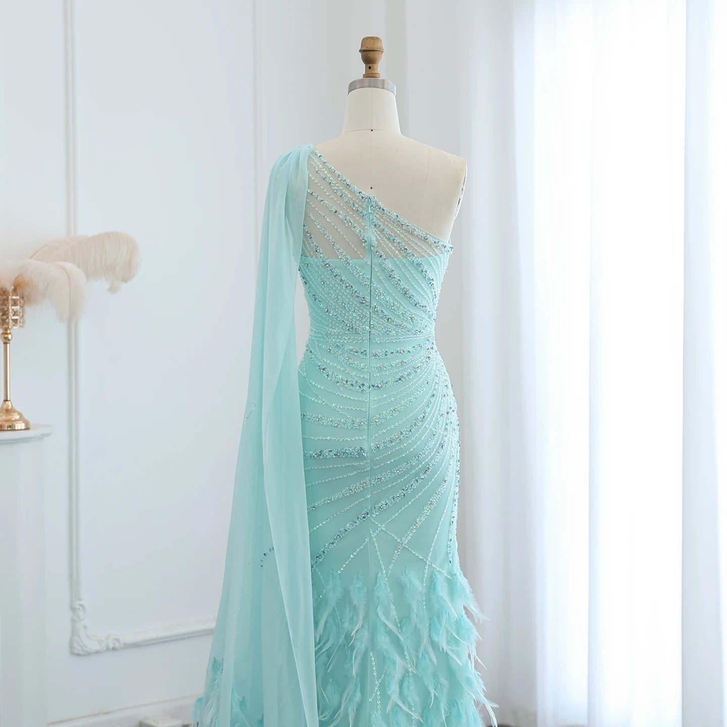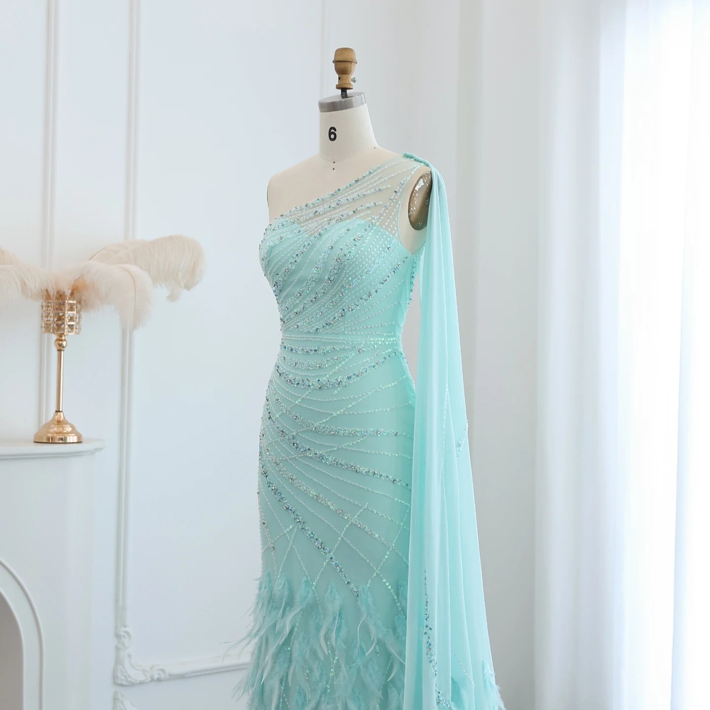 فستان سهرة فاخر بلون الأخضر الباستيل مع ريش وشال طويل