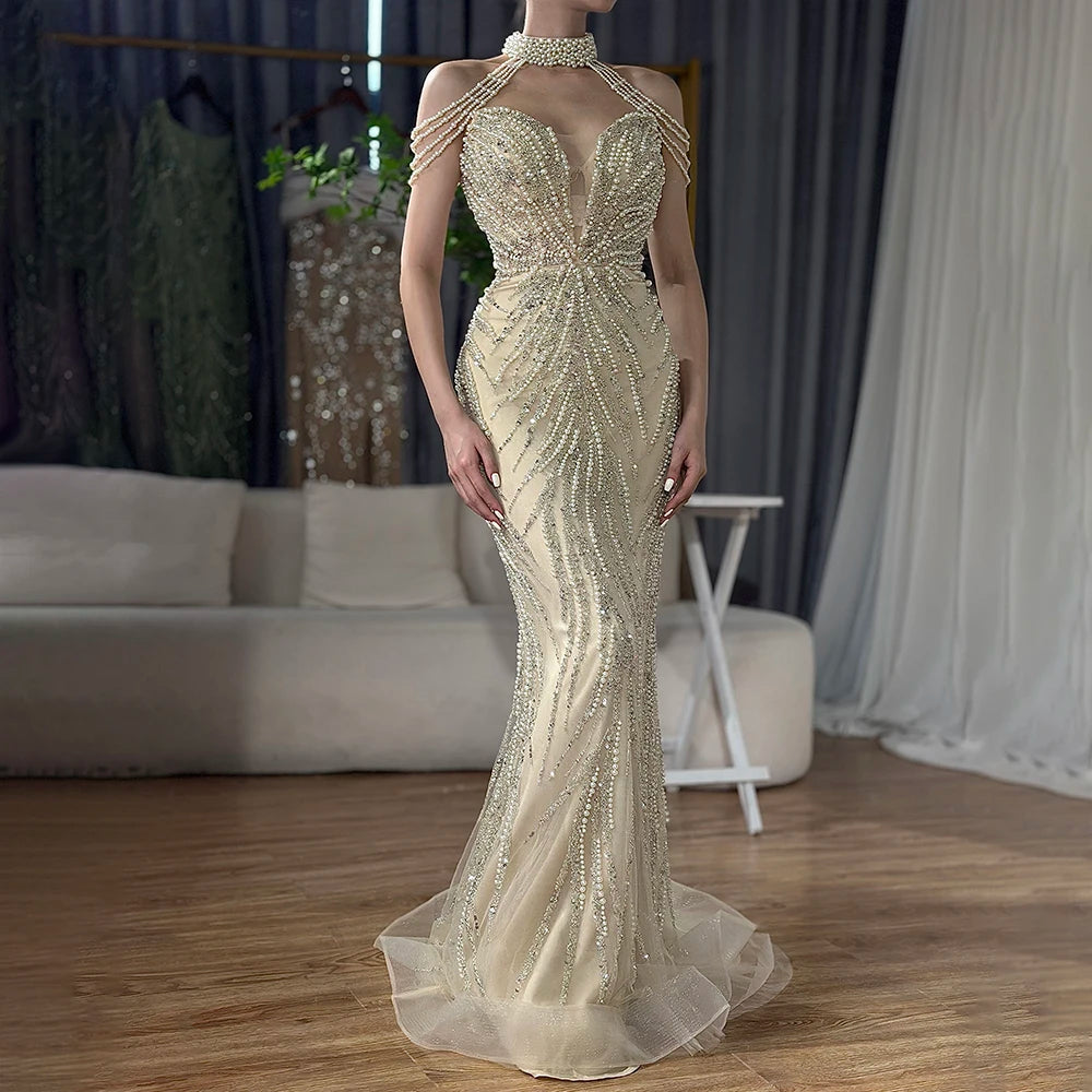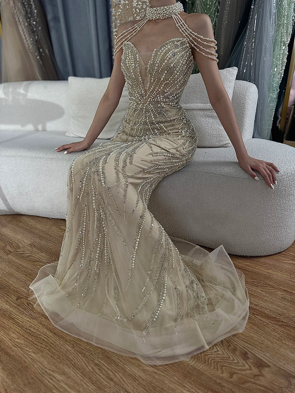 هذا الفستان يتميز بتصميم ضيق يبرز منحنيات الجسم بطريقة أنيقة. يزخر بالتفاصيل اللامعة التي تتوزع بشكل فني، مما يخلق تأثيرًا بصريًا جذابًا. اللون المحايد يجعله مناسبًا لمناسبات متنوعة، من حفلات السهرة إلى حفلات الزفاف. الأكتاف المفتوحة تعكس لمسة من الجرأة والأناقة، مما يجعله خيارًا مثاليًا لمن تبحث عن إطلالة مميزة وراقية. القماش الناعم يضمن الراحة أثناء الارتداء، مما يجعله فستانًا جميلًا يناسب مختلف الأذواق