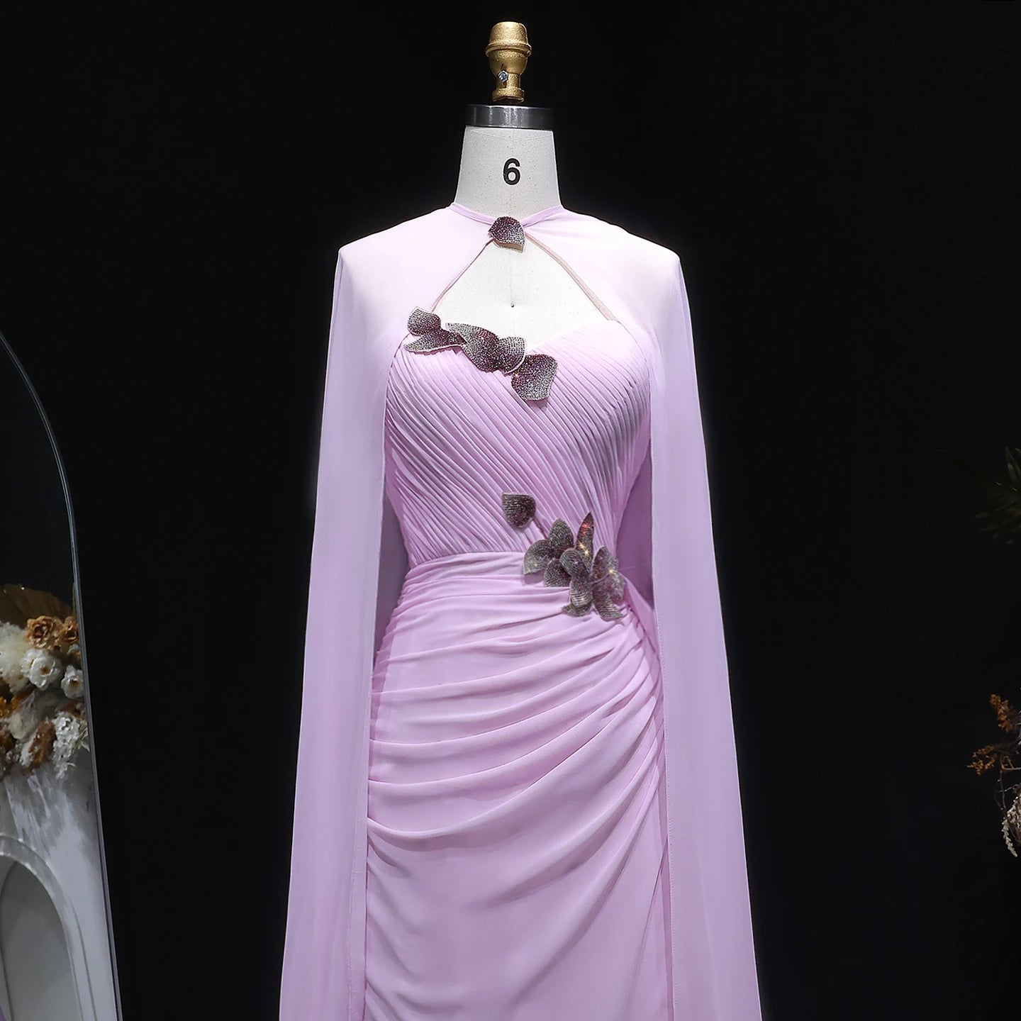 لون وردي ناعم يعكس الرقي، تصميم بكتف واحد مع كاب شفاف طويل، وتفاصيل مزينة بلمسات فاخرة تضيف طابعًا ملكيًا مميزًا.