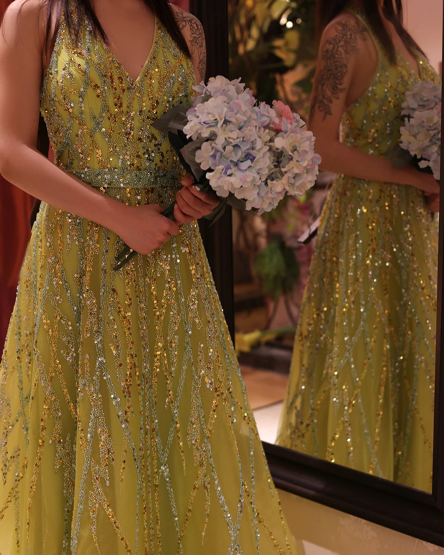 التطريز المتناثر على الفستان يشبه قطرات المطر اللامعة، ويزيد من فخامته ولمعانه بأسلوب أنيق يخطف الأنظار.