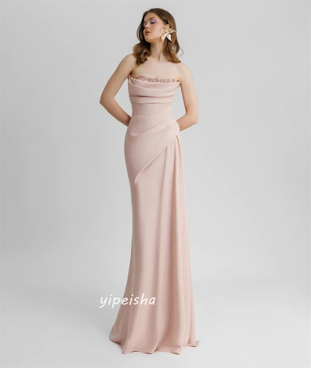 تألّقي بإطلالة فاخرة تنطق بالأنوثة مع هذا الفستان الساحر المصمم بقصّة حورية جذابة وبألوان ناعمة تخطف الأنظار. يتميز الفستان بقماش ينسدل بانسيابية أنيقة ويبرز تفاصيل الجسم بنعومة، مع تصميم بدون أكتاف يمنحك طابعاً أنثوياً راقياً.