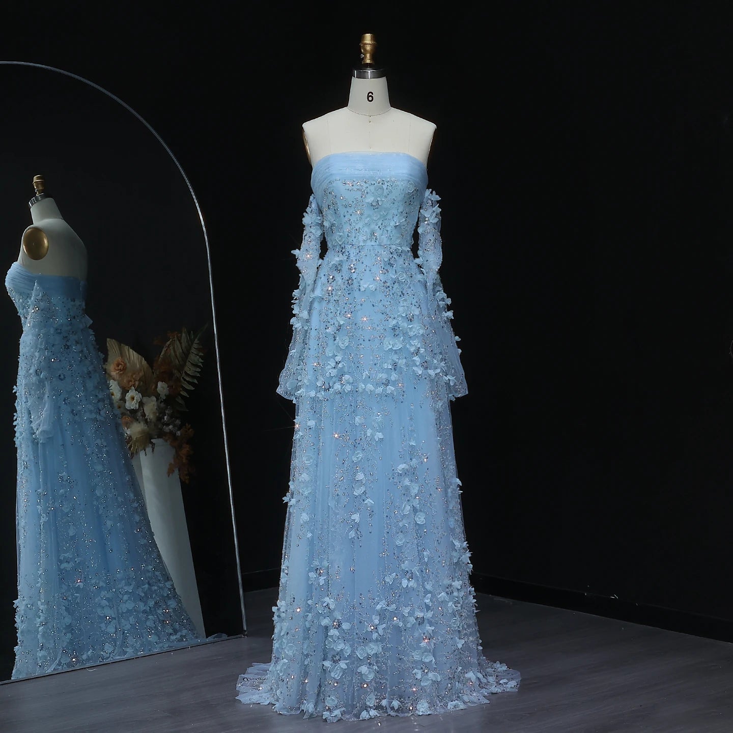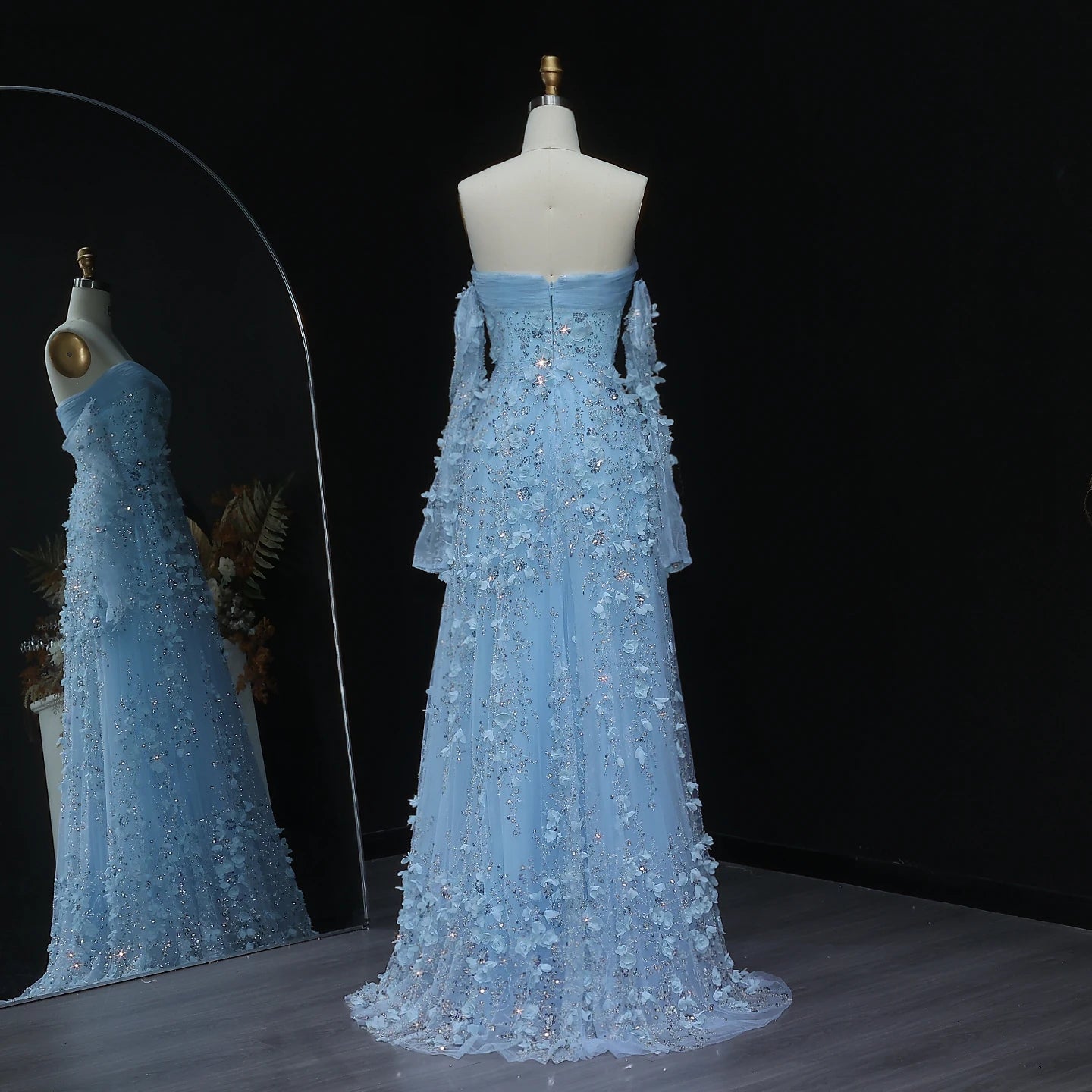 فستان وردي ملكي يخطف الأنظار بتصميمه الراقي وكابه الطويل اللي ينسدل من الكتفين بكل فخامة. مصنوع من قماش التل الفاخر المزدان بتطريز ثلاثي الأبعاد من الورود والفراشات الصغيرة، مع لمسات ناعمة من الخرز اللامع اللي تضيف بريق أنثوي ساحر. القصة بدون أكتاف مع أكمام شفافة من التل تعطي لمسة رقيقة وفاخرة.