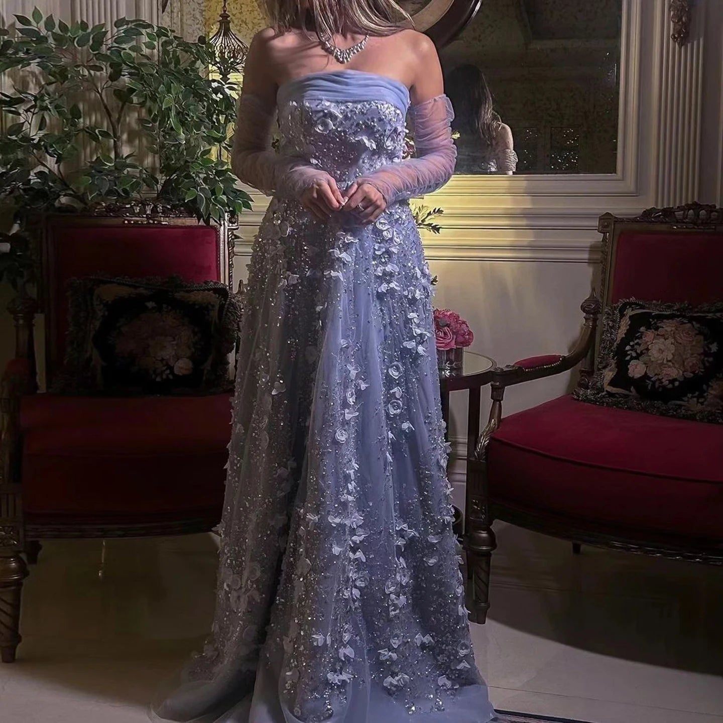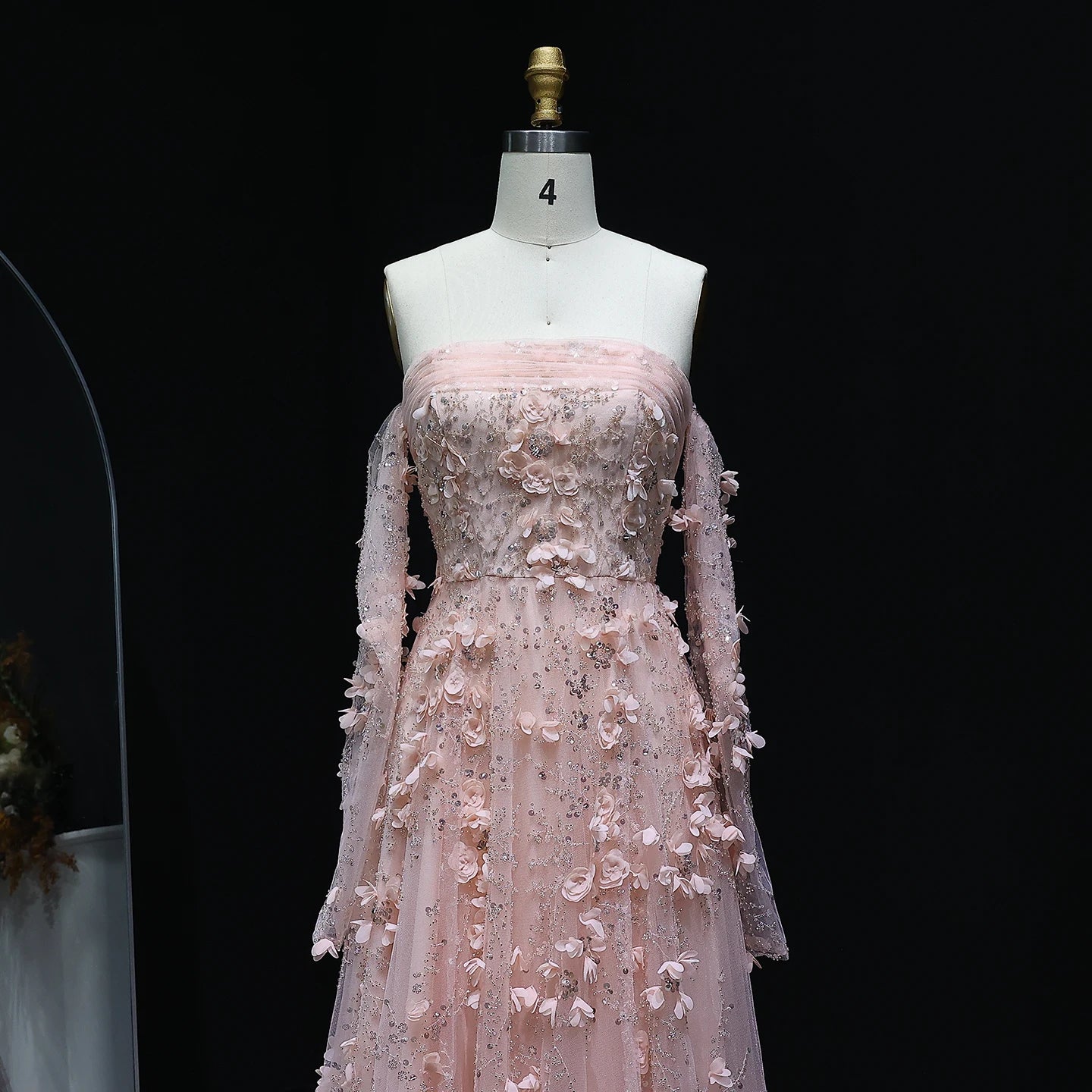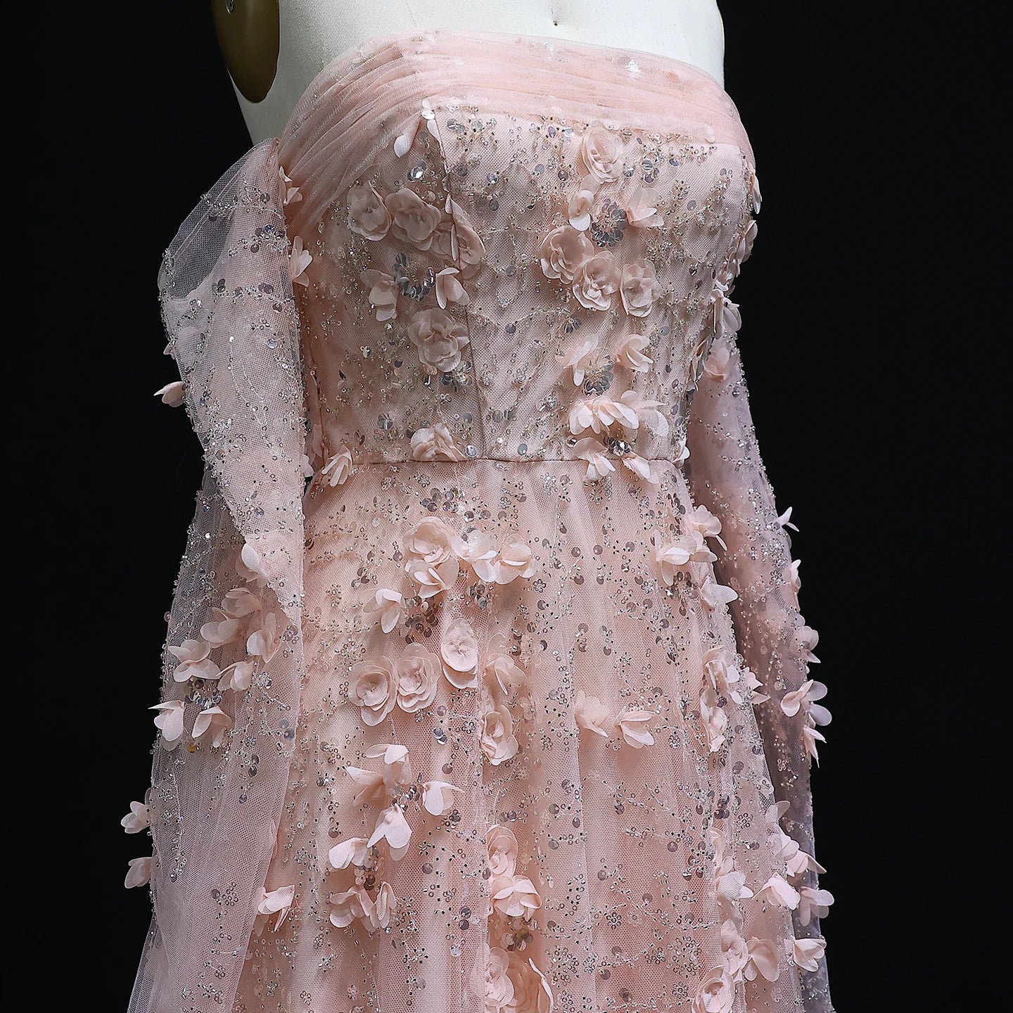 فستان وردي ملكي بتطريز فاخر وأكمام تول ساحرة