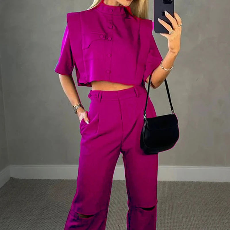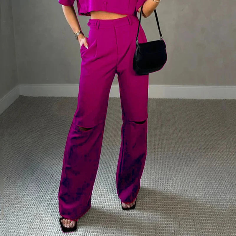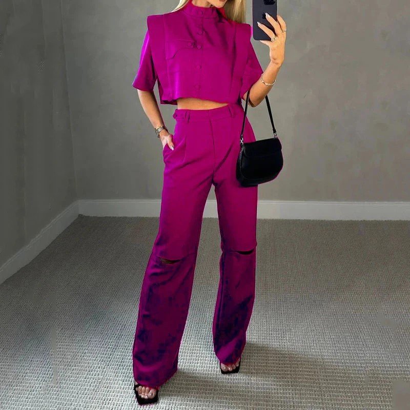 إطلالة جريئة باللون الأرجواني: بلوزة قصيرة وبنطلون بخصر مرتفع