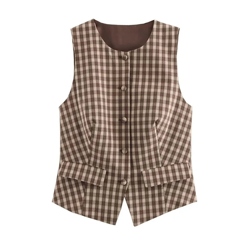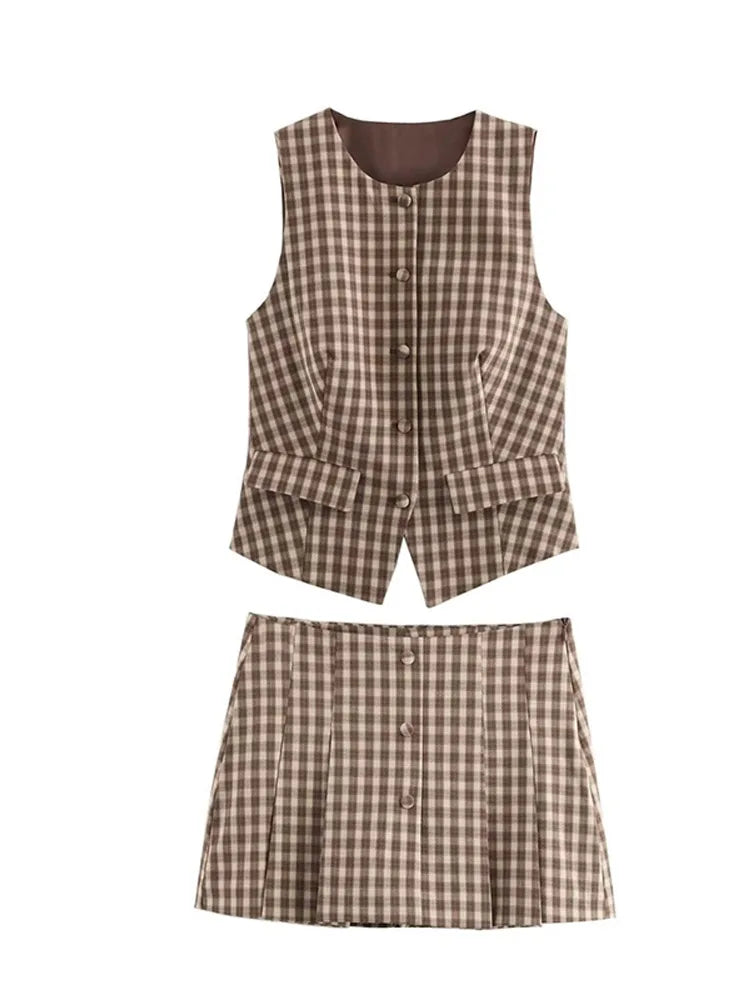 طقم أنيق من سترة منقوشة باللون البني وتنورة قصيرة