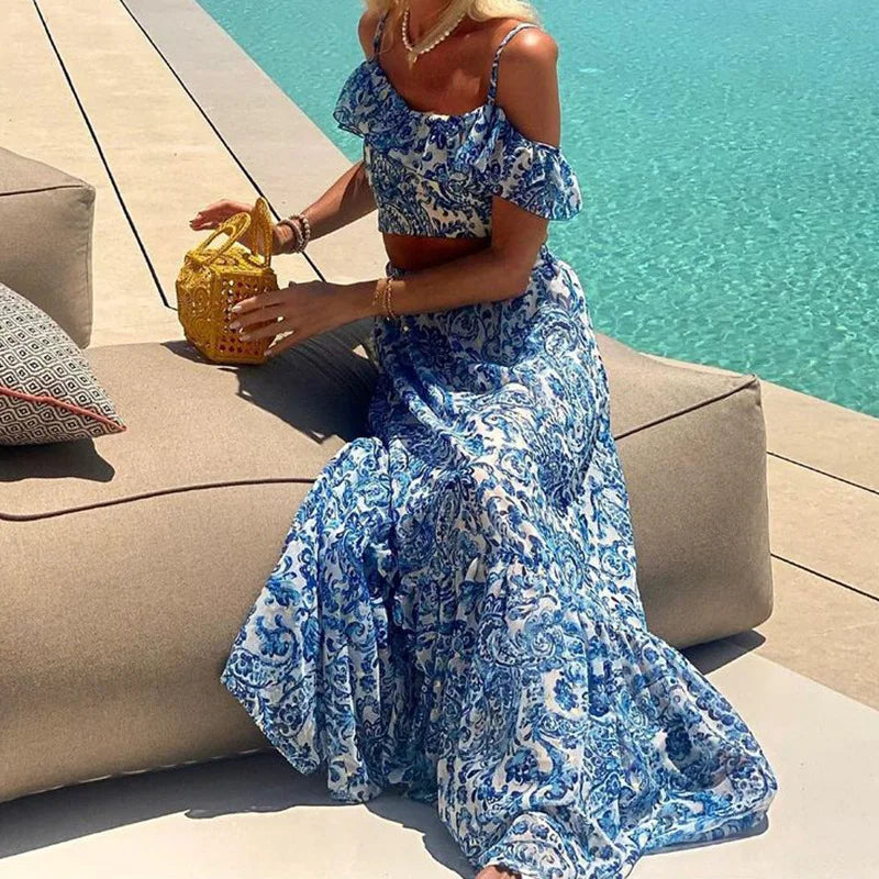 أسلوب صيفي أنيق: طقم مكون من قطعتين بنقشة بيزلي باللون الأزرق بجانب المسبح