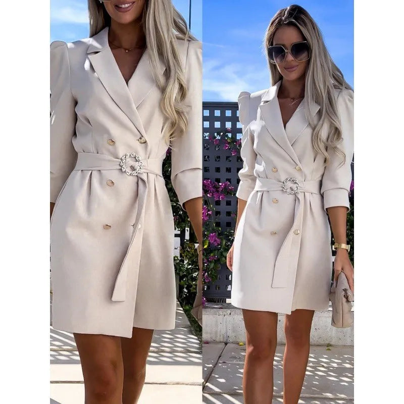 فستان جاكيت بدلة بأزرار مزدوجة الصدر وحزام وفتحة رقبة على شكل حرف V