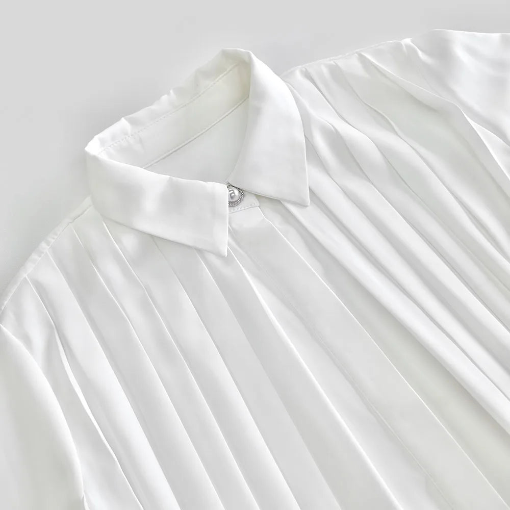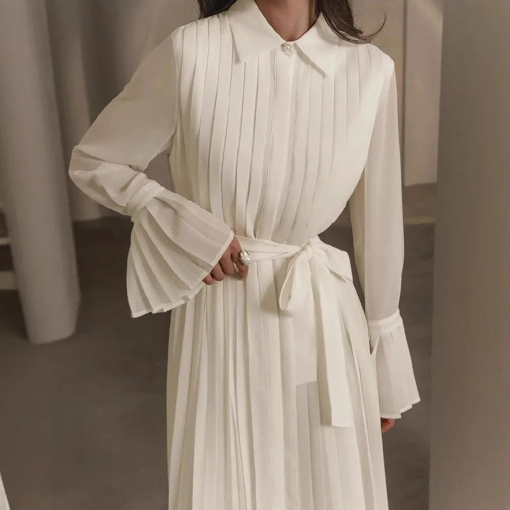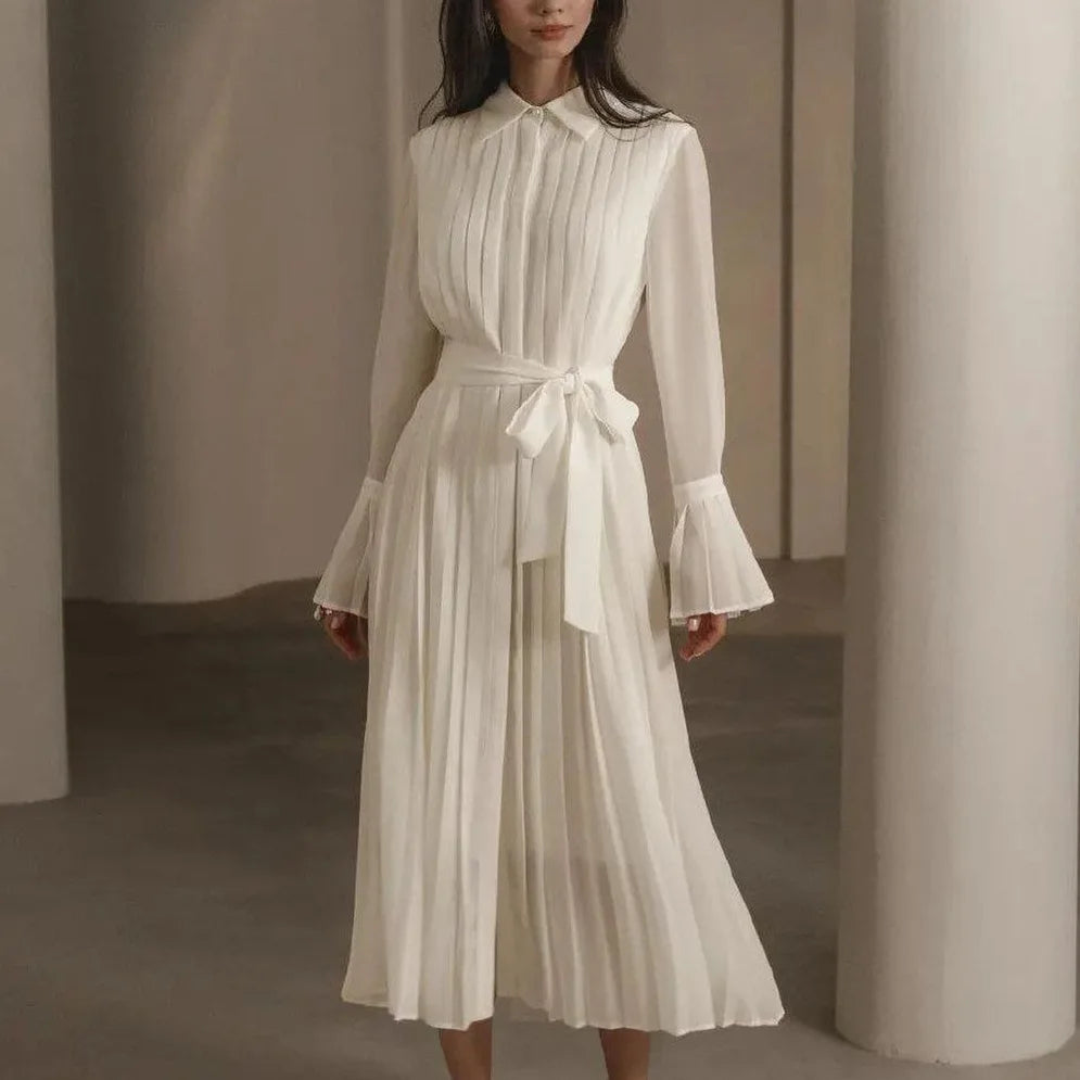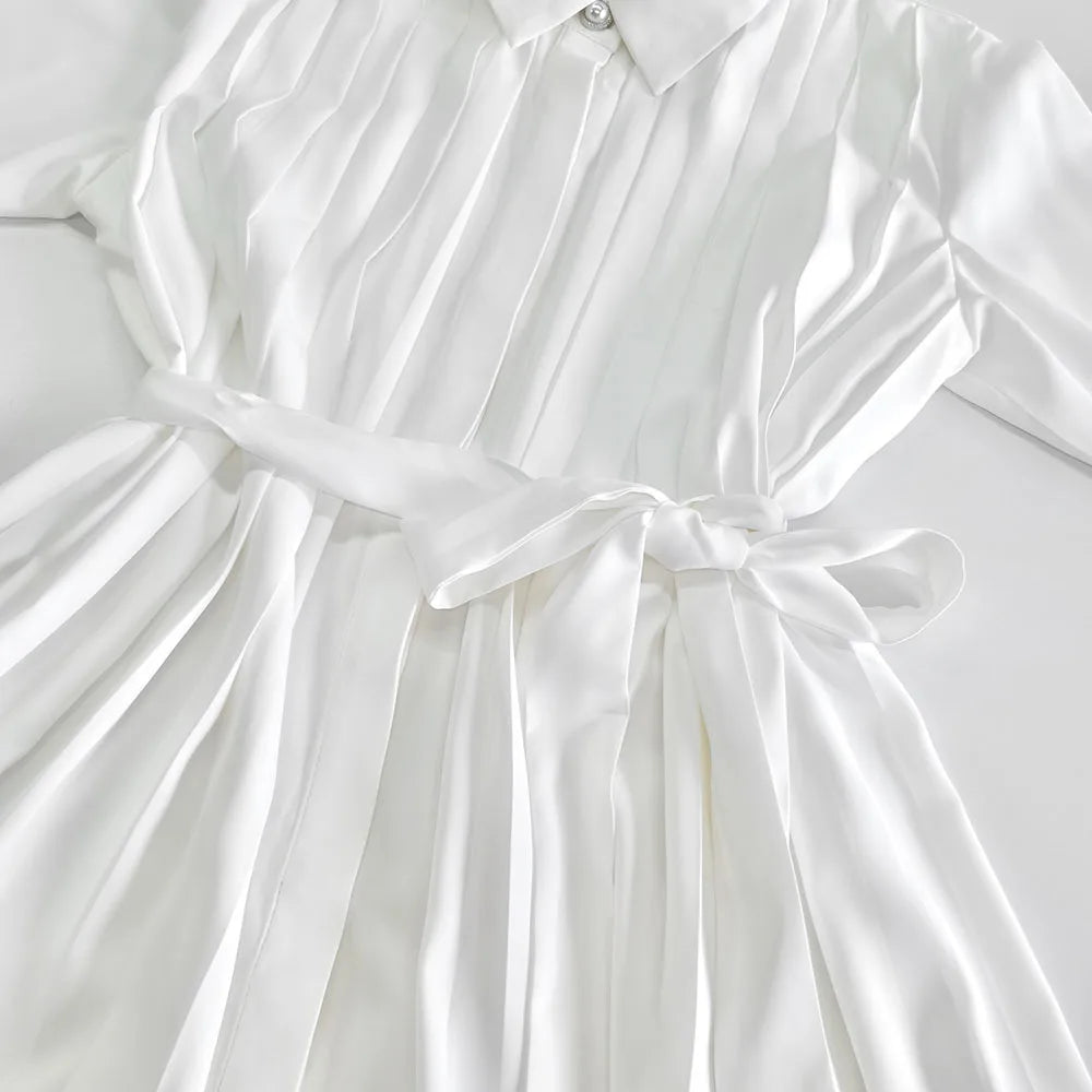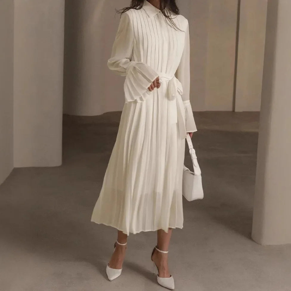 فستان ميدي أبيض مطوي بأكمام واسعة